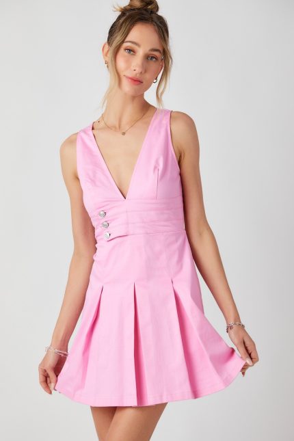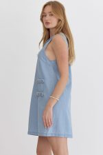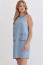 Denim round neck sleeveless mini dress featuring braid detailing.