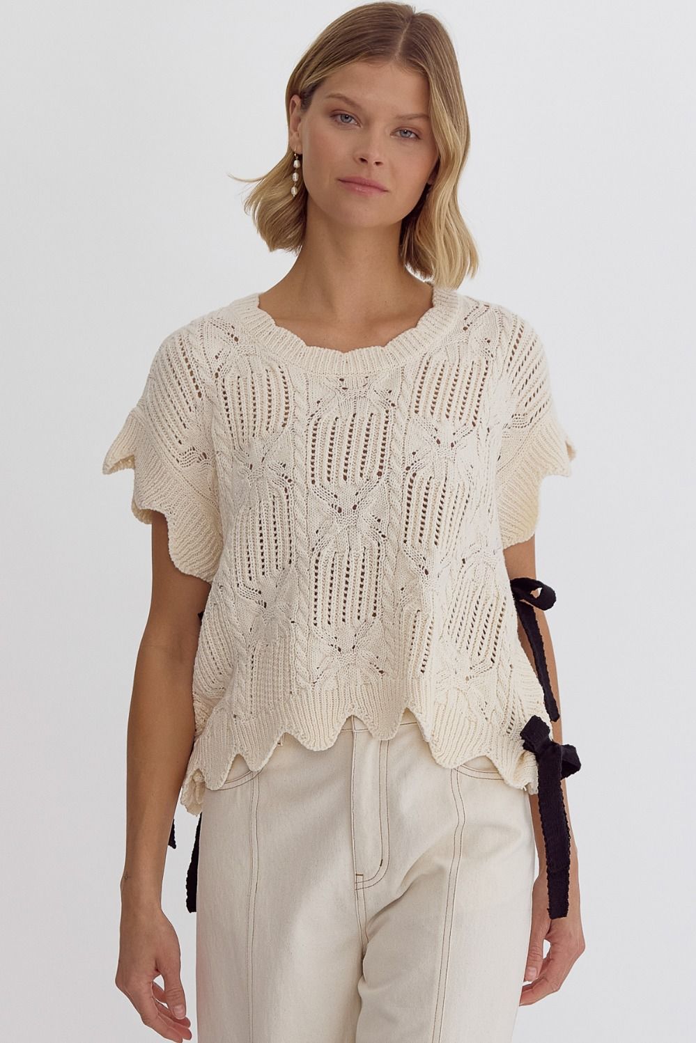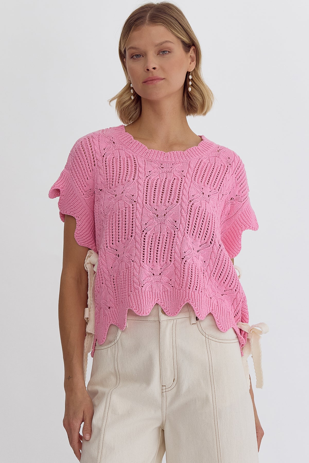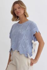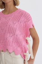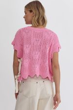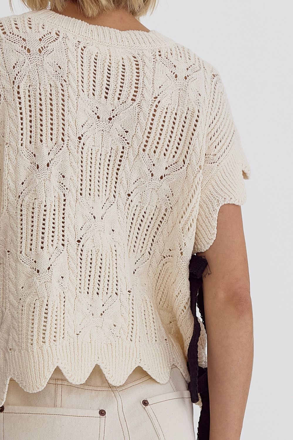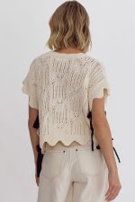 Crochet knit short sleeve crop top featuring scalloped hem.