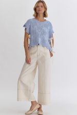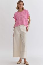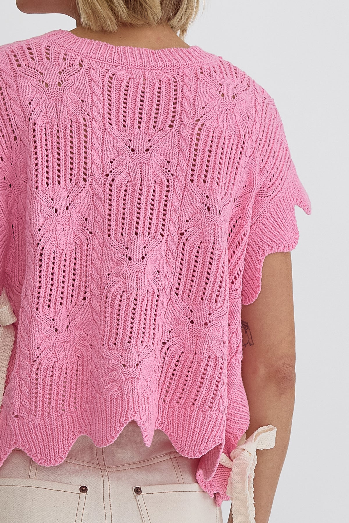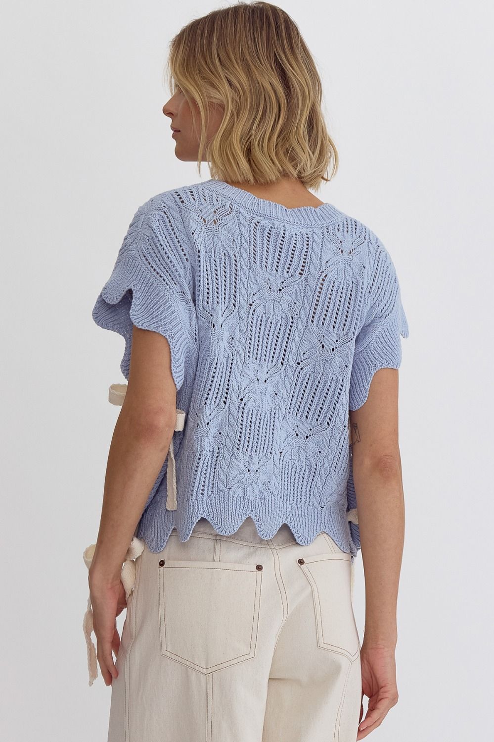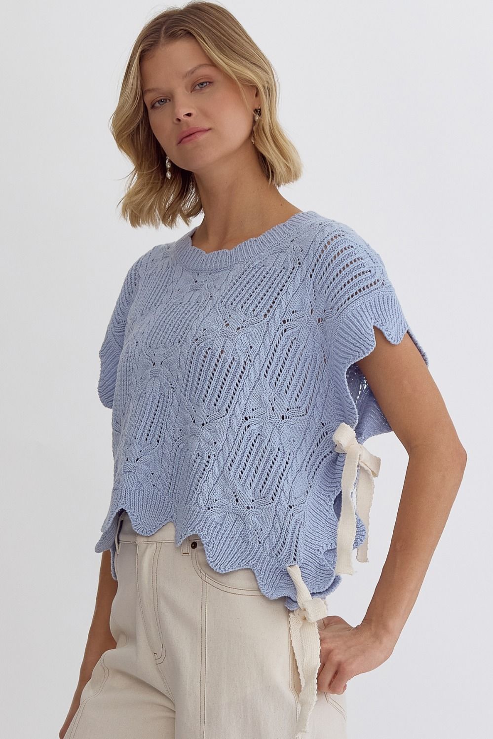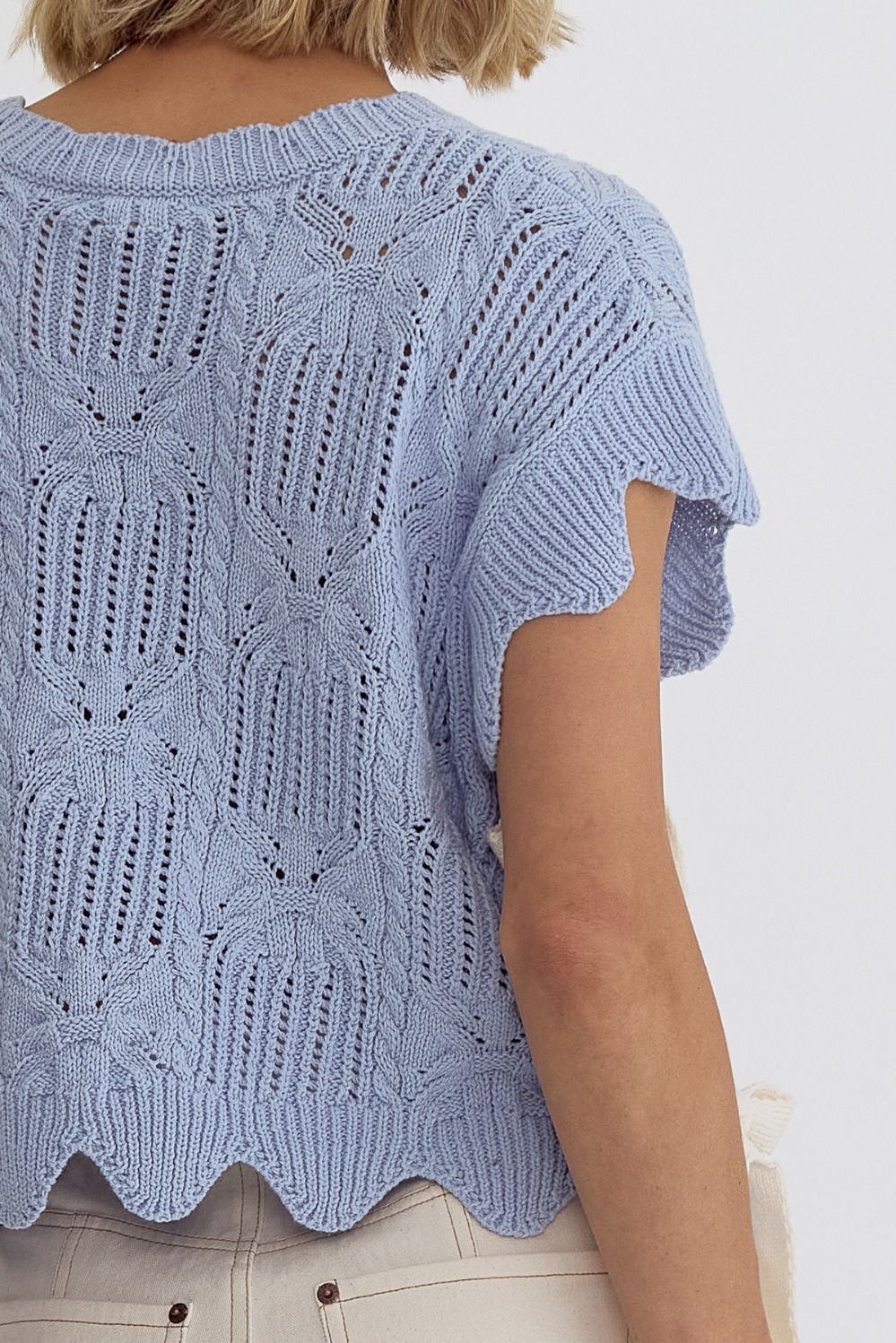 Crochet knit short sleeve crop top featuring scalloped hem.
