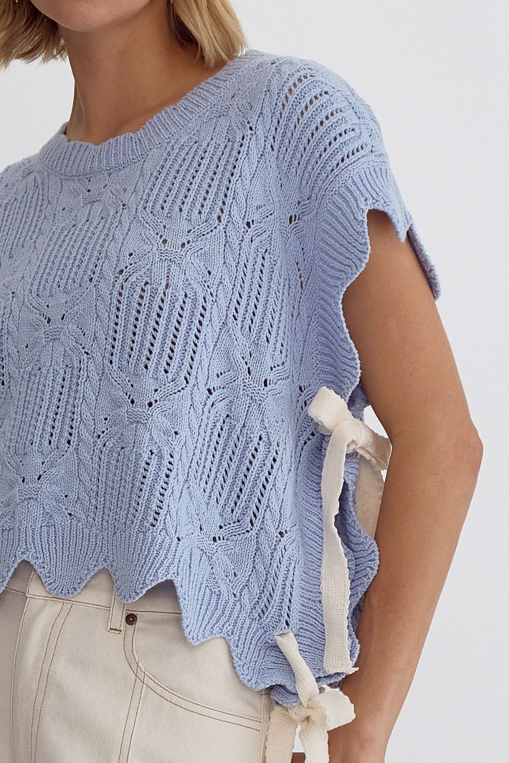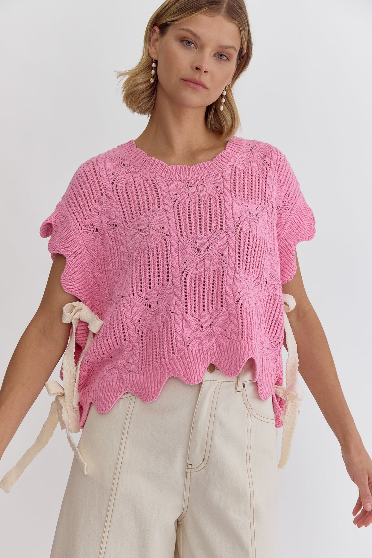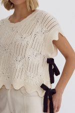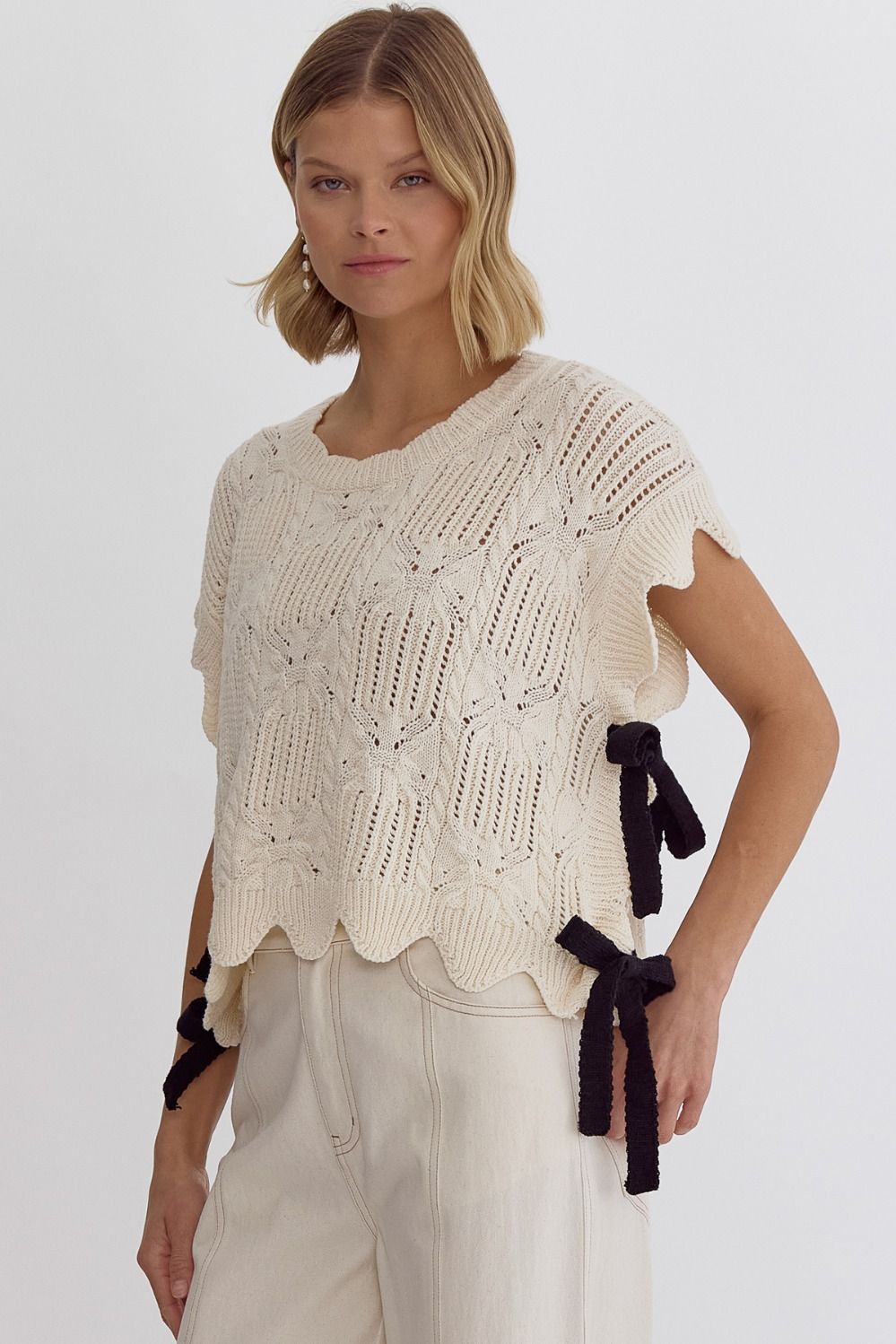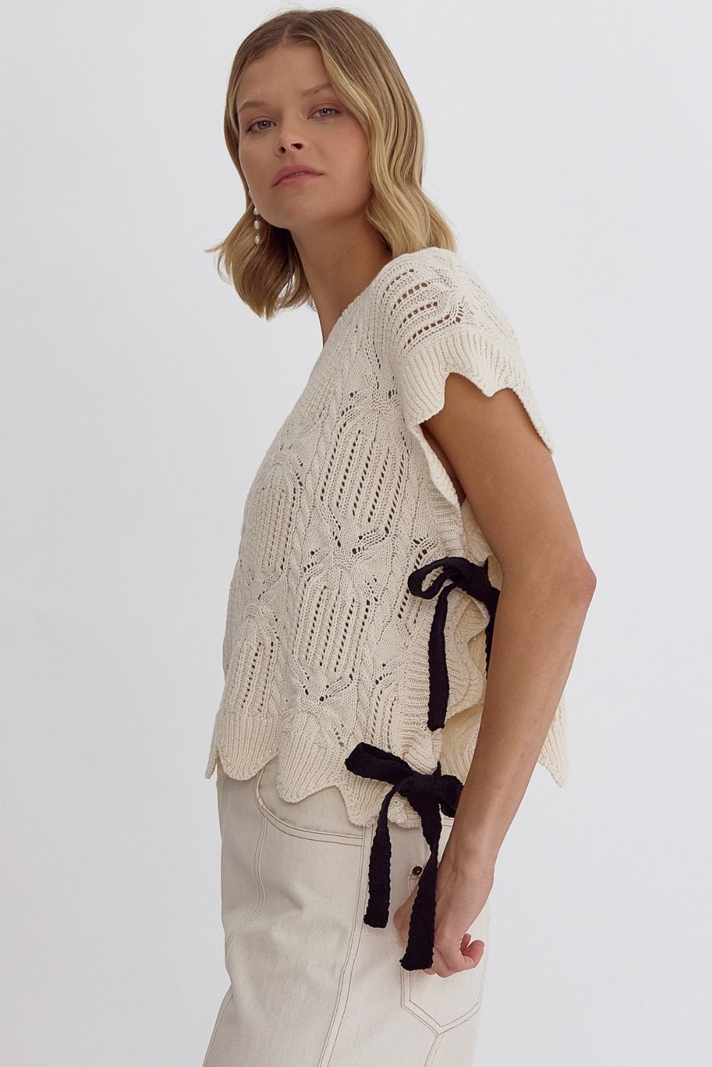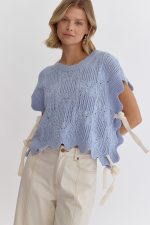 Elevate your style with our high-end oversized knit sweater. Crafted from a lightweight ribbed knit material, this sweater features a crew neck sleeveless with amazing side detail to top off this perfect look the self tie fabric on the sides to make this your dream top!
