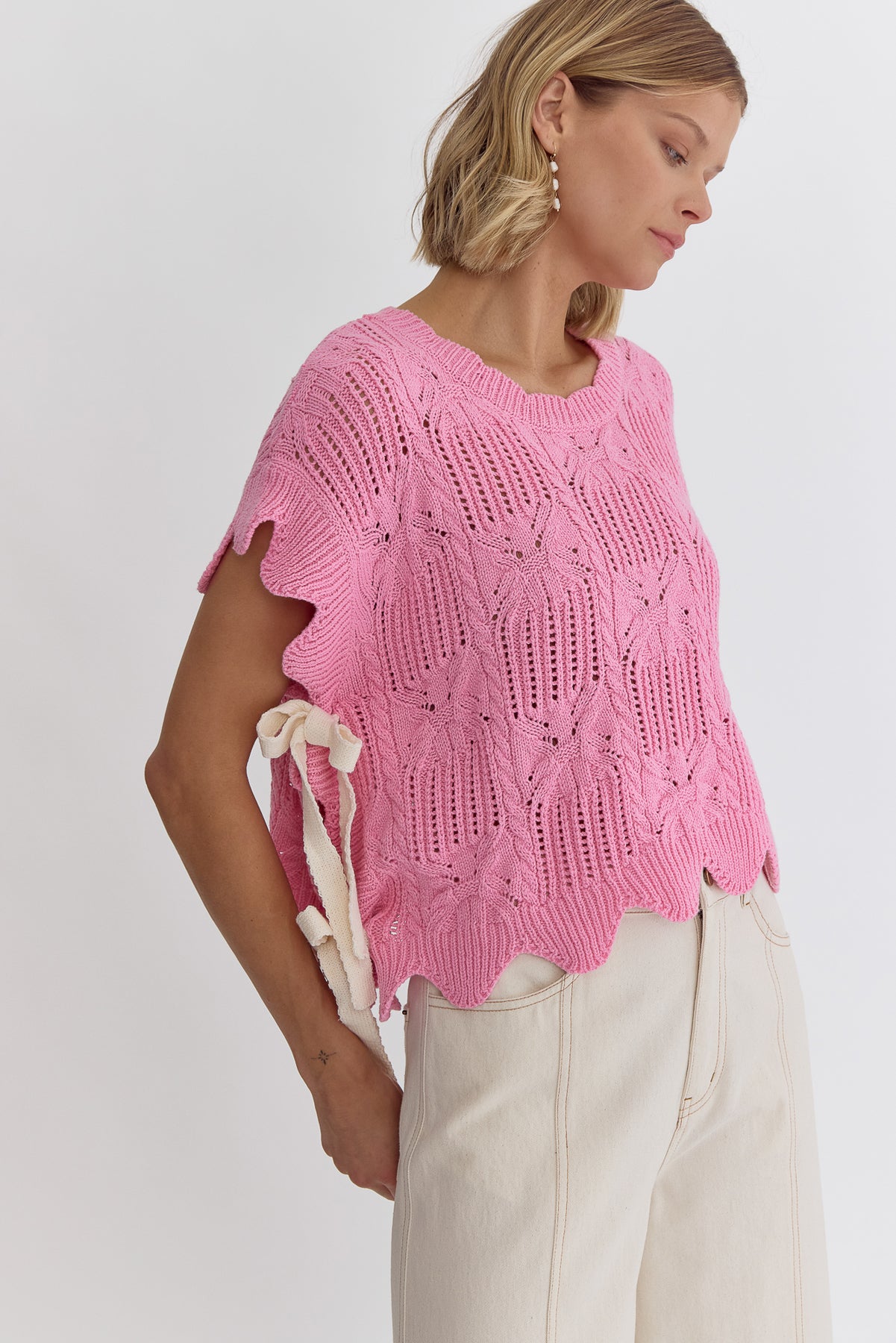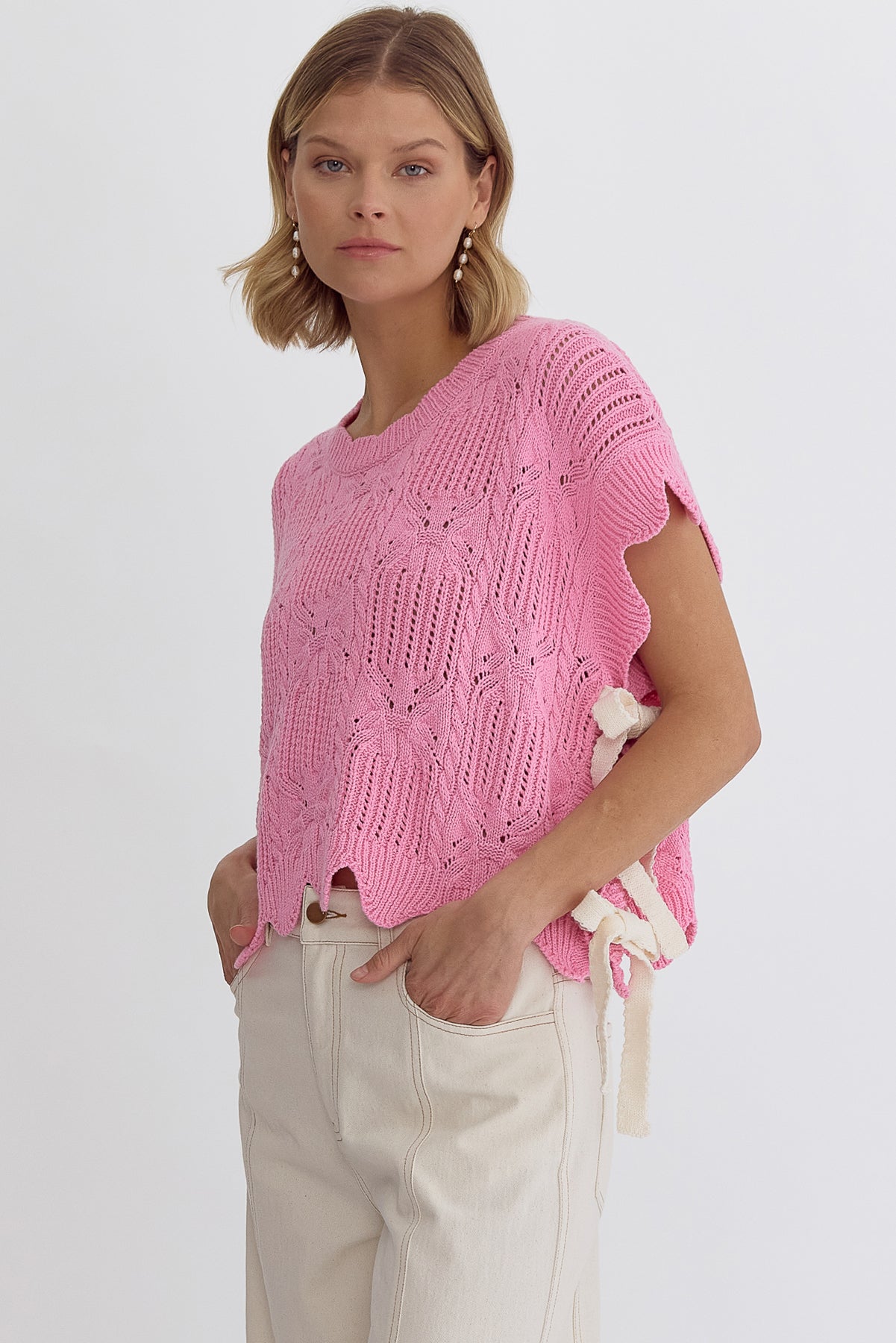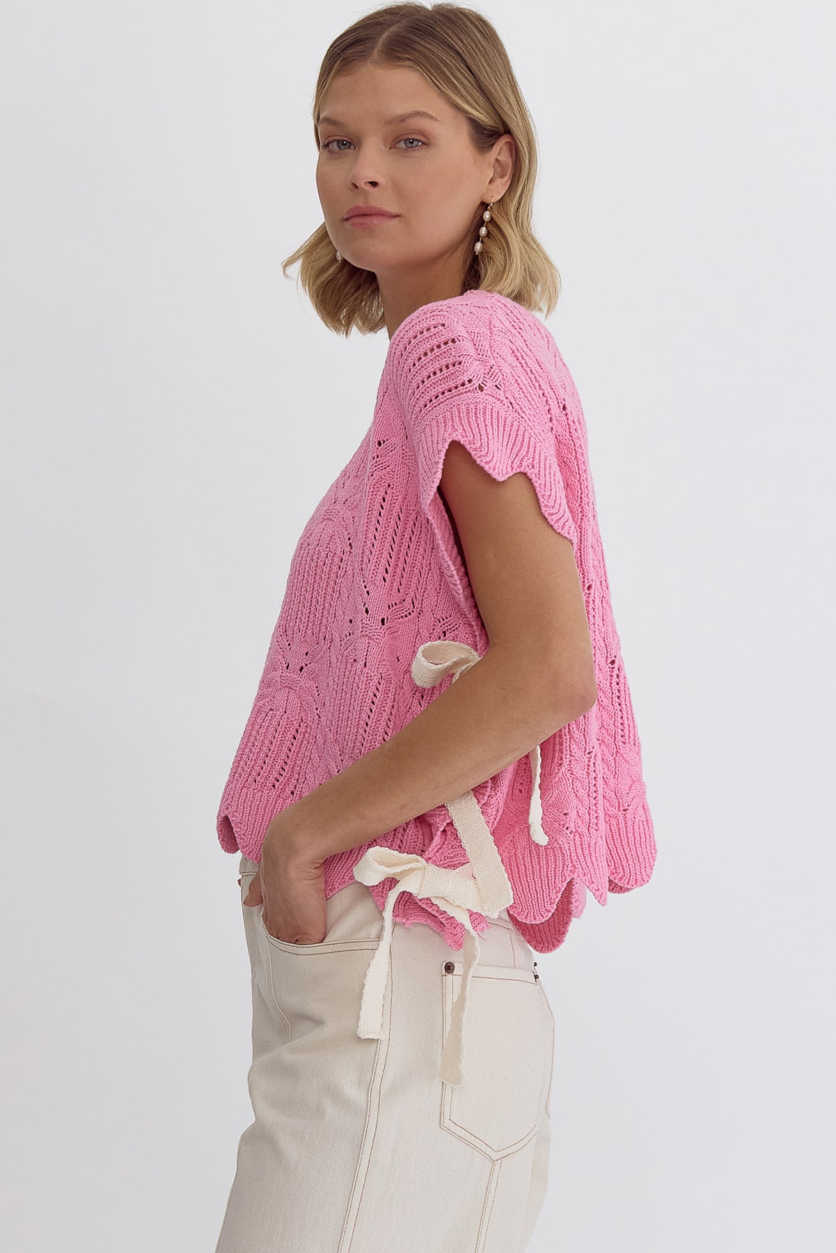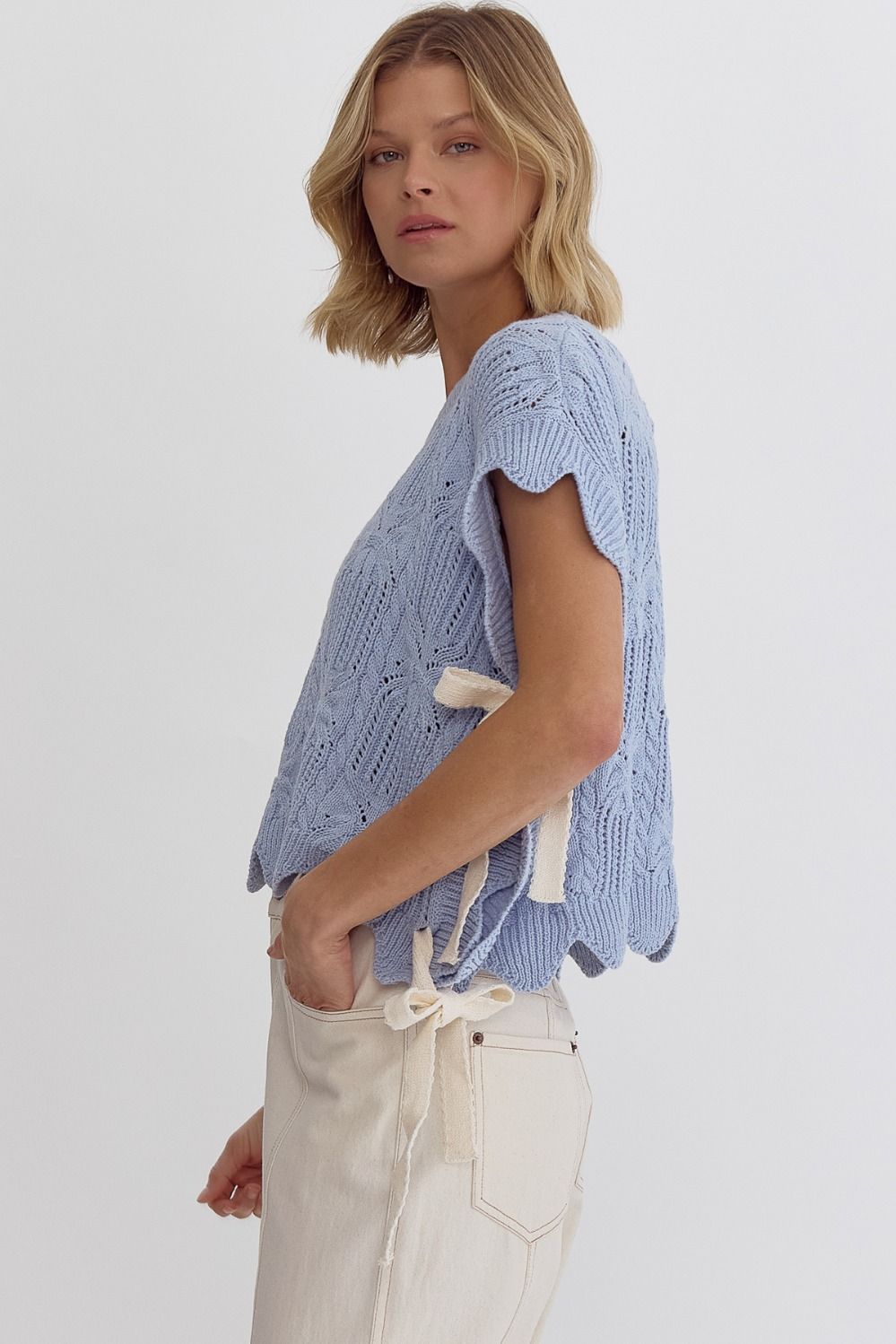 Elevate your style with our high-end oversized knit sweater. Crafted from a lightweight ribbed knit material, this sweater features a crew neck sleeveless with amazing side detail to top off this perfect look the self tie fabric on the sides to make this your dream top!