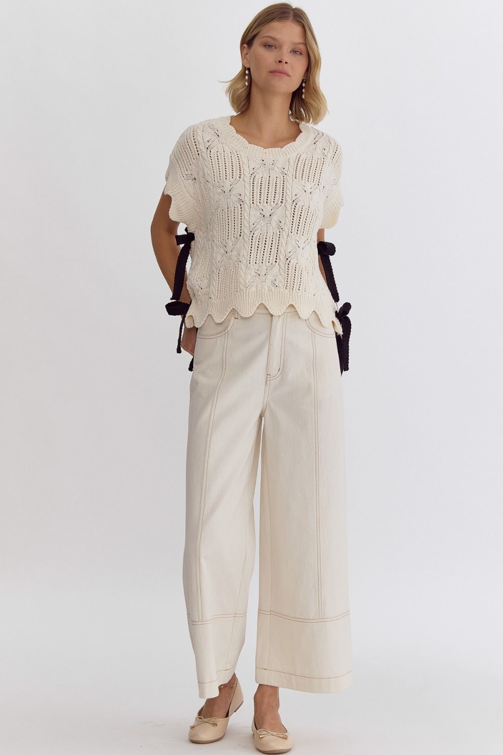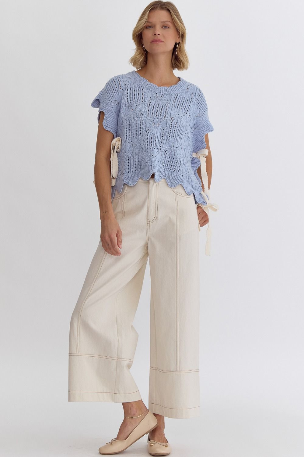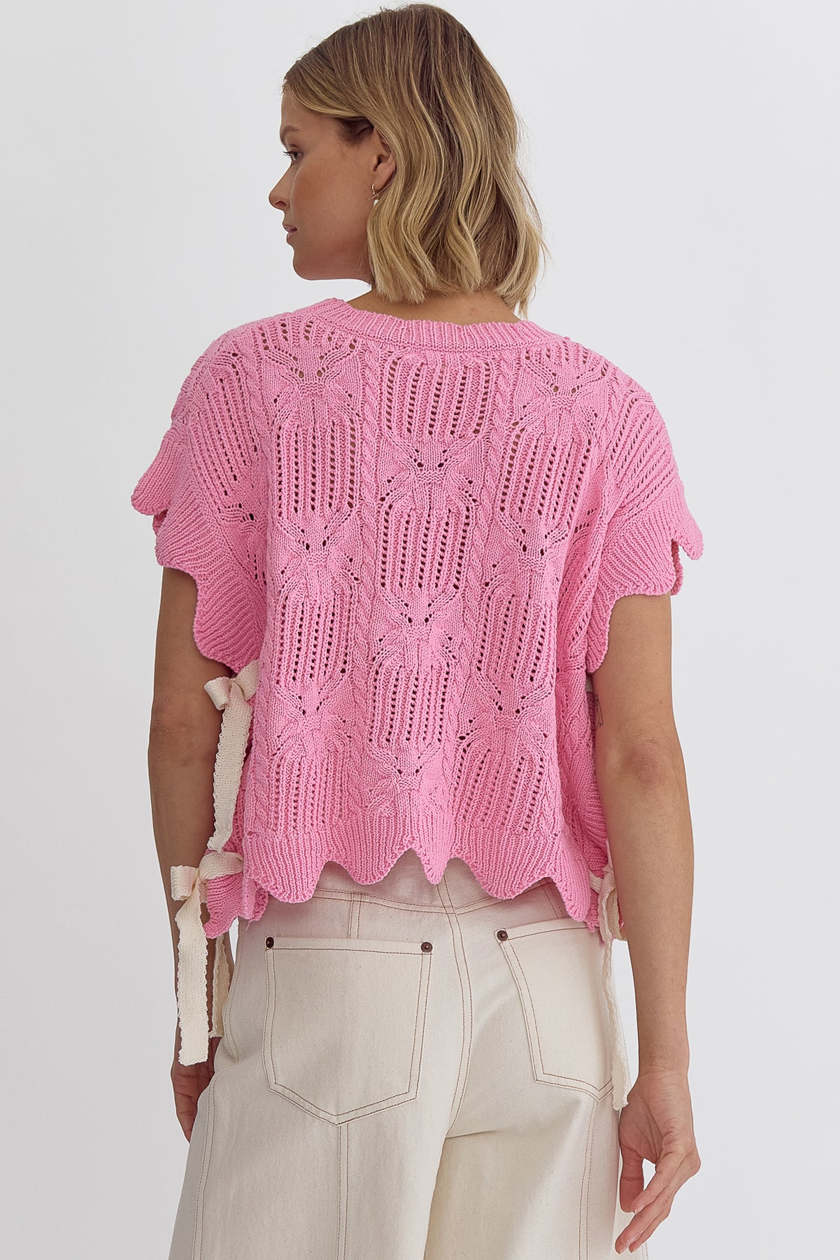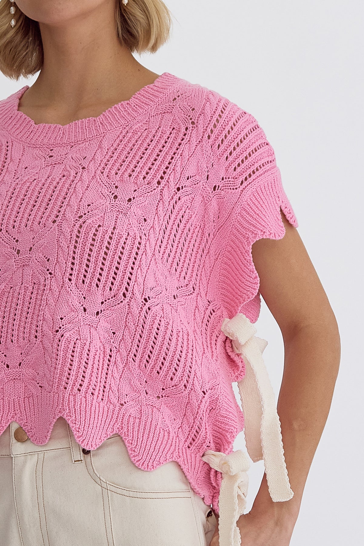 Elevate your style with our high-end oversized knit sweater. Crafted from a lightweight ribbed knit material, this sweater features a crew neck sleeveless with amazing side detail to top off this perfect look the self tie fabric on the sides to make this your dream top!