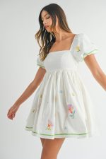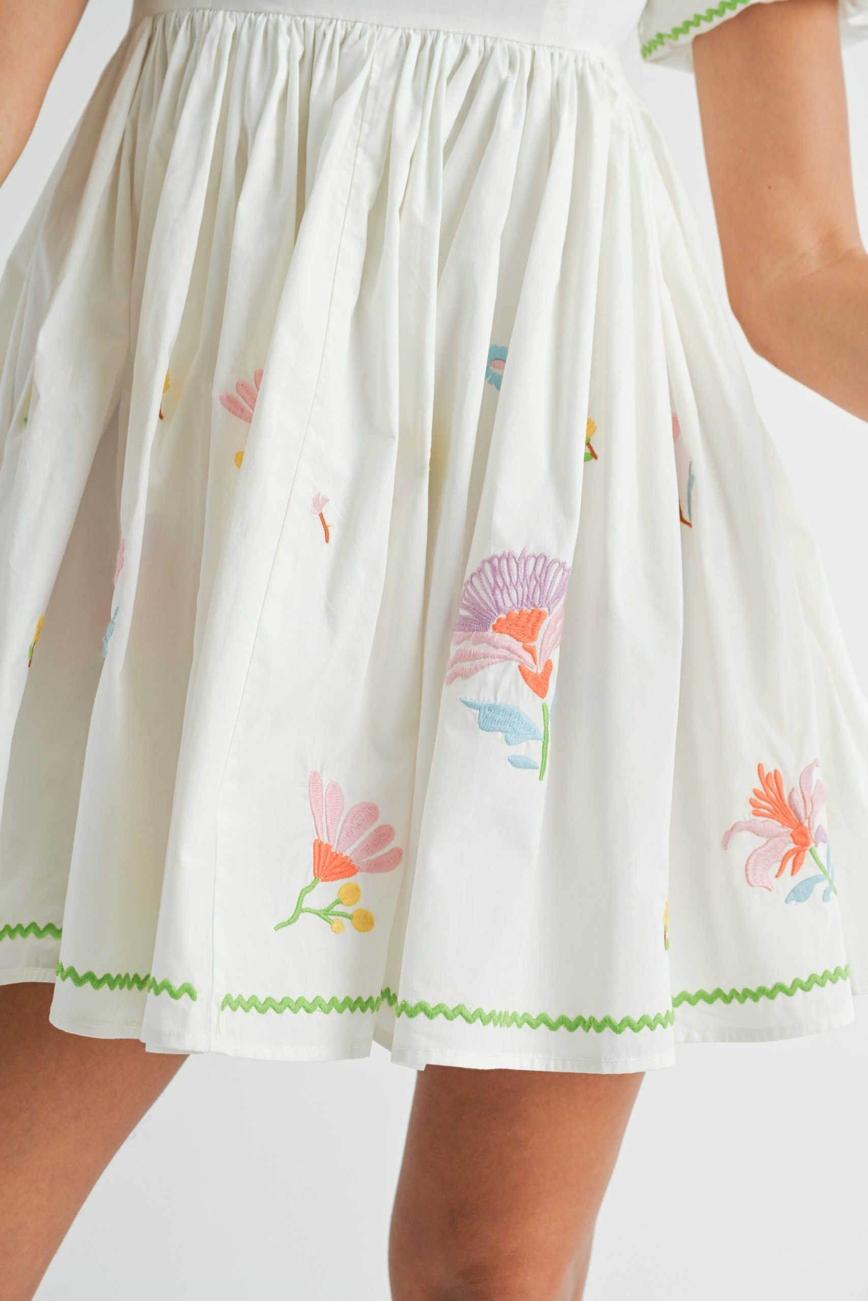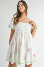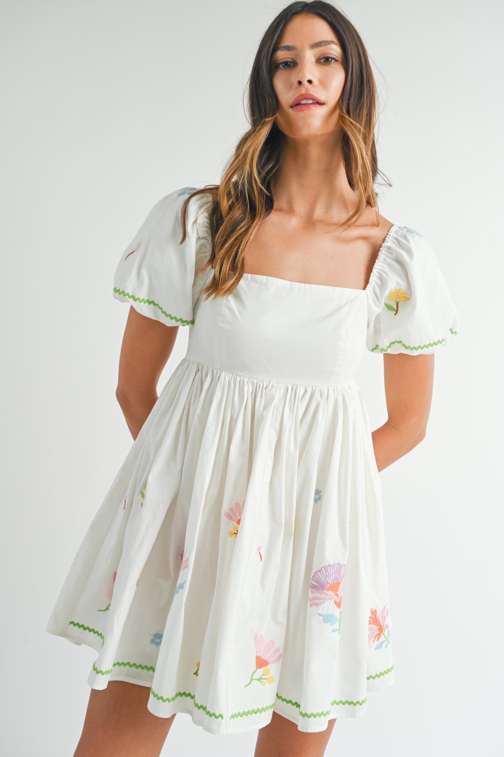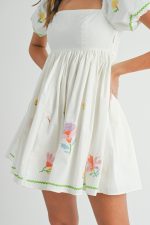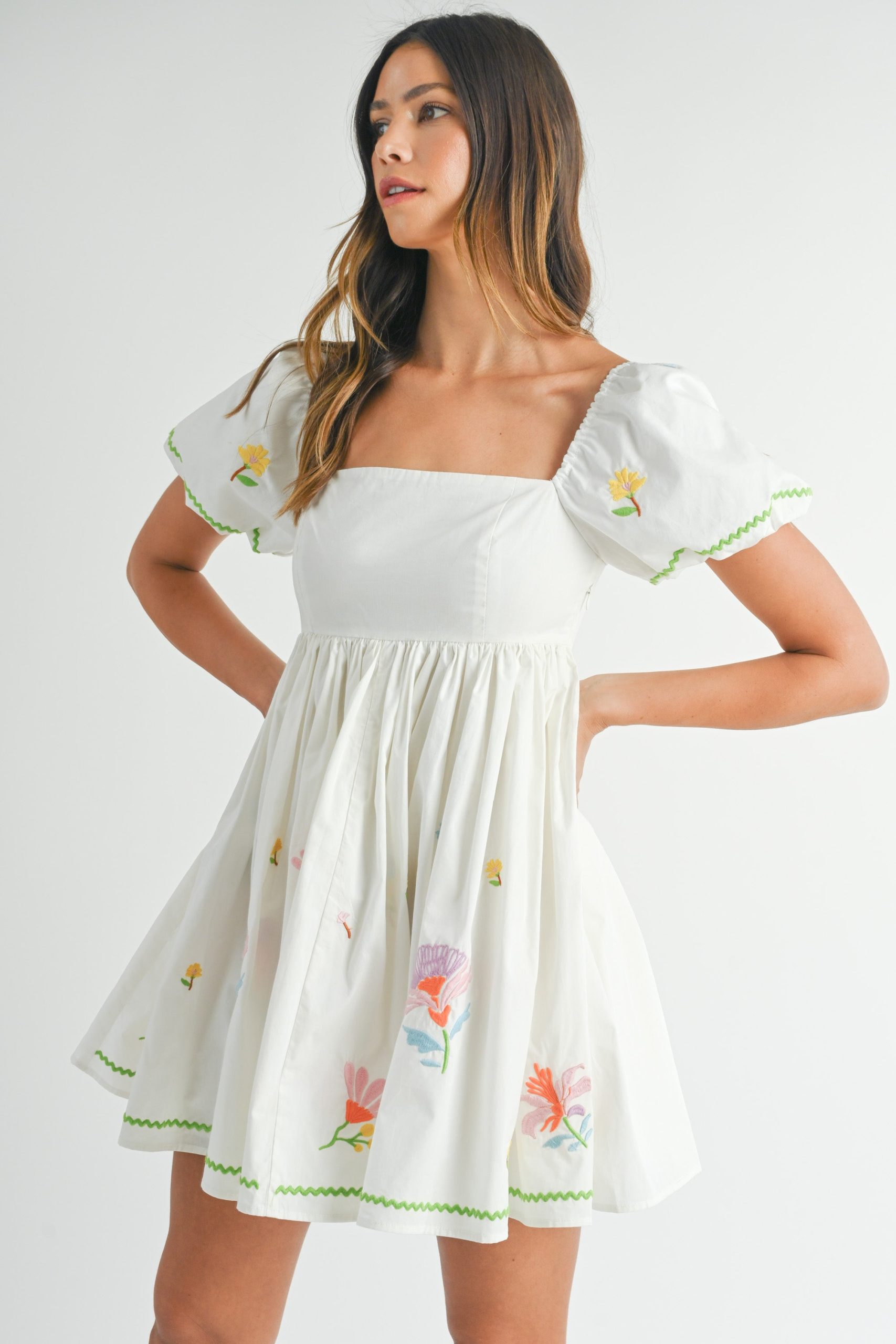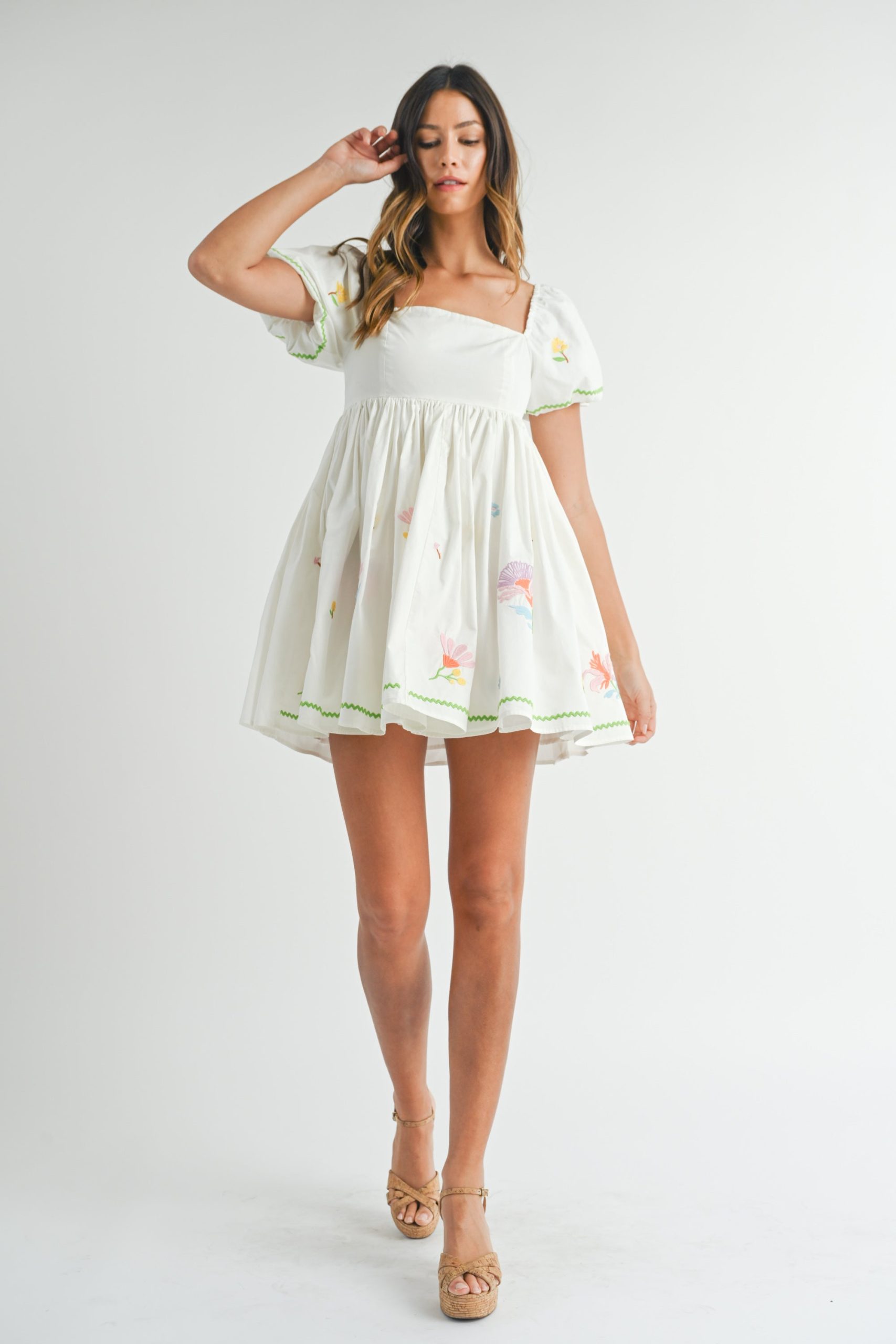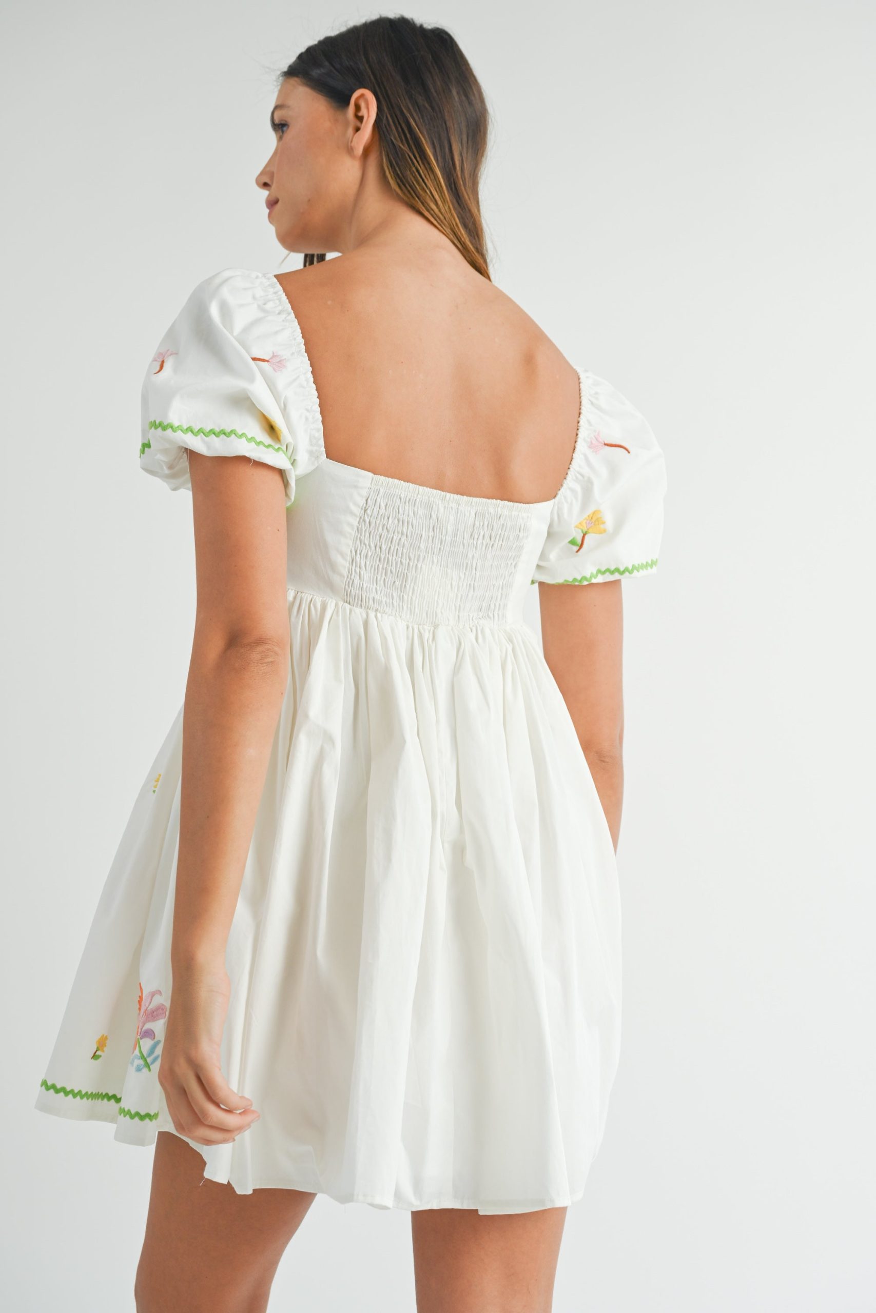 Poplin with embroidered floral detail perfect babydoll mini dress with puff sleeve and smocked back detailing.