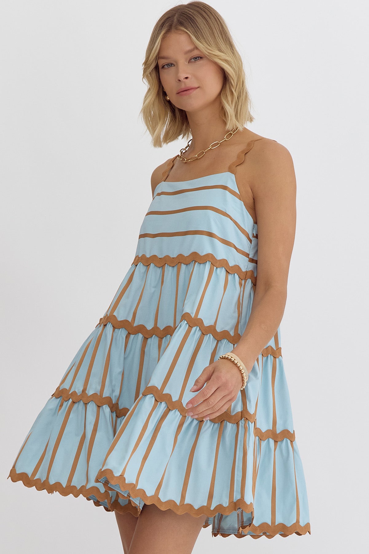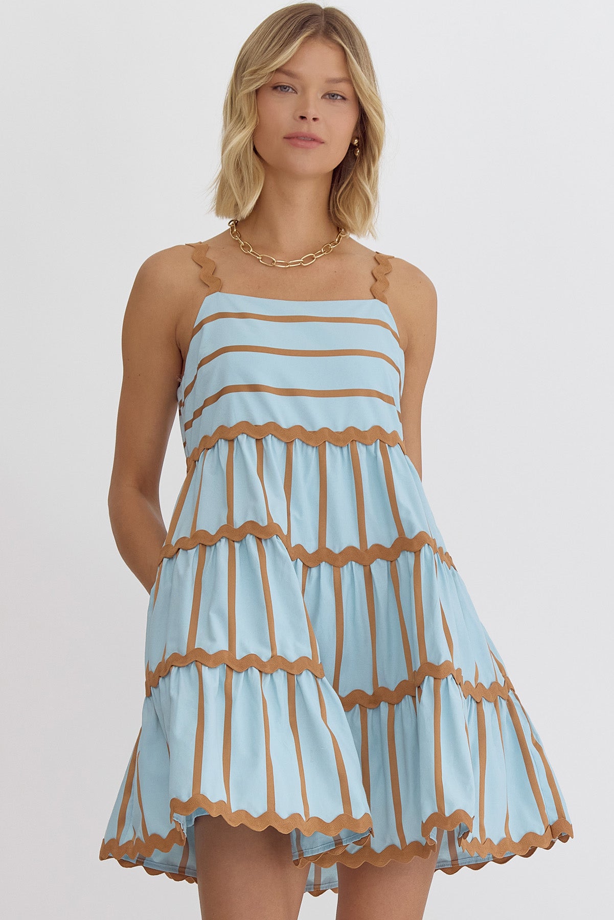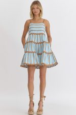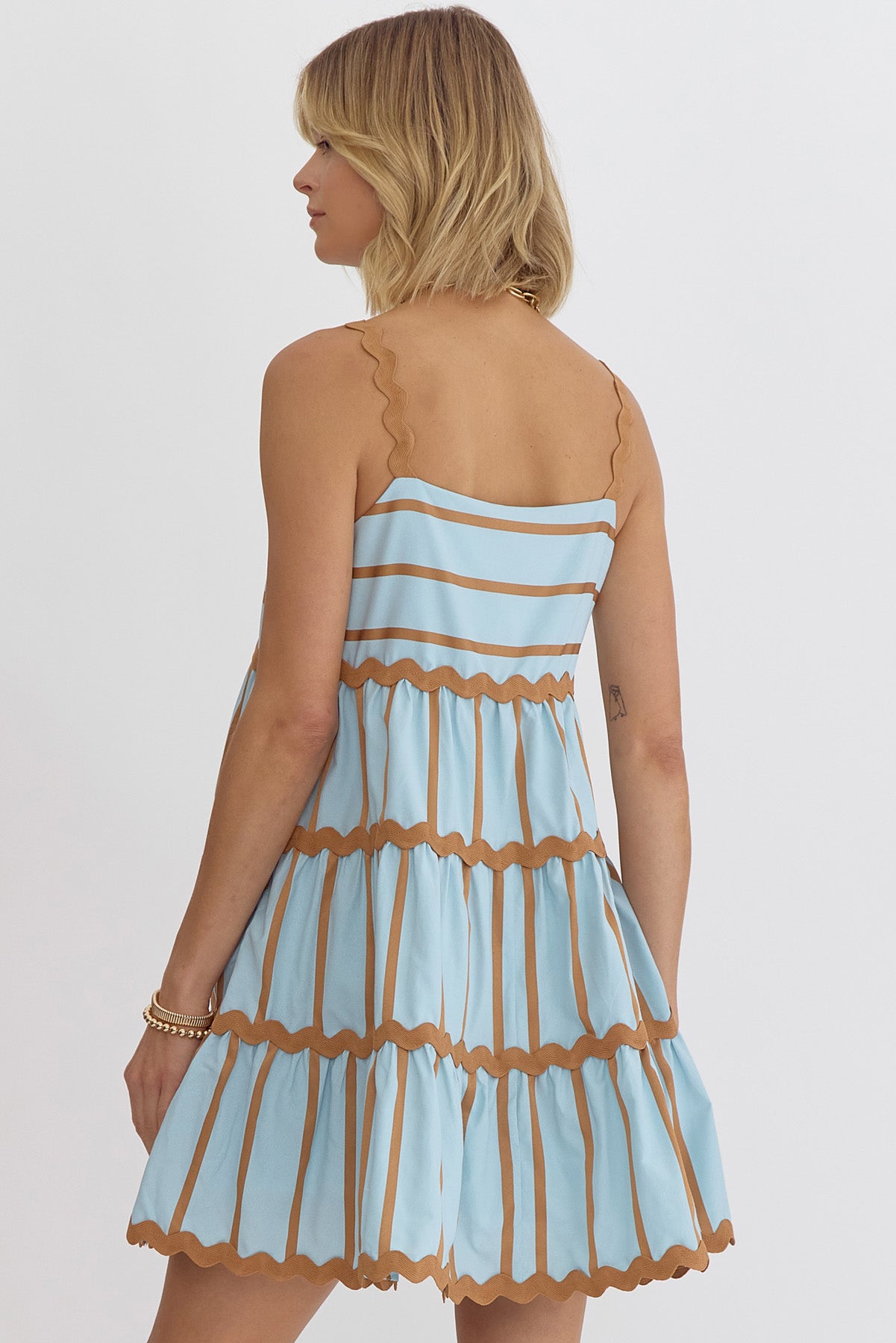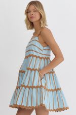 Stripe print square neck sleeveless mini dress featuring ric rac trim.
