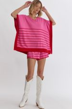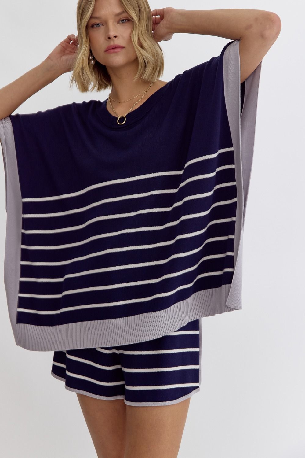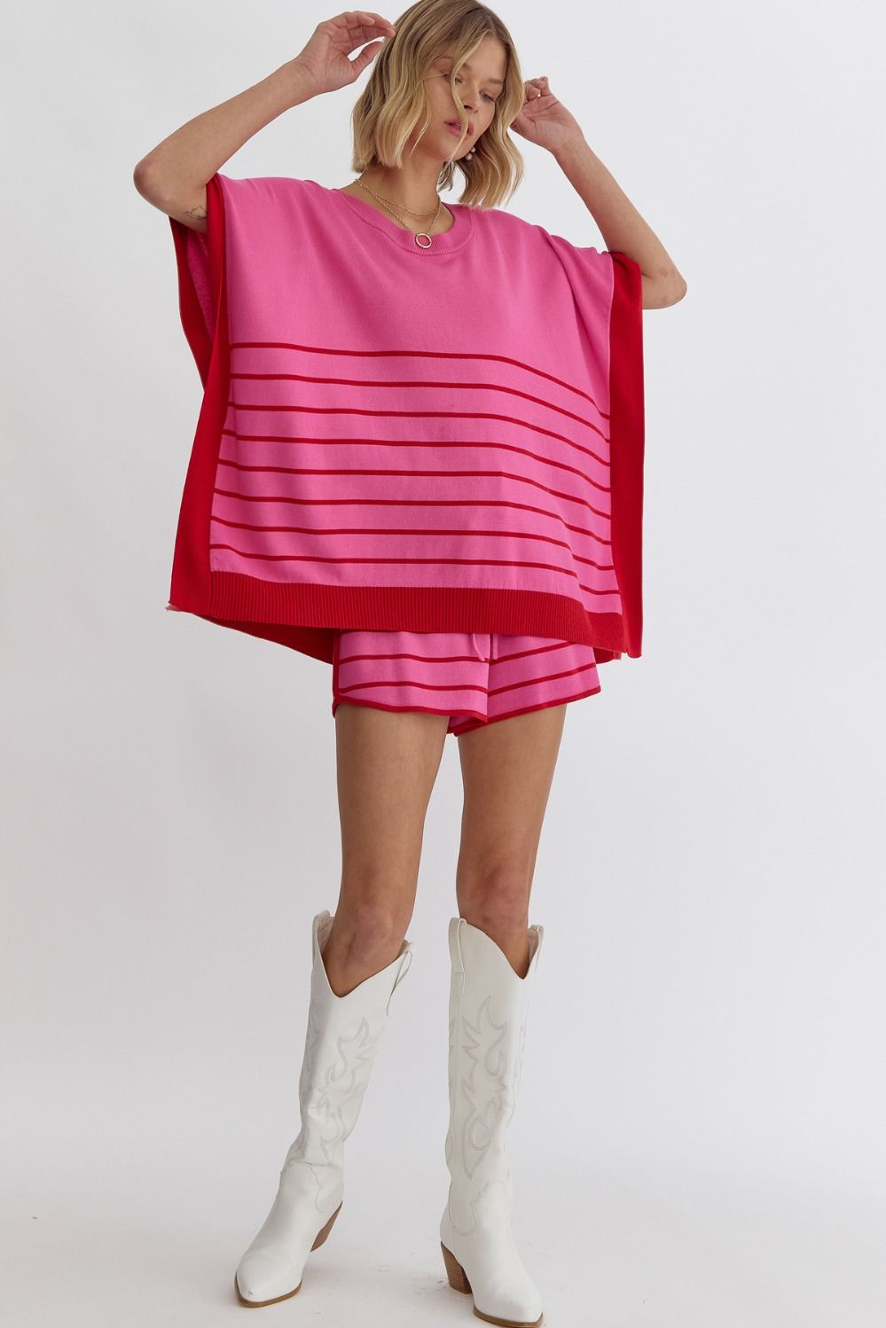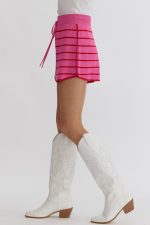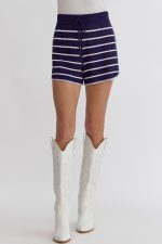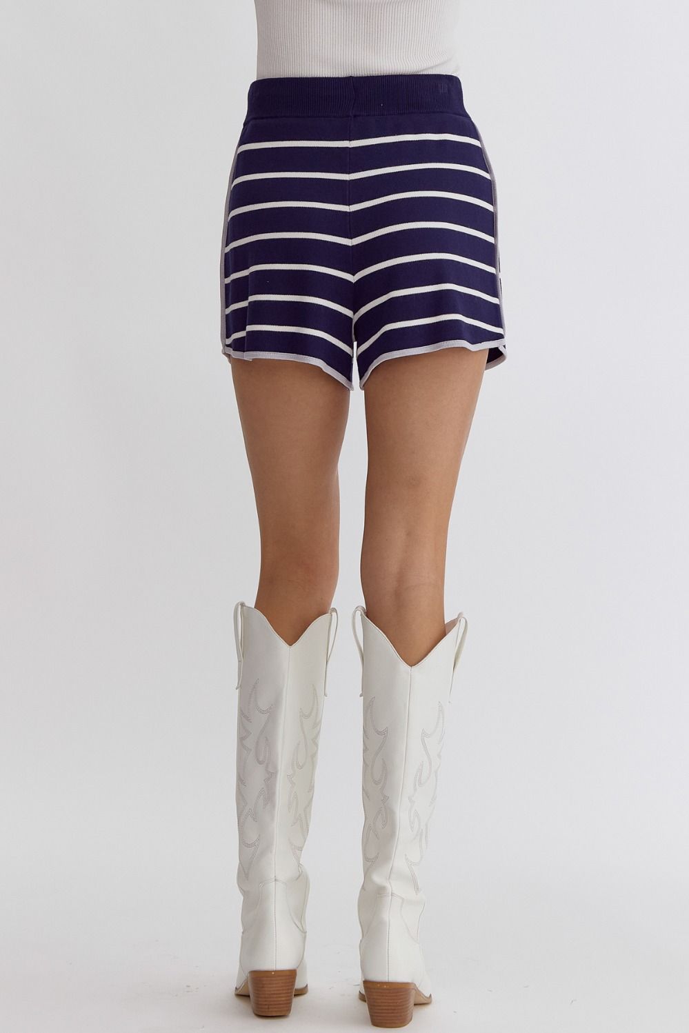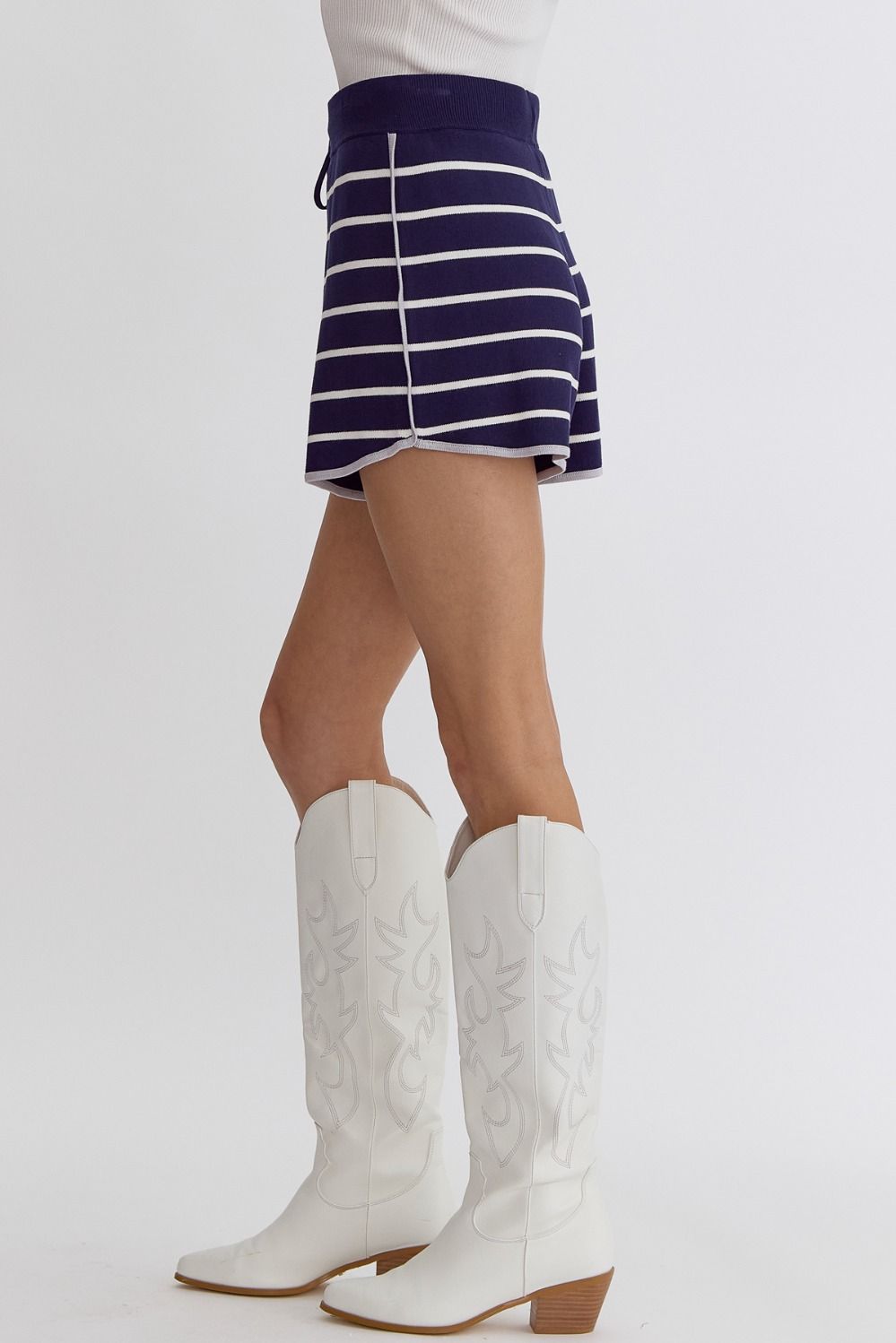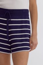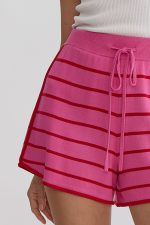 Striped high-waisted knit shorts featuring drawstring at waistband.