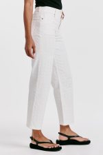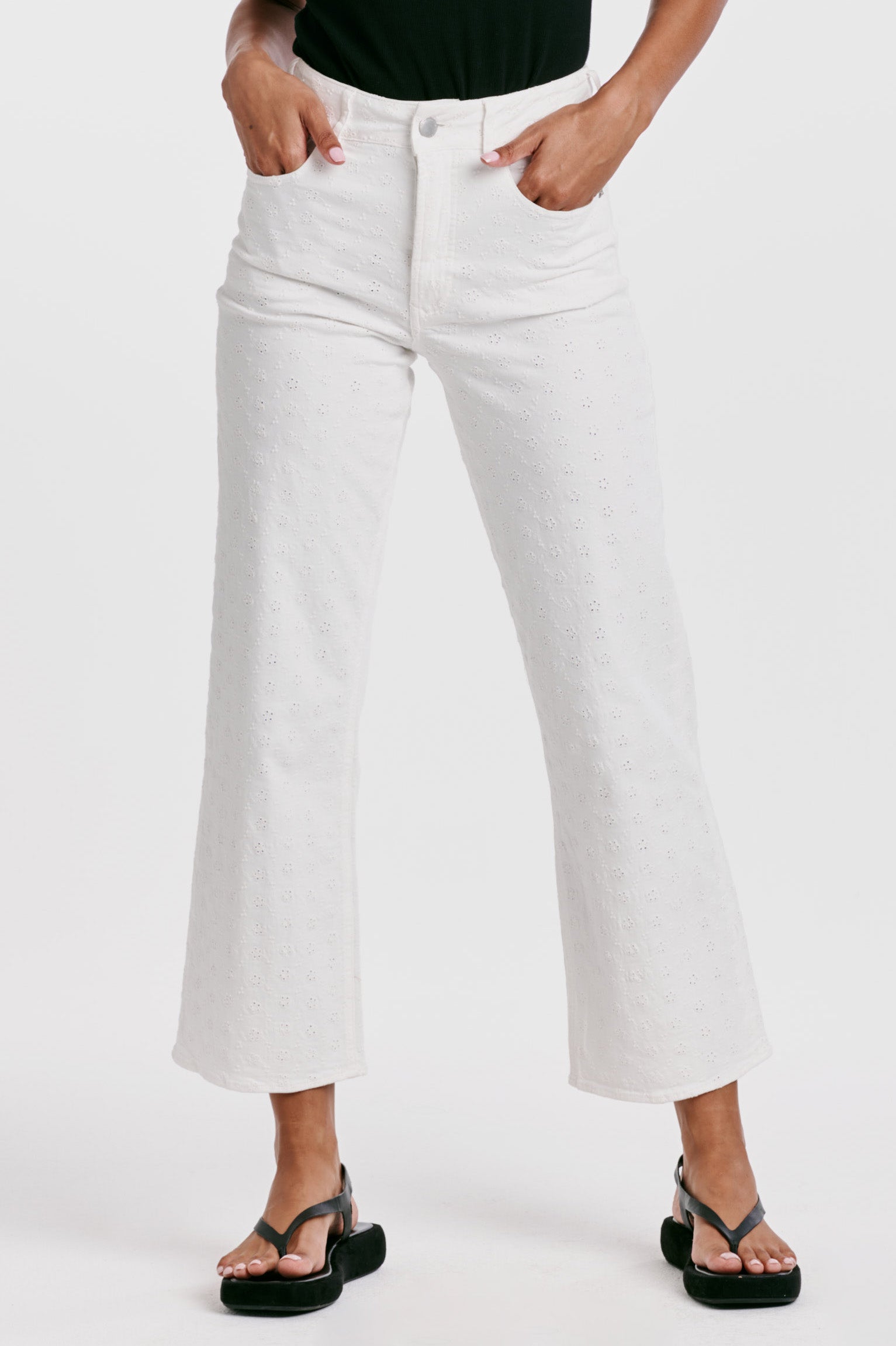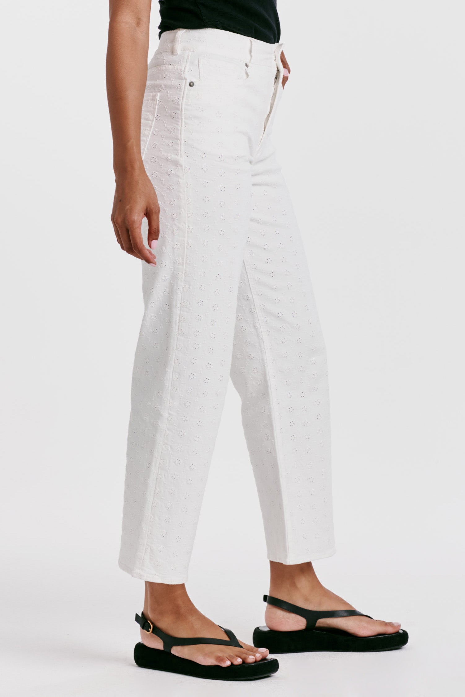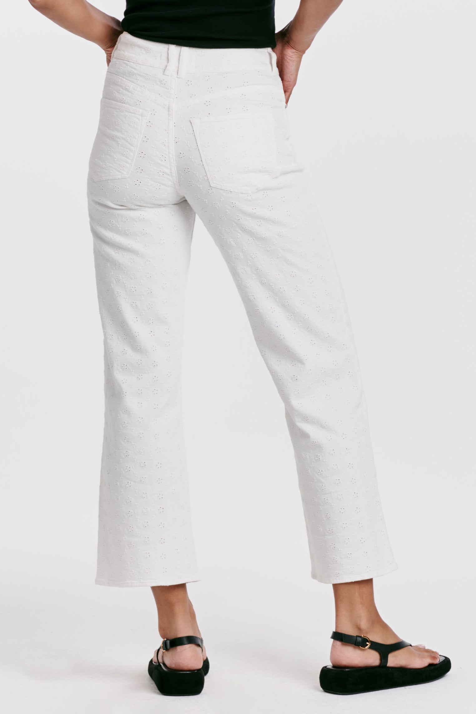 Super high rise wide hem straight leg jeans. It’s the jolly fit that sits slightly lower on the waist and fitted easy & straight from the hip to mid thigh. Ankle inseam on stretch twill weaved with pointelle floral repeats, tailored center inseam press.