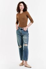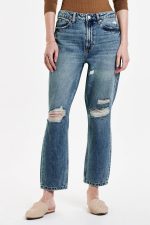 Super high rise cropped straight leg jeans. It’s the friendly fit that sits at natural waist and fitted slender from the hip to mid thigh. Cropped inseam on rigid (non-stretch) denim accented with designer placed destructions, knee cut-out & tears, hand sand whiskers at hip, grindings on pockets & leg opening.