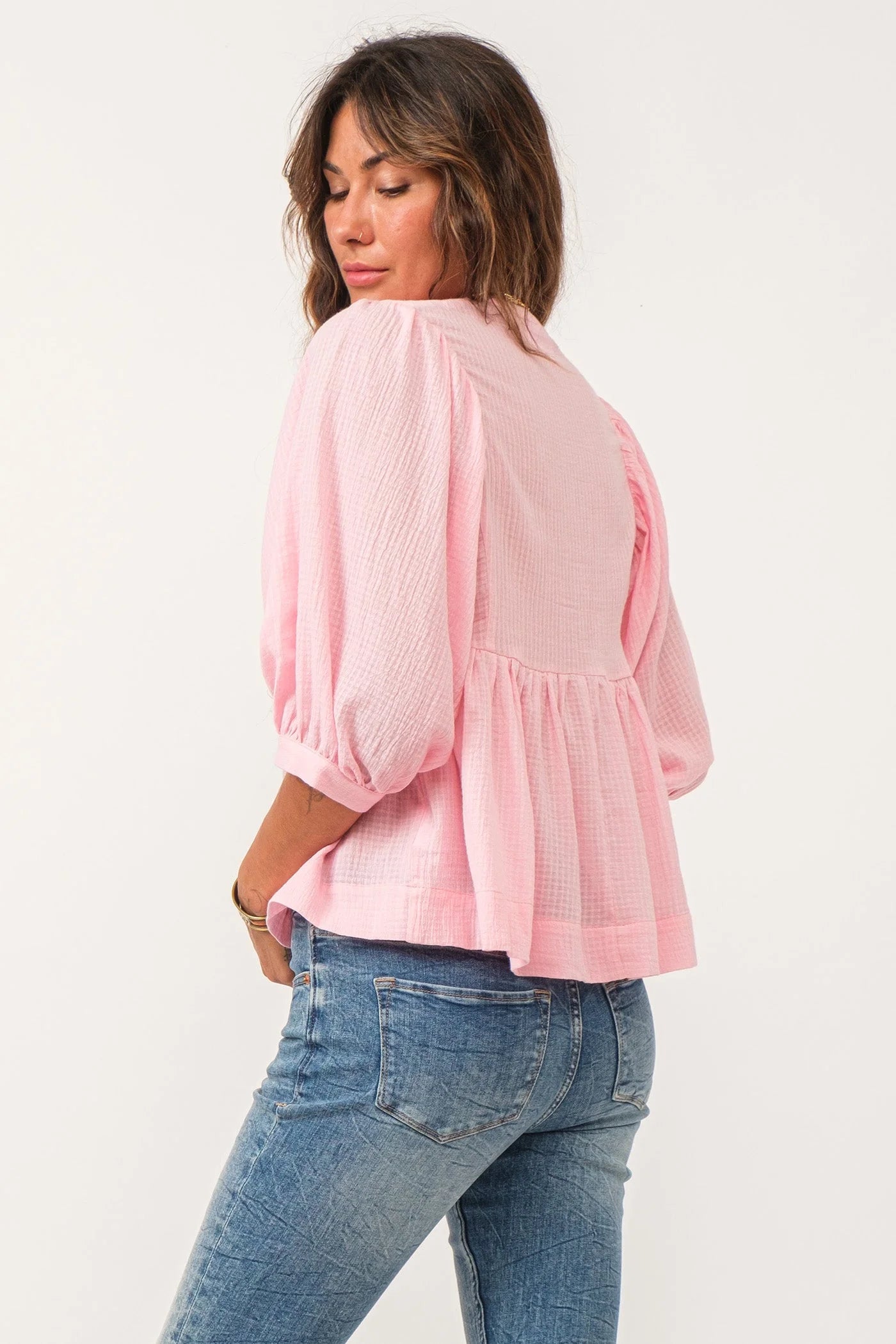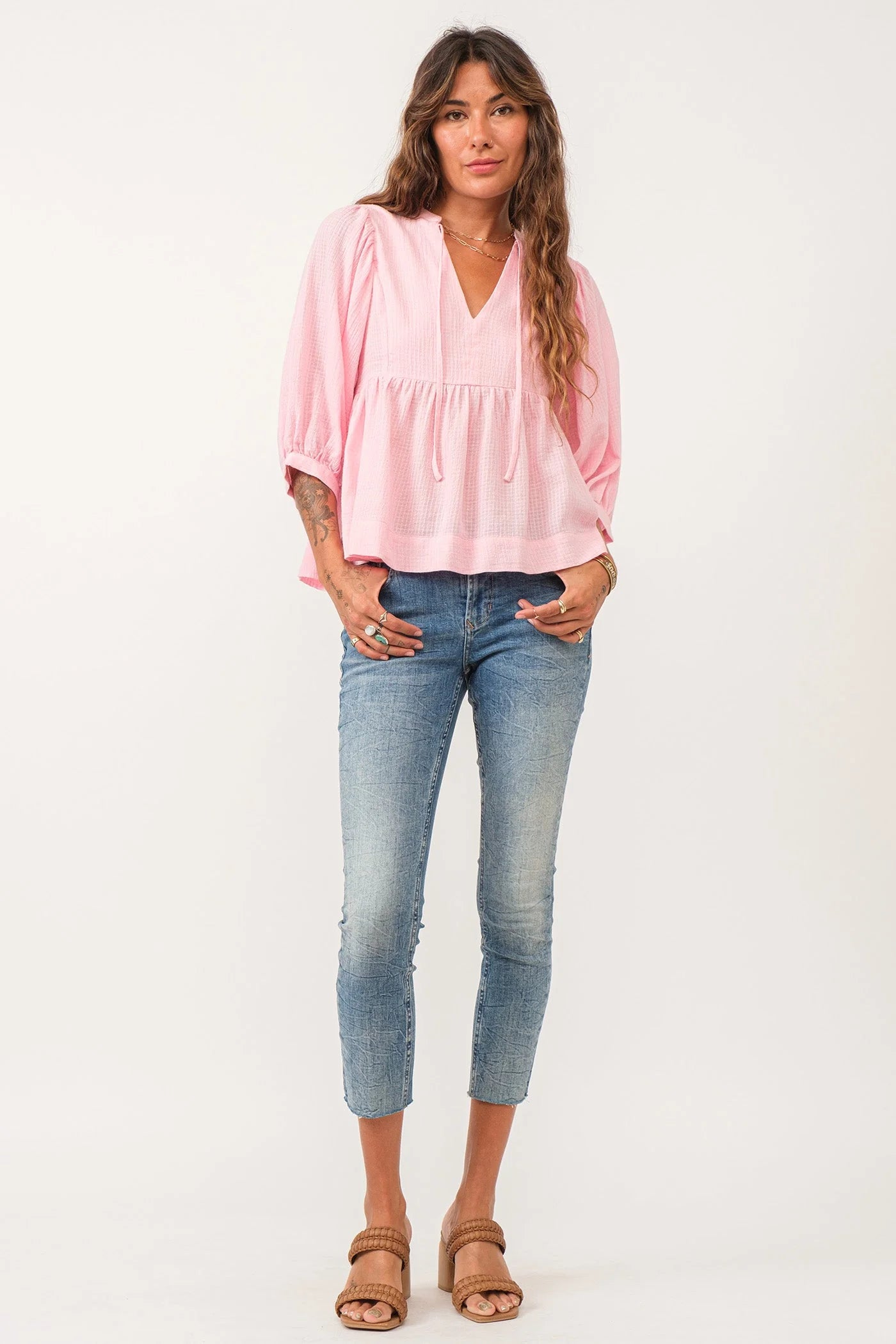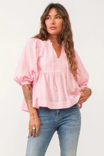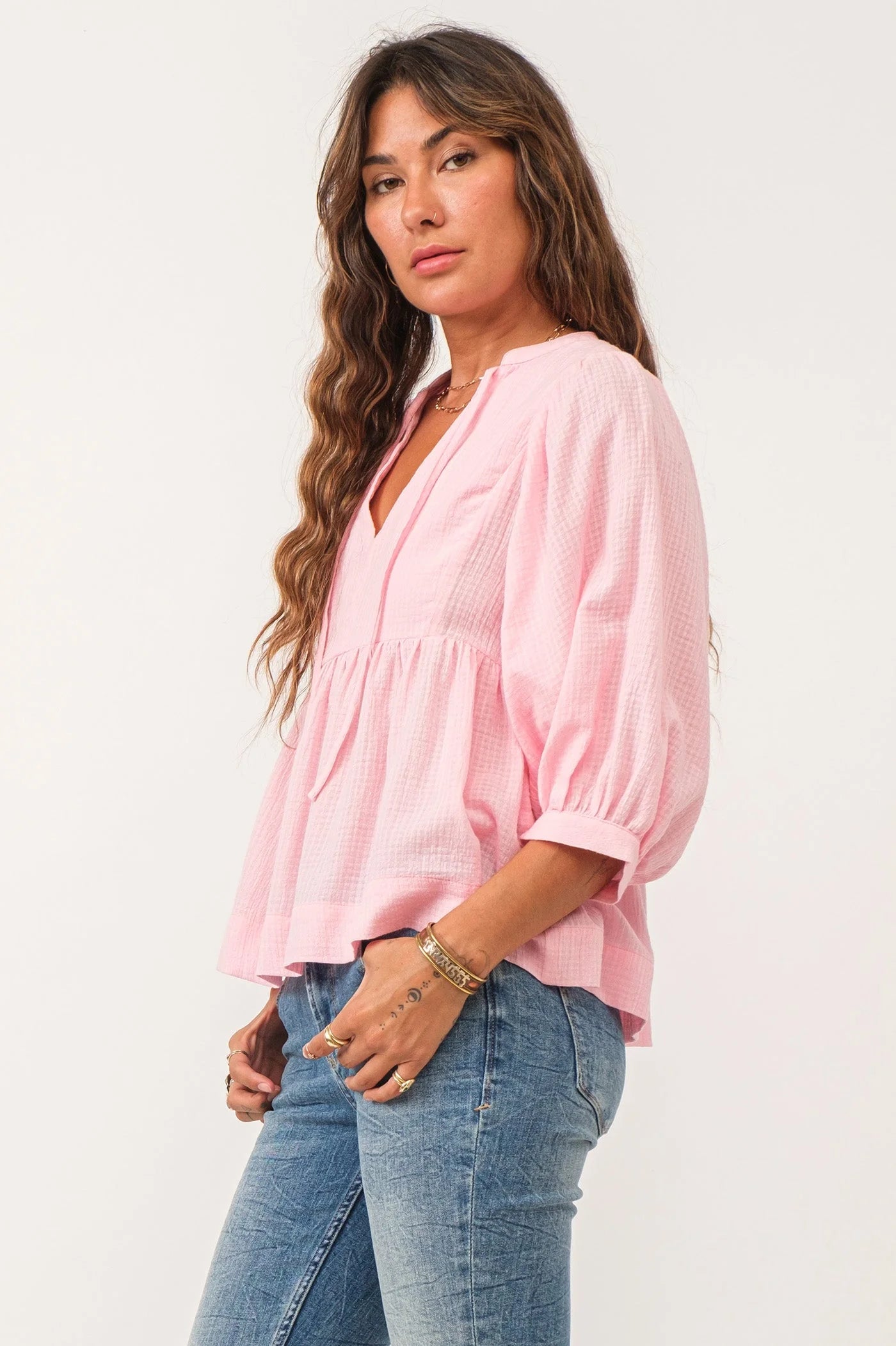 V-neck top with self tie & 3/4 sleeve finished in cotton gauze. Solid color woven on relaxed fit. Celebration of feminine refined, effortlessly showcasing hues of grace and allure in every stitch!