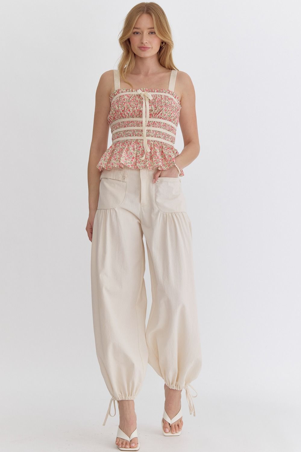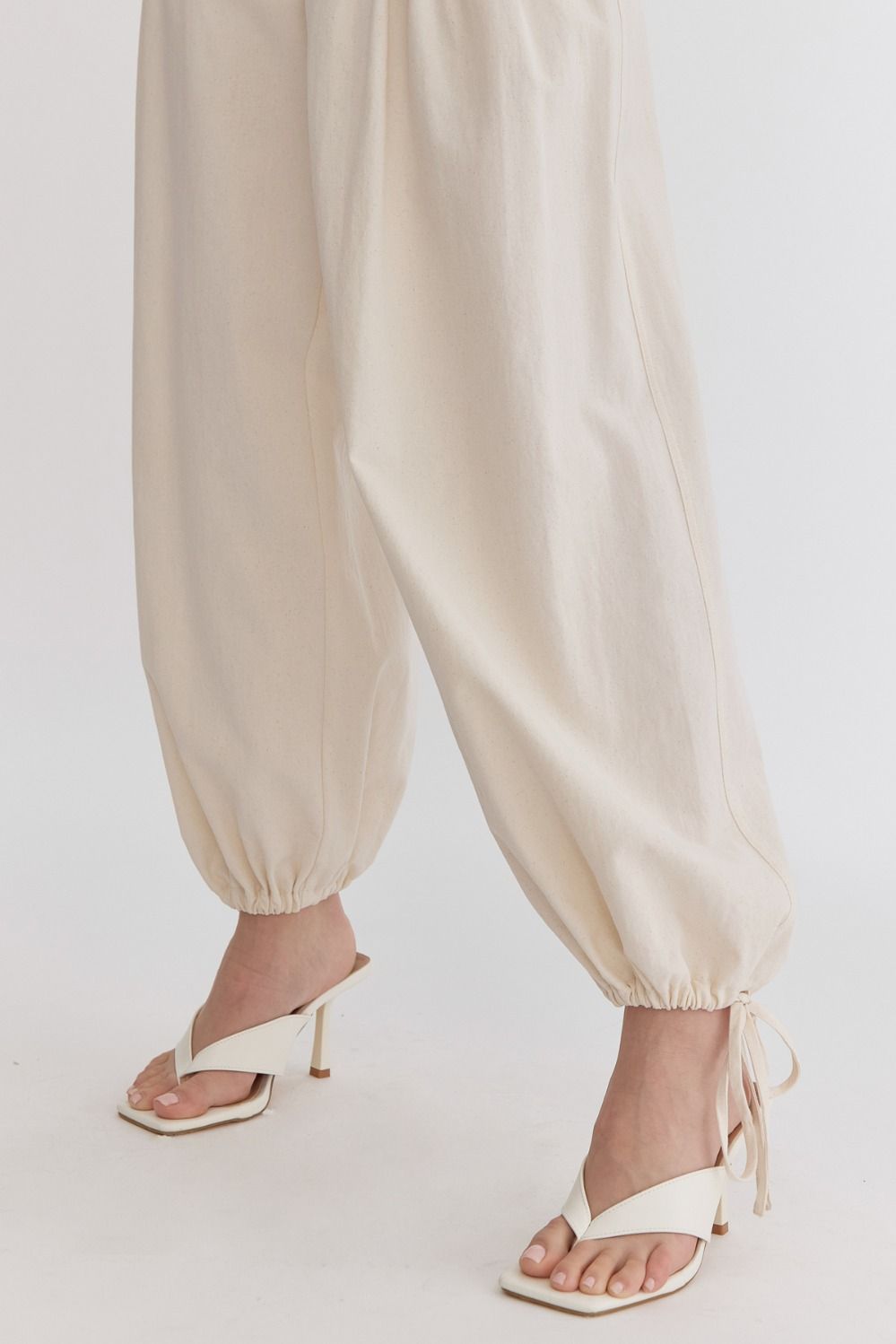 Solid mid-rise balloon style pants featuring cinch-tie at ankles.