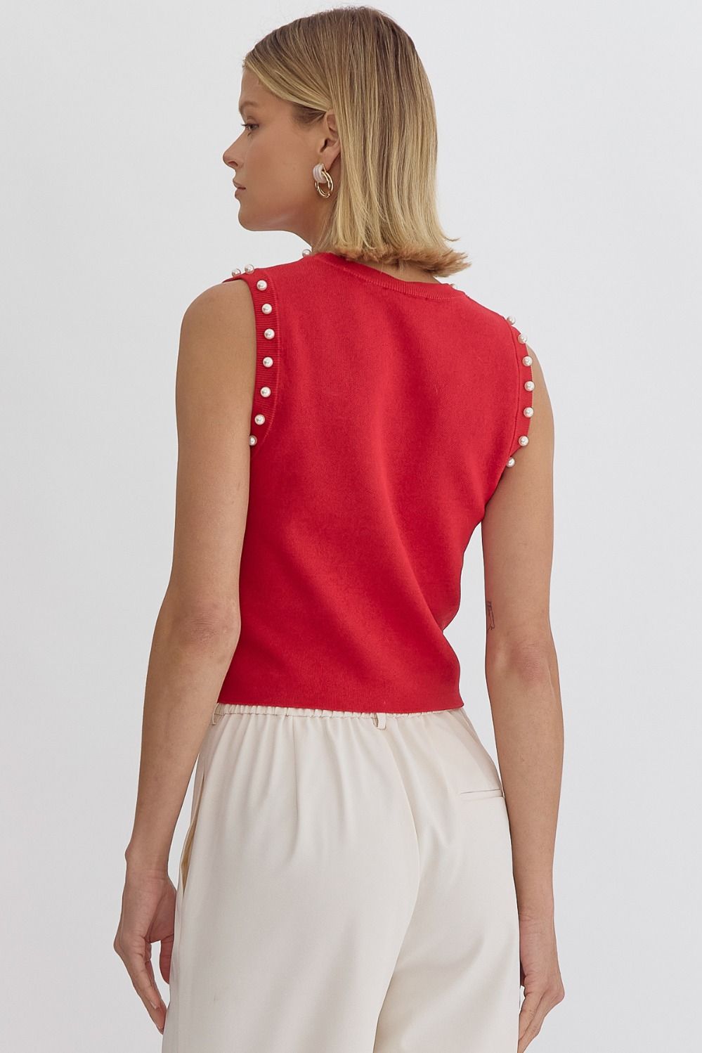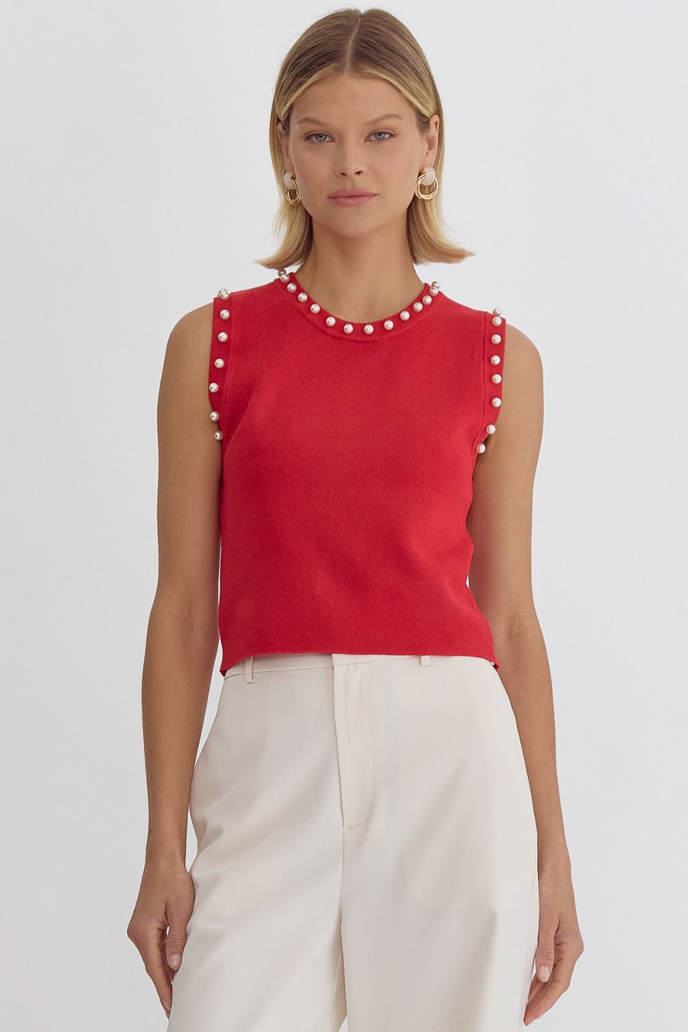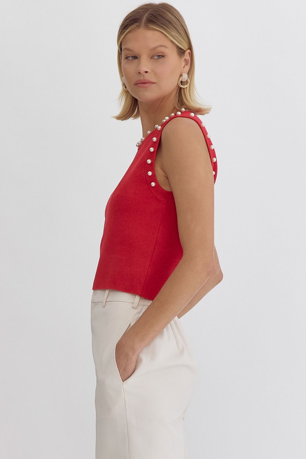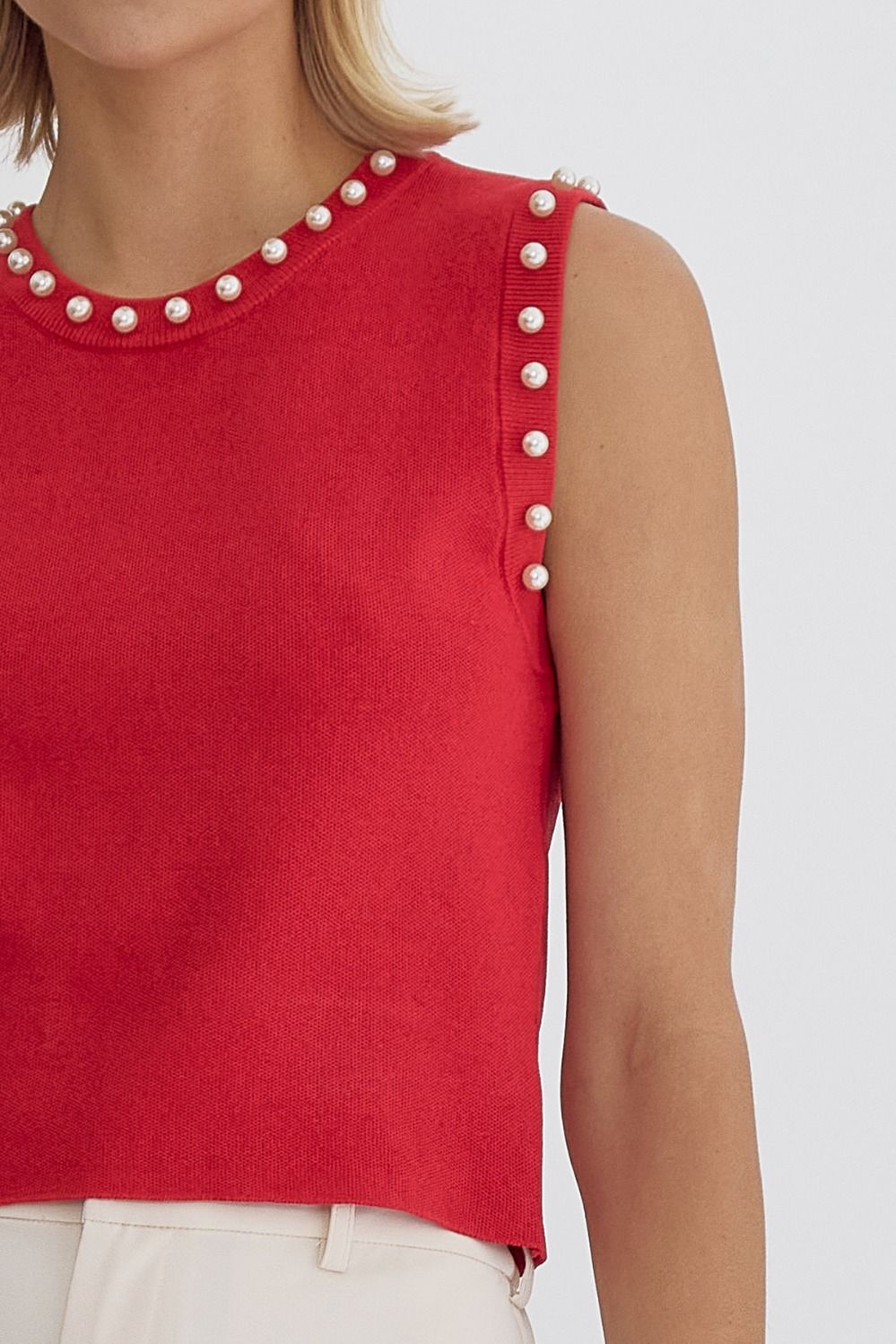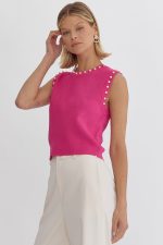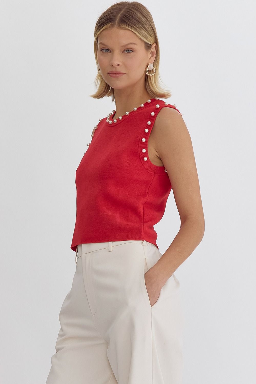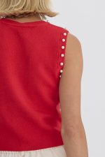 Solid round neck sleeveless cropped top featuring pearl detail.