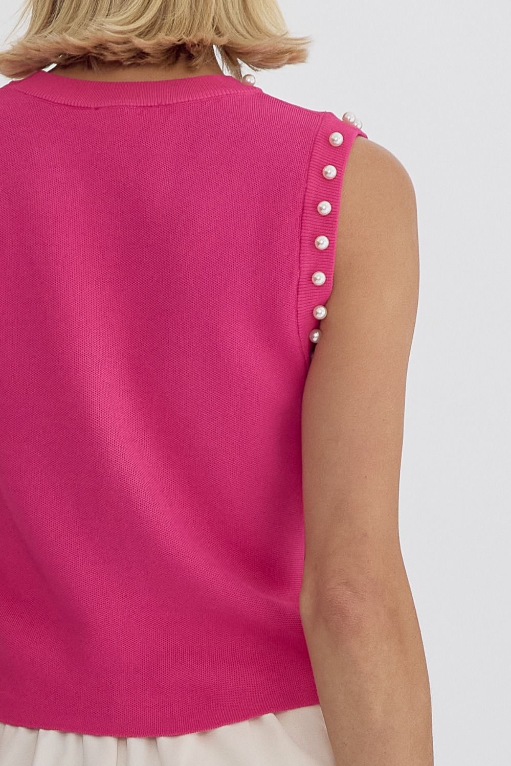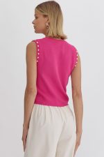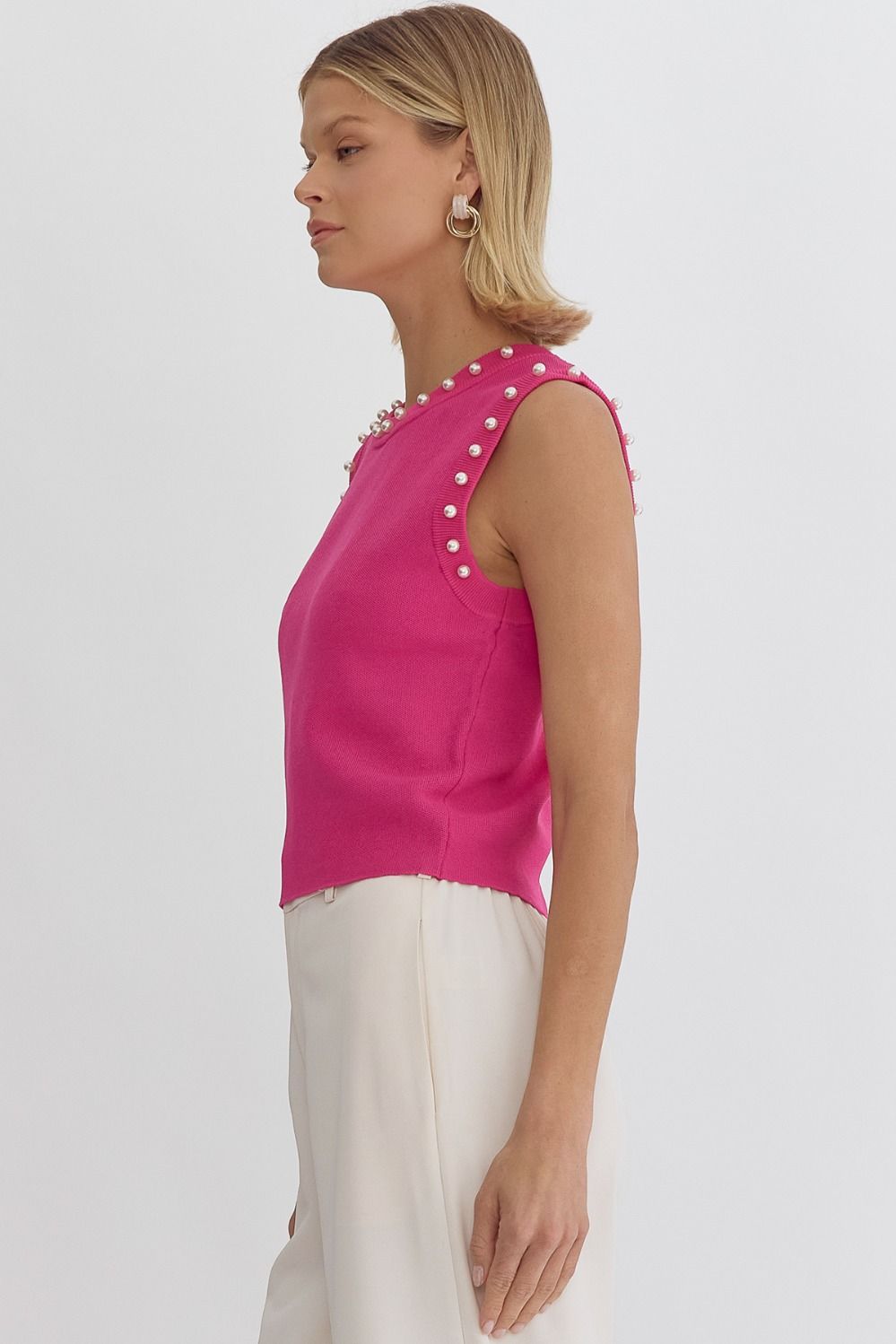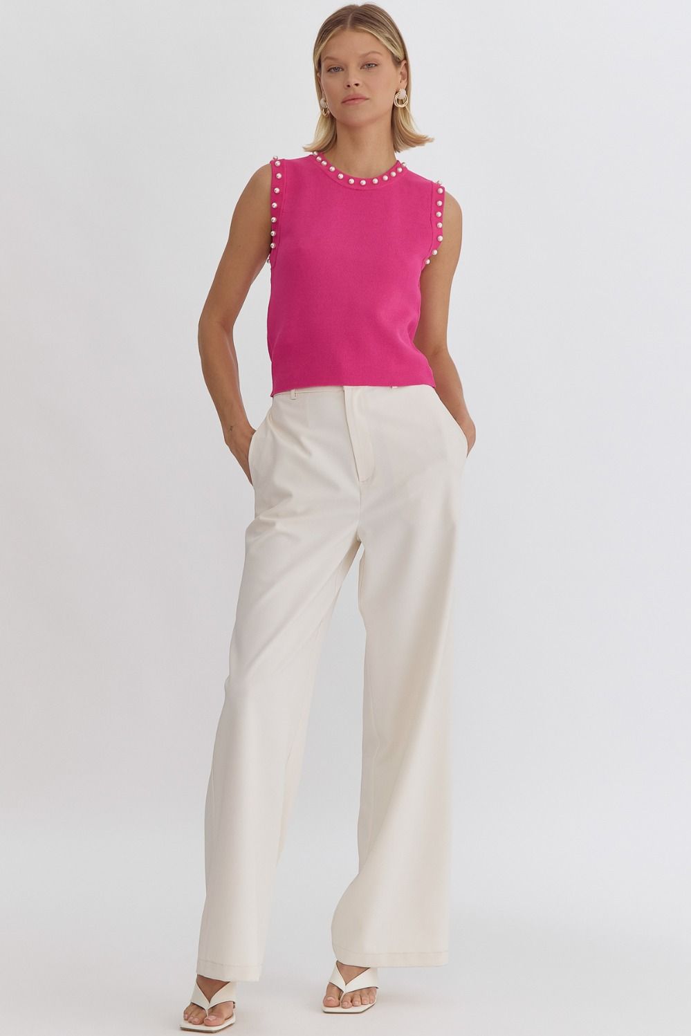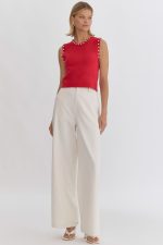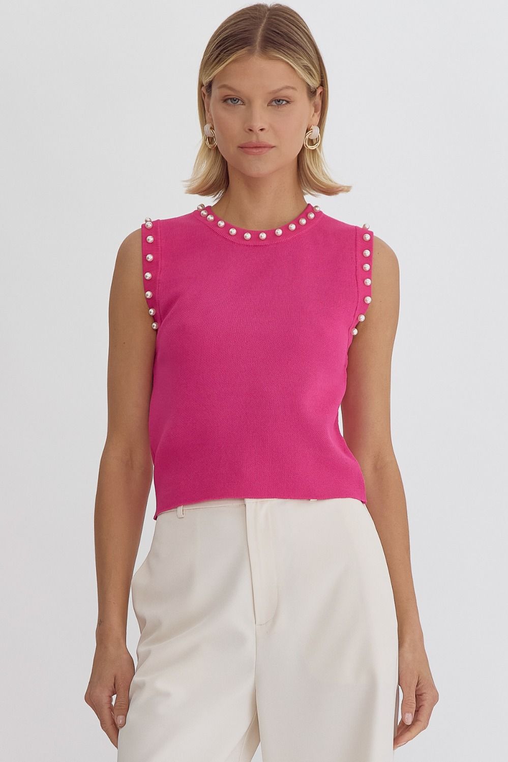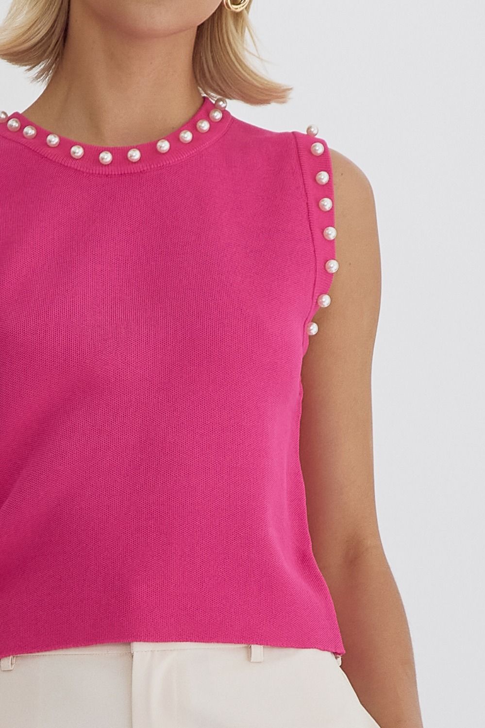 Solid round neck sleeveless cropped top featuring pearl detail.