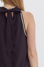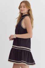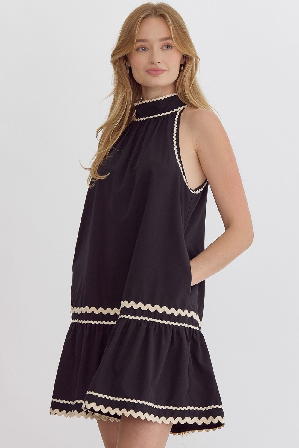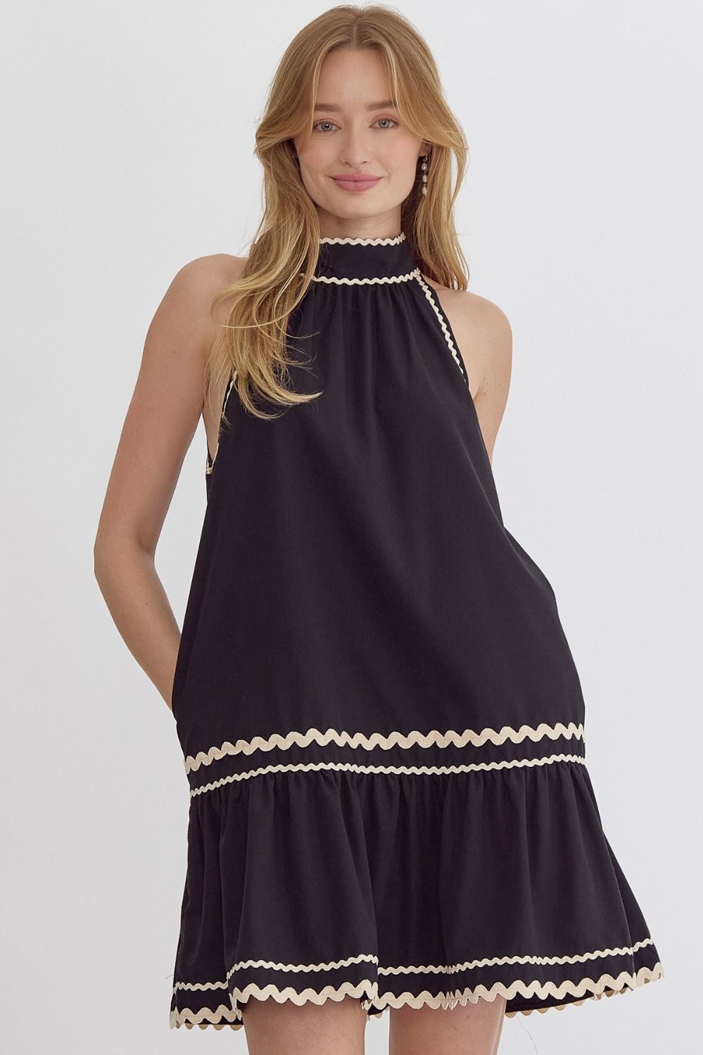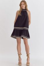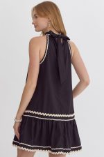 Solid halter neck mini dress featuring ric rac trim.