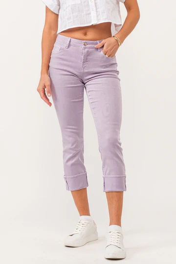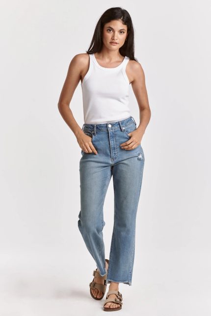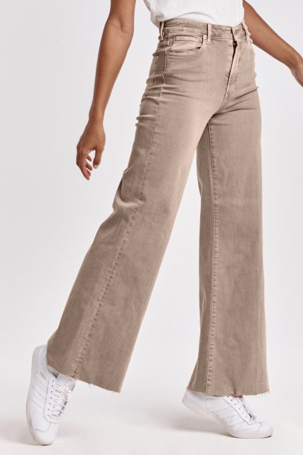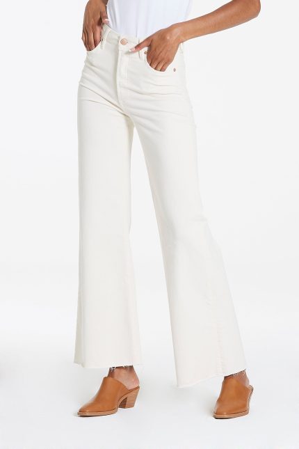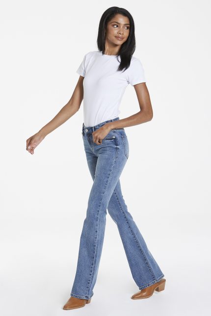 High rise flare leg jeans. It’s the lovable fit that sits slightly lower on the waist and fitted skinny in the hips through the knee. Full inseam on comfort stretch denim accented with hand sanding whiskers at hip & inseam chevrons, random destructions & pocket grindings, tailor pressed seam lines.