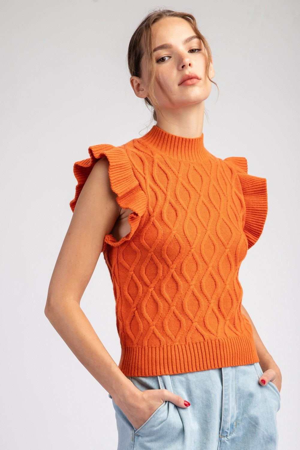 Solid short sleeve sweater top featuring a ribbed mock neckline, ribbed ruffle sleeves, a textured body for detail, a ribbed bottom band and is a fitted silhouette.