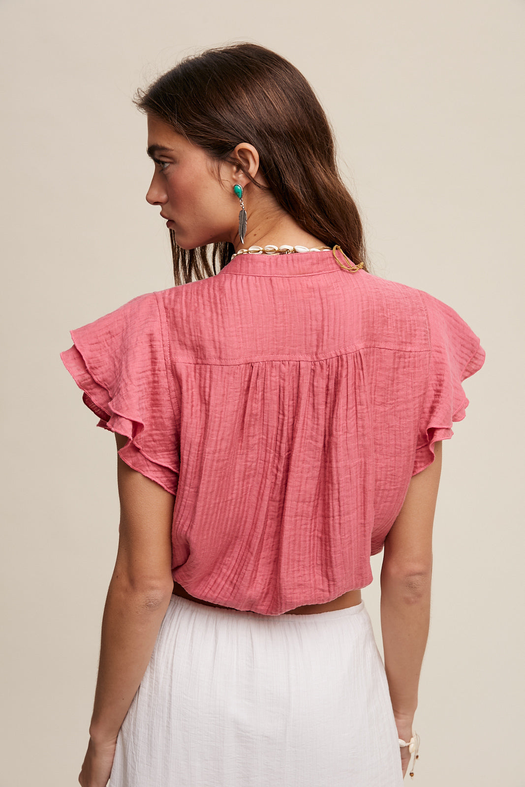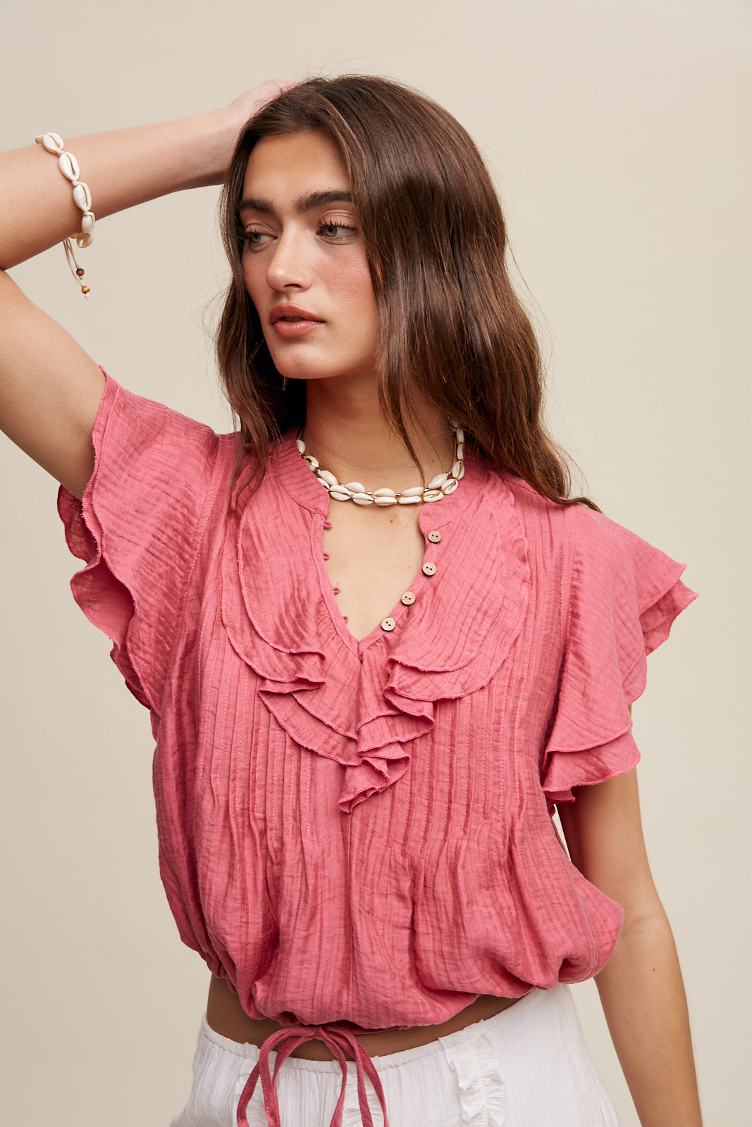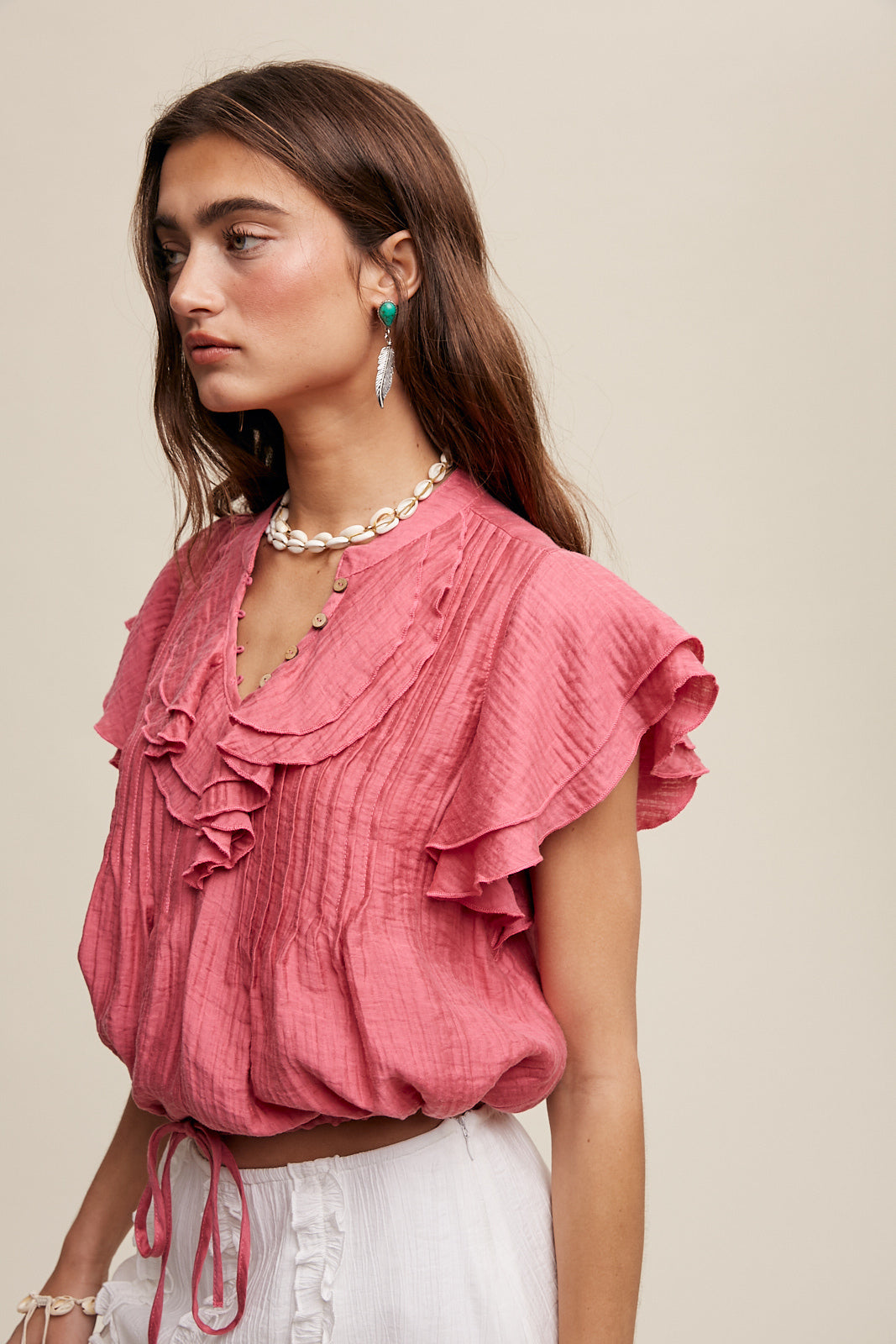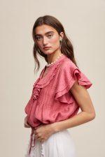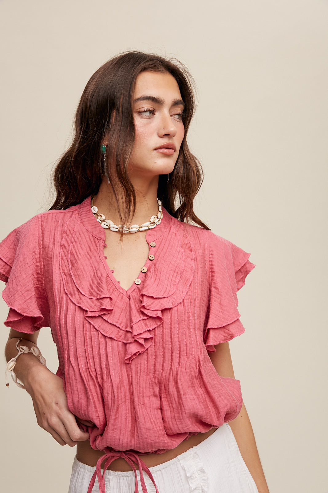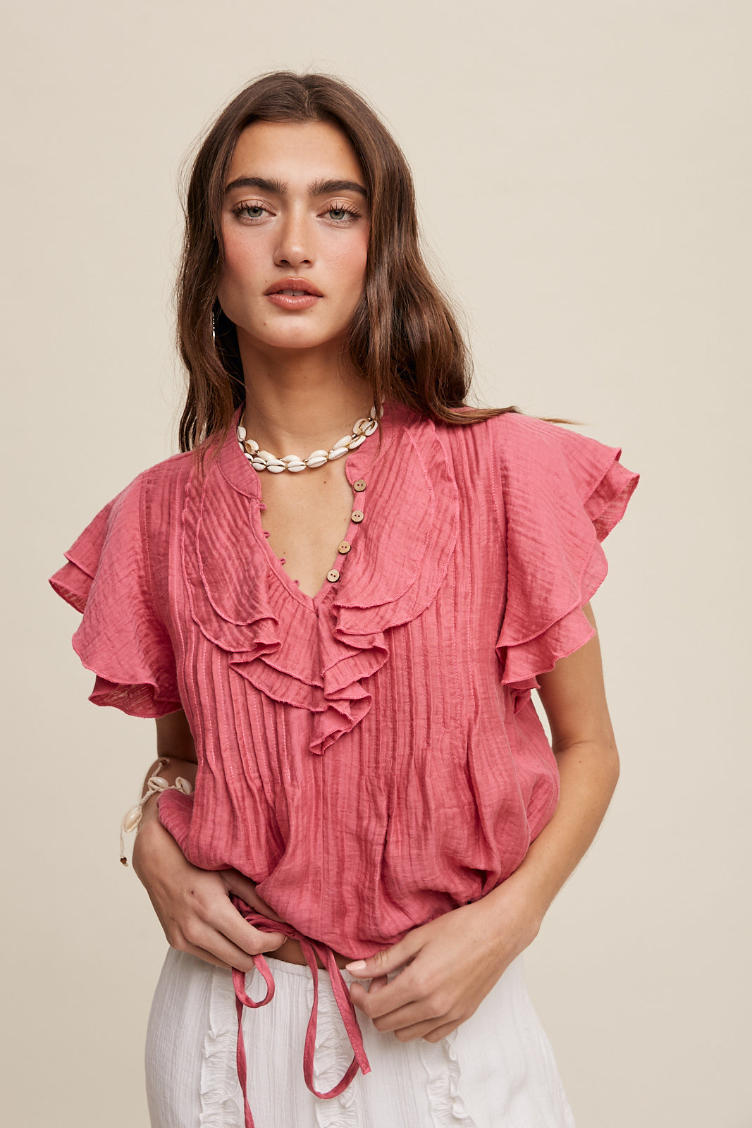 SKU: N/A Category: TOPS Tags: All Tops, Double layered collar and sleeve, front tie waist, Pleated Front, round neck, round neck top, round neckline, round neckline top, Ruffled Button-Up Front, self tie, self tie detail at waist, self tie top, self ties, Tops