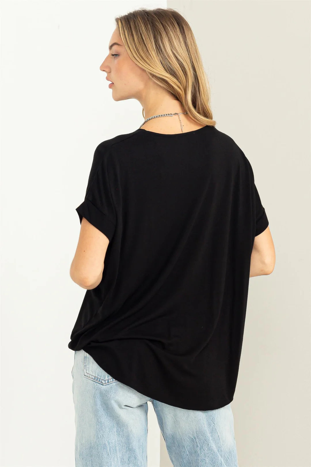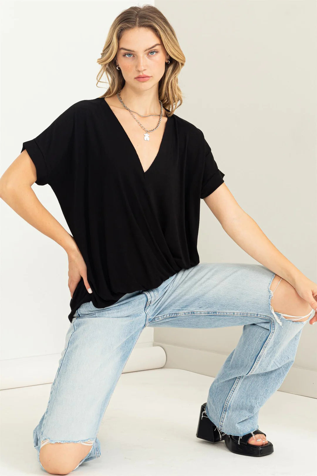 SKU: N/A Category: TOPS Tags: All Tops, oversized, oversized fit, oversized top, rounded hem, short sleeve, short sleeve top, Surplice v-neck top, top, Tops, v-neck, v-neck top, v-neckline, wide cut swing bodice
