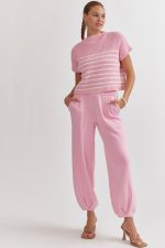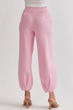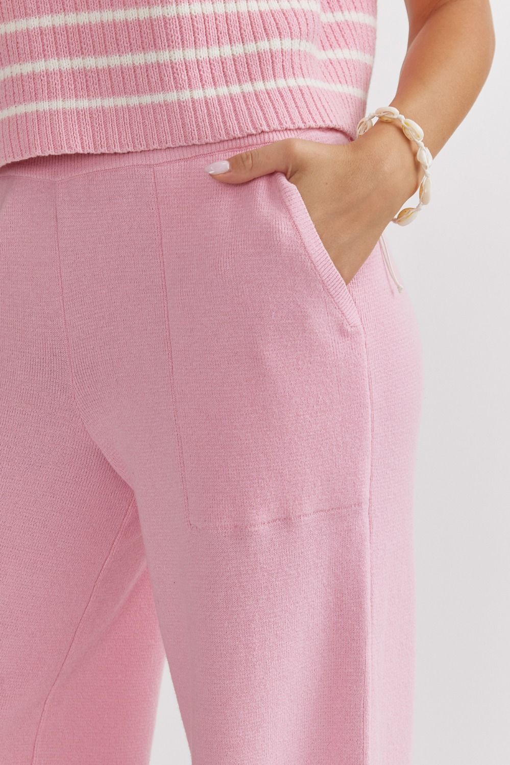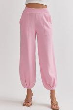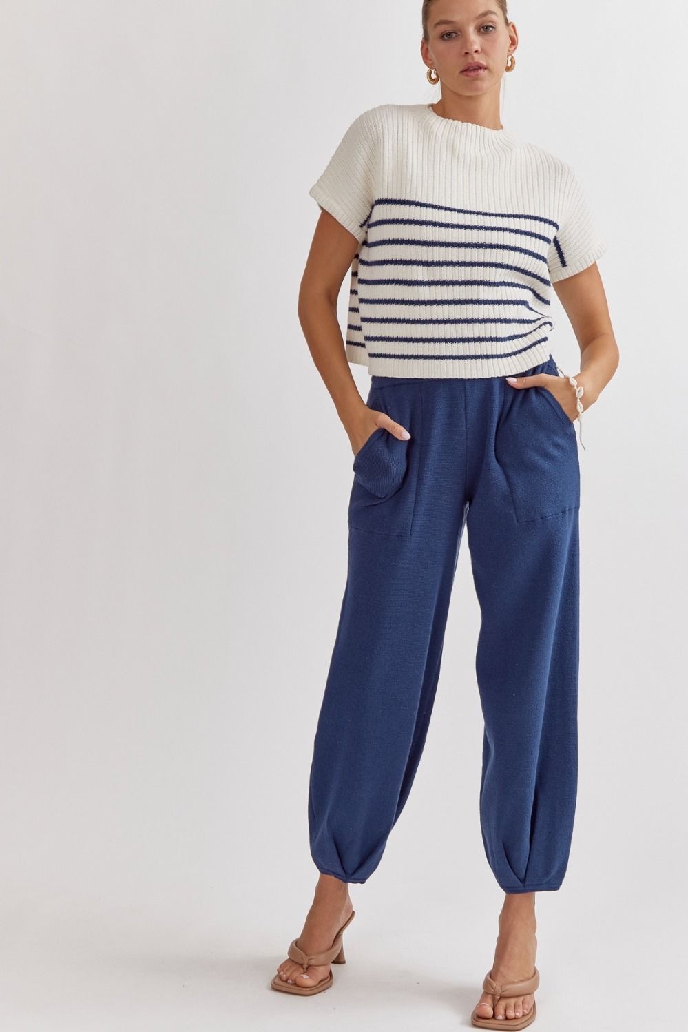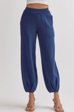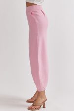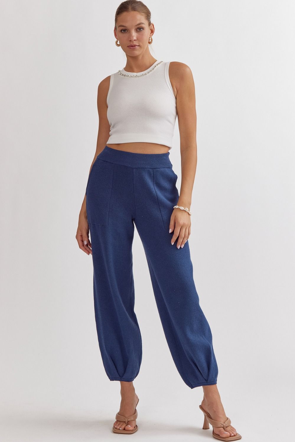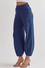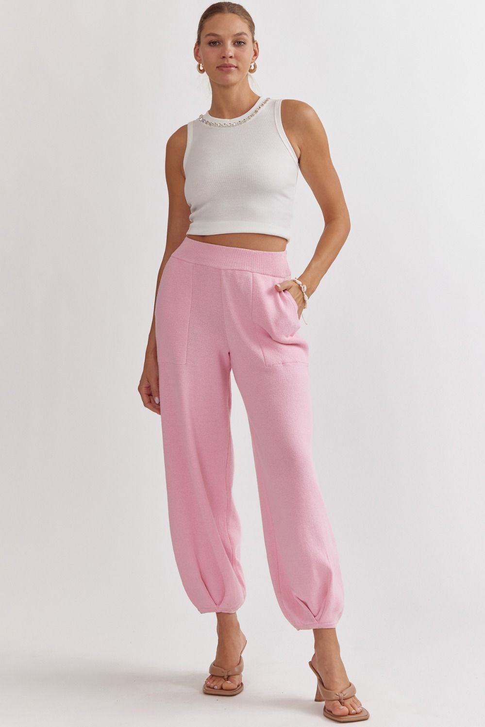 Solid knitted high-waisted joggers featuring elastic waist. Pockets at side. Unlined. Knit. Non-sheer. Lightweight.