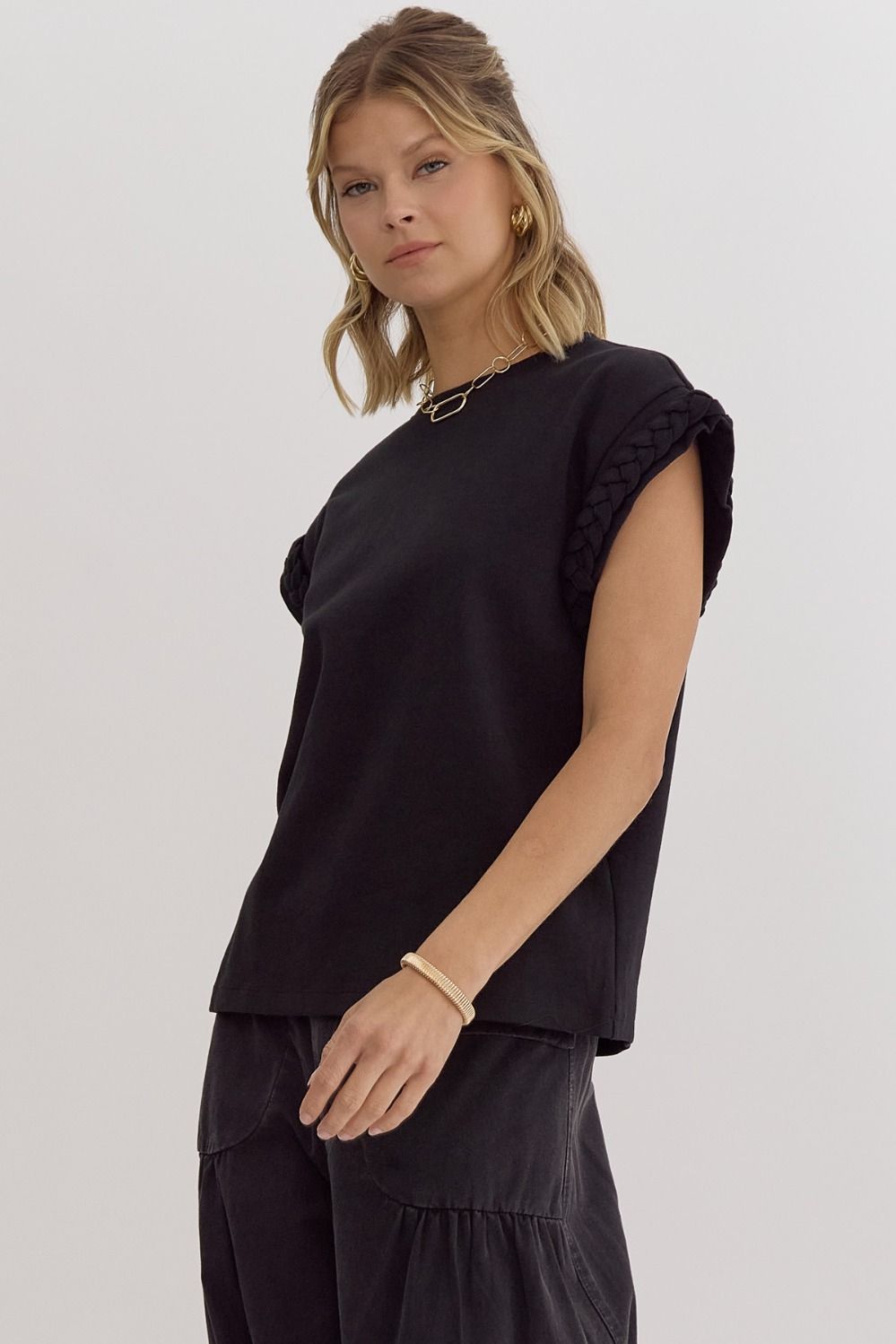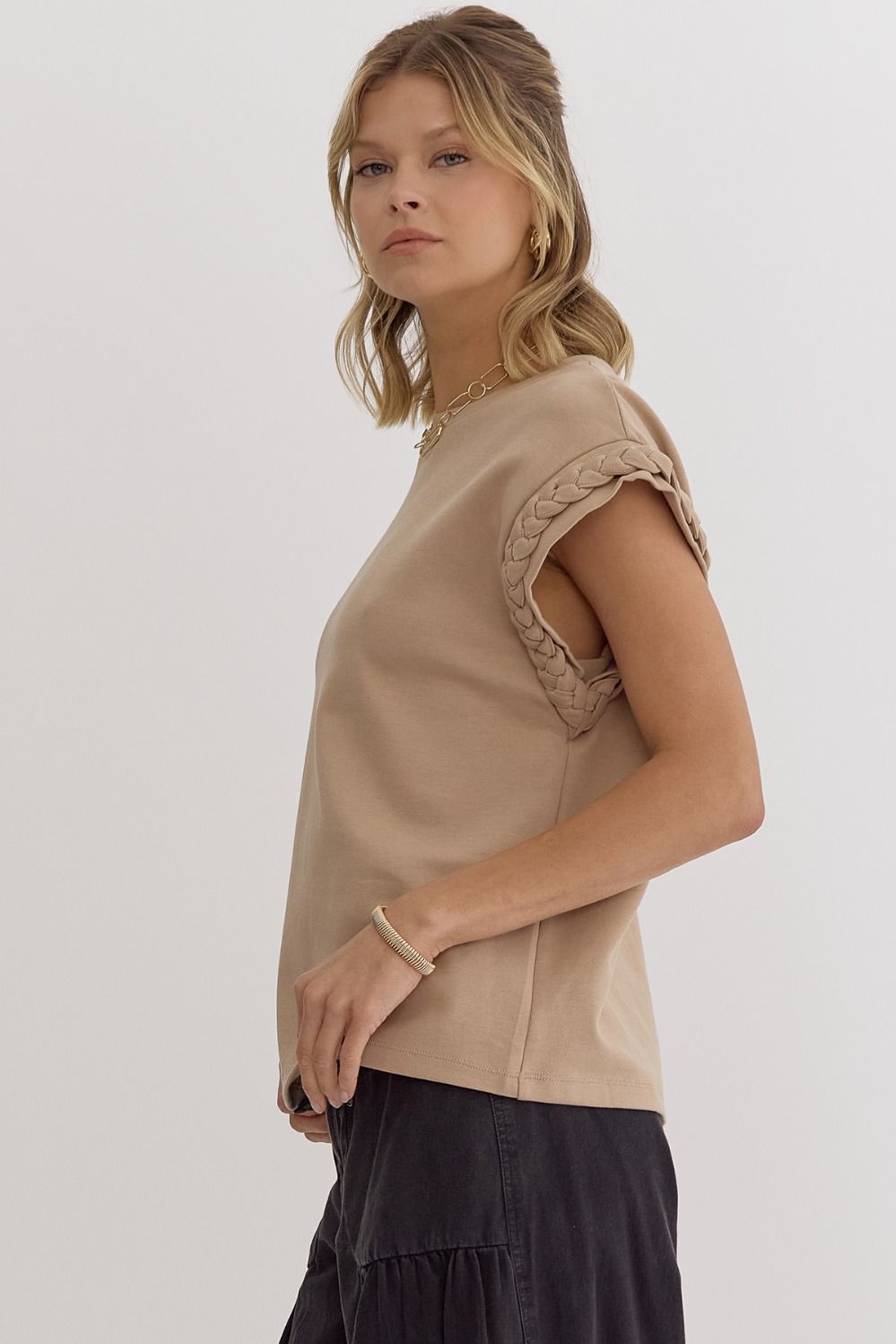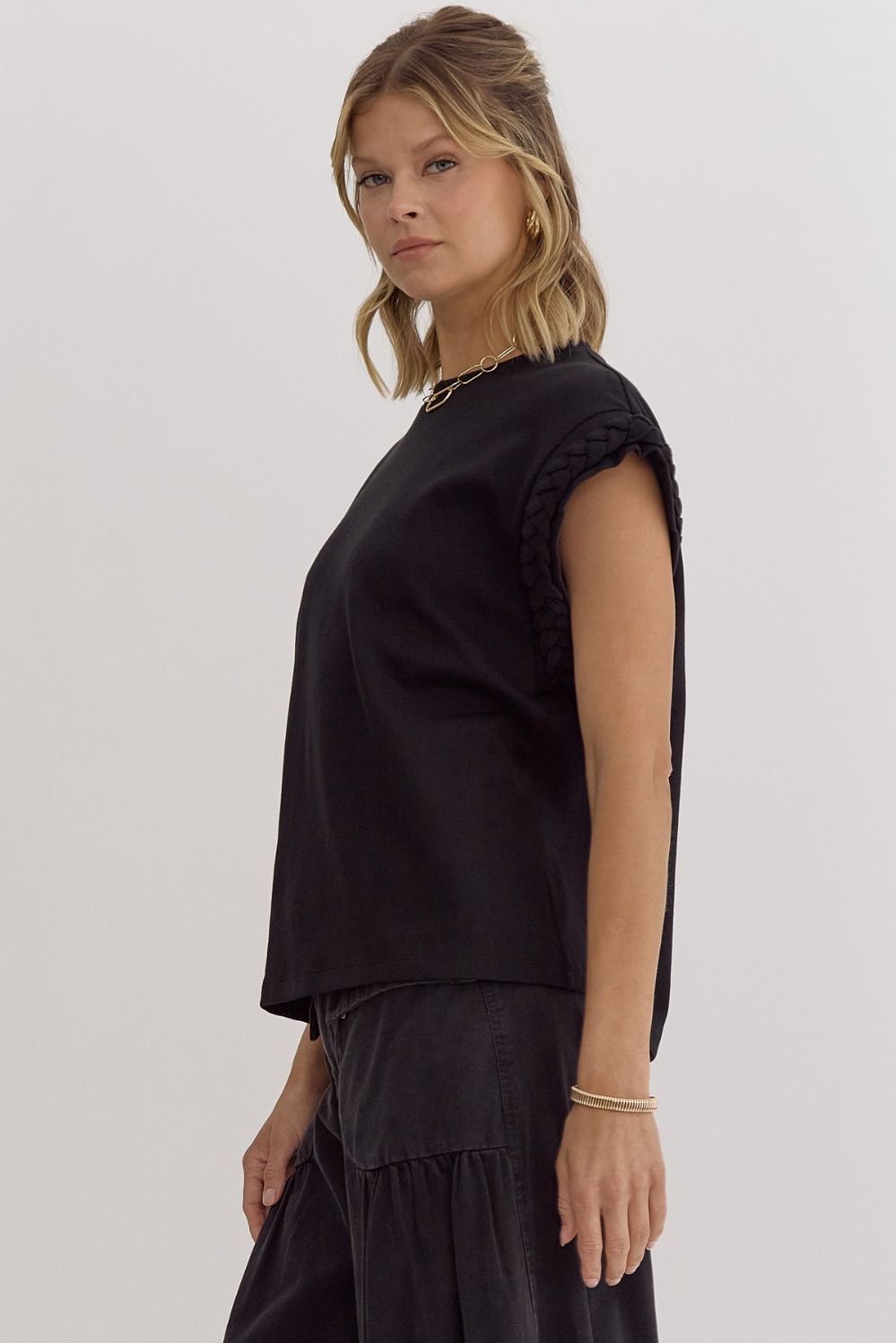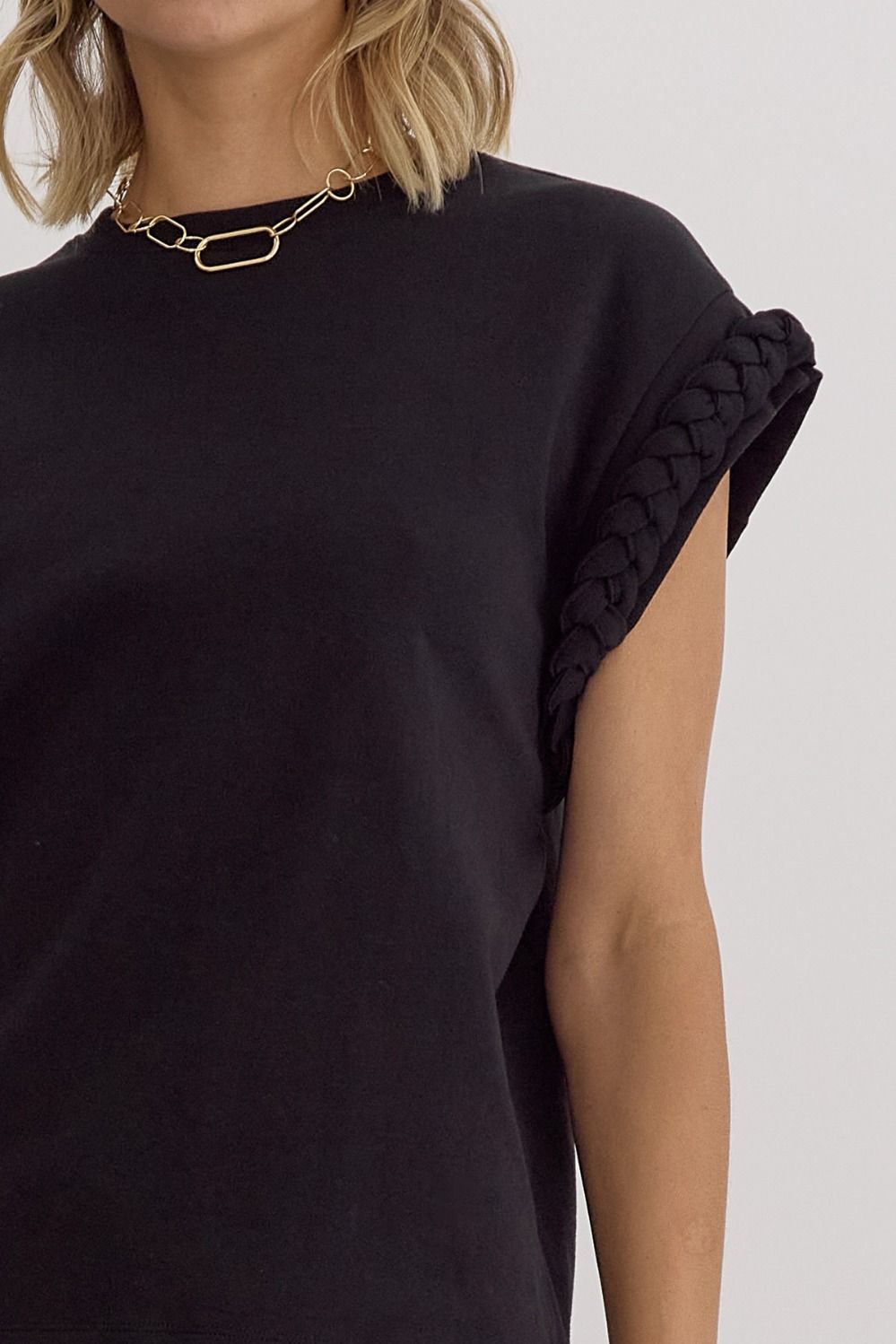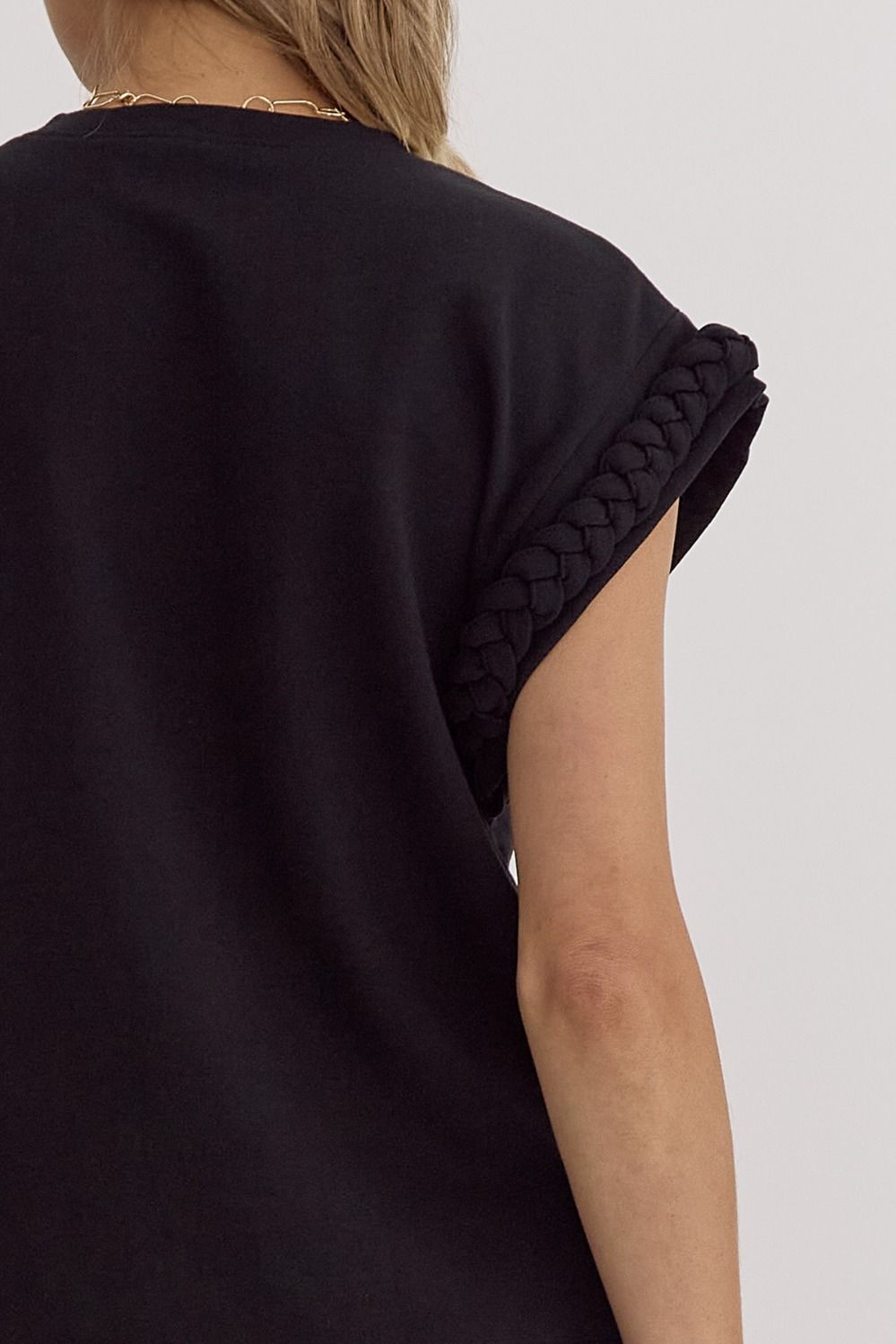 Solid round neck cap sleeve top featuring braided detail at cuff.