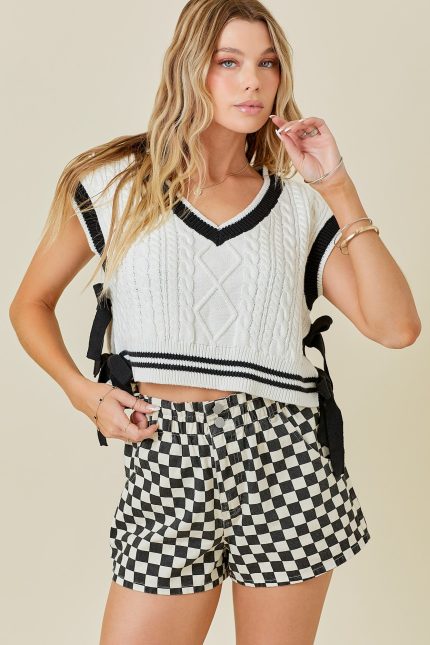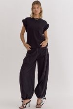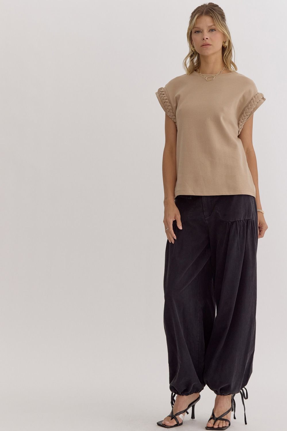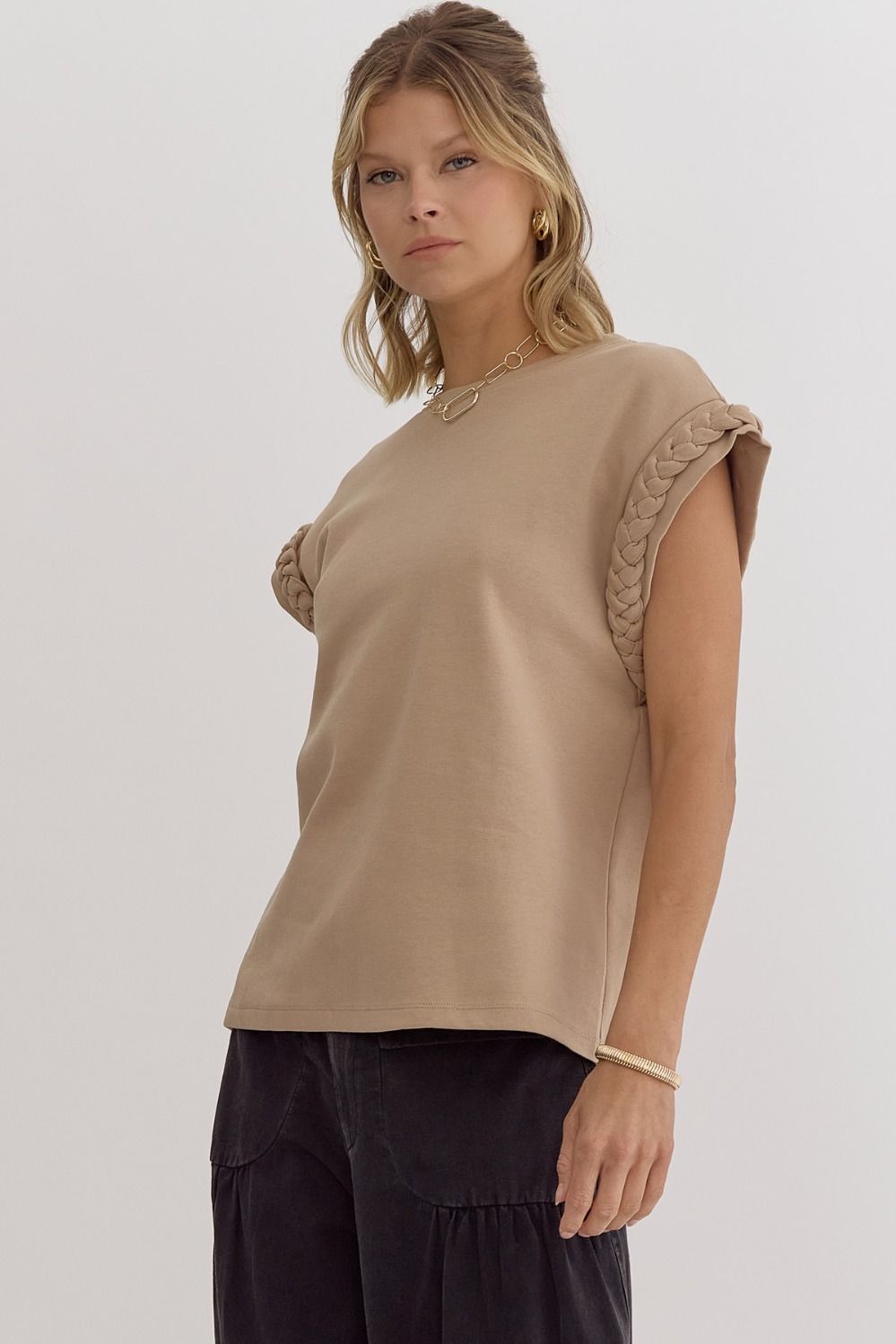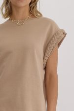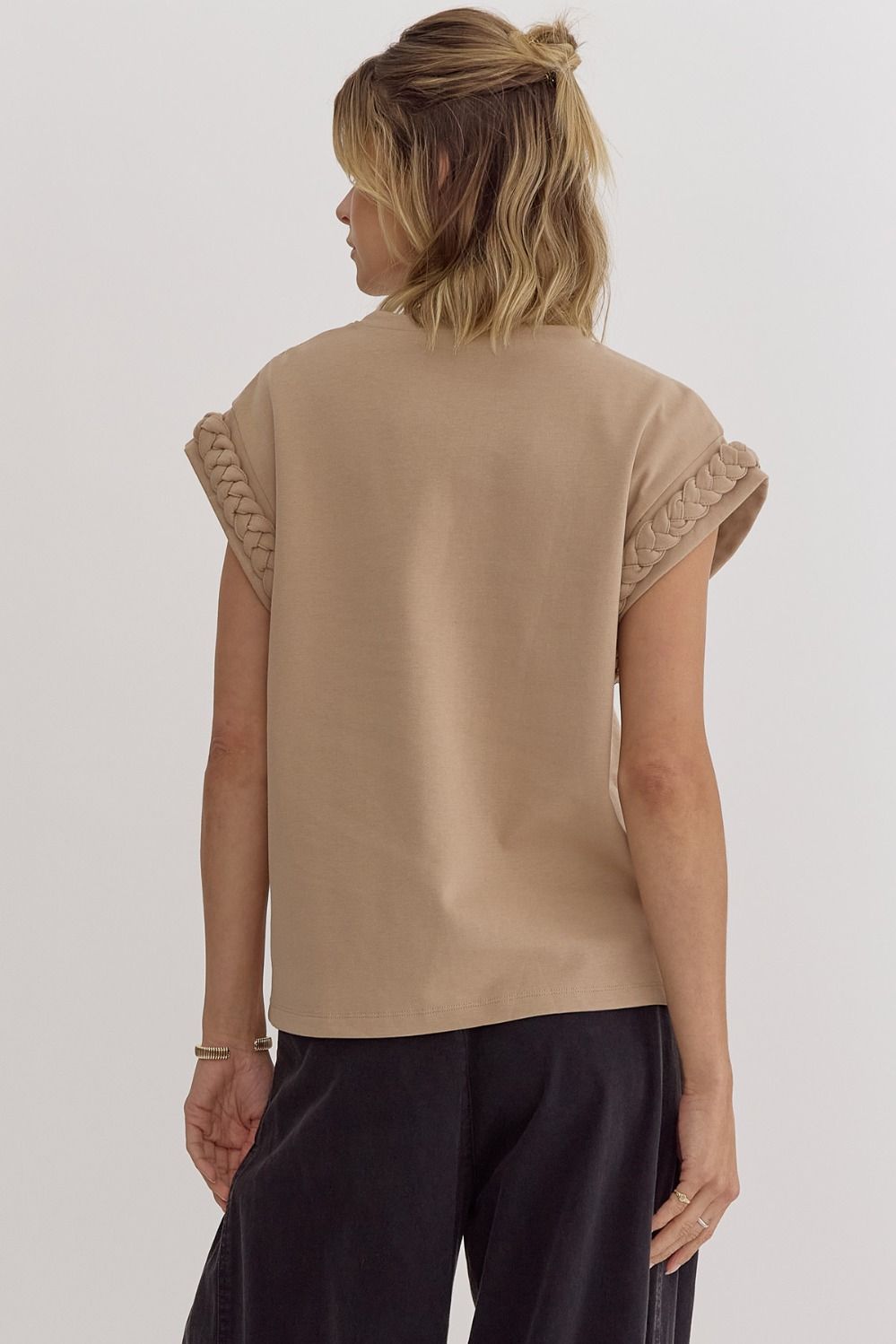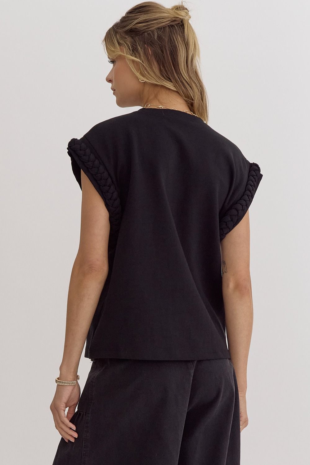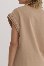 Solid round neck cap sleeve top featuring braided detail at cuff.