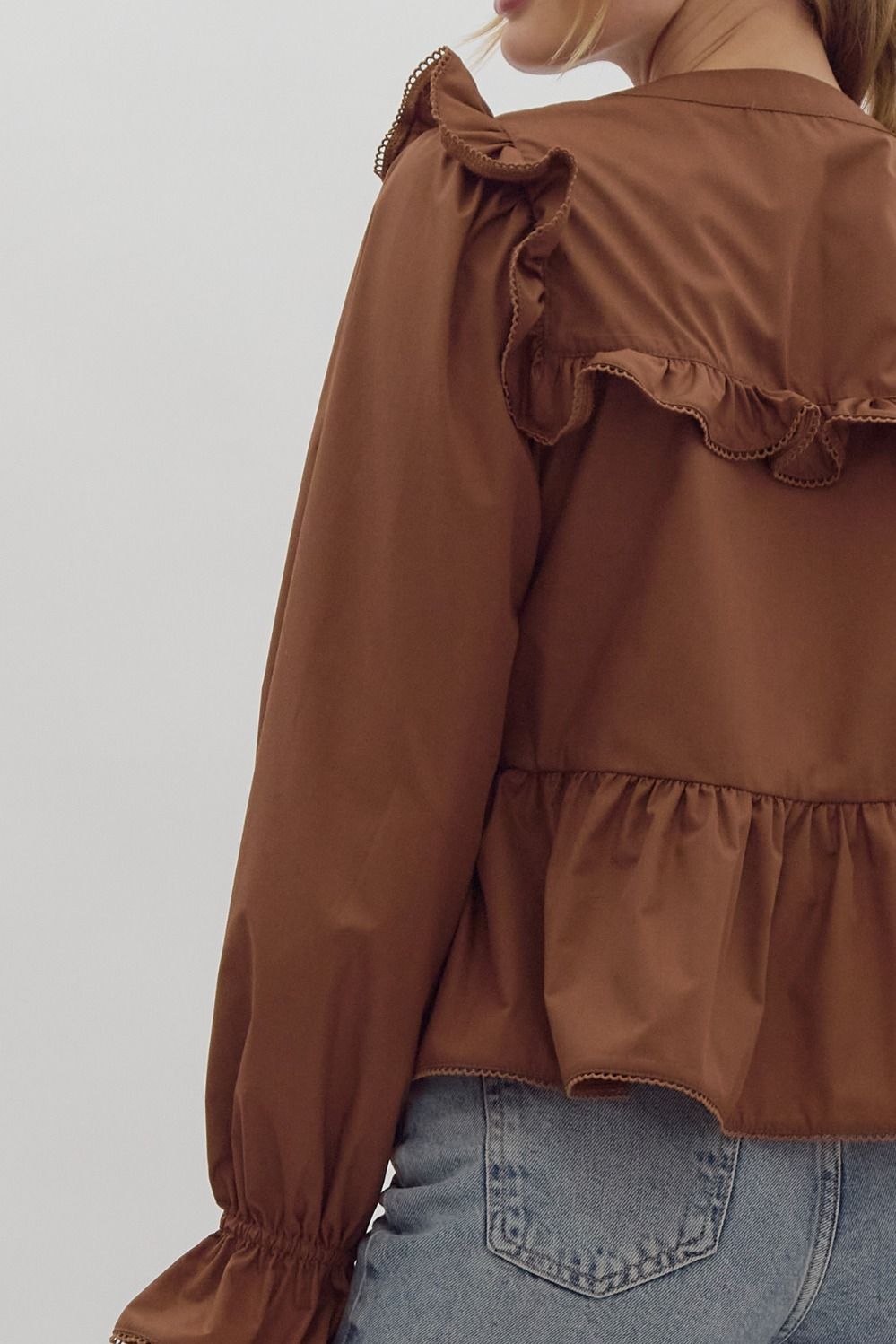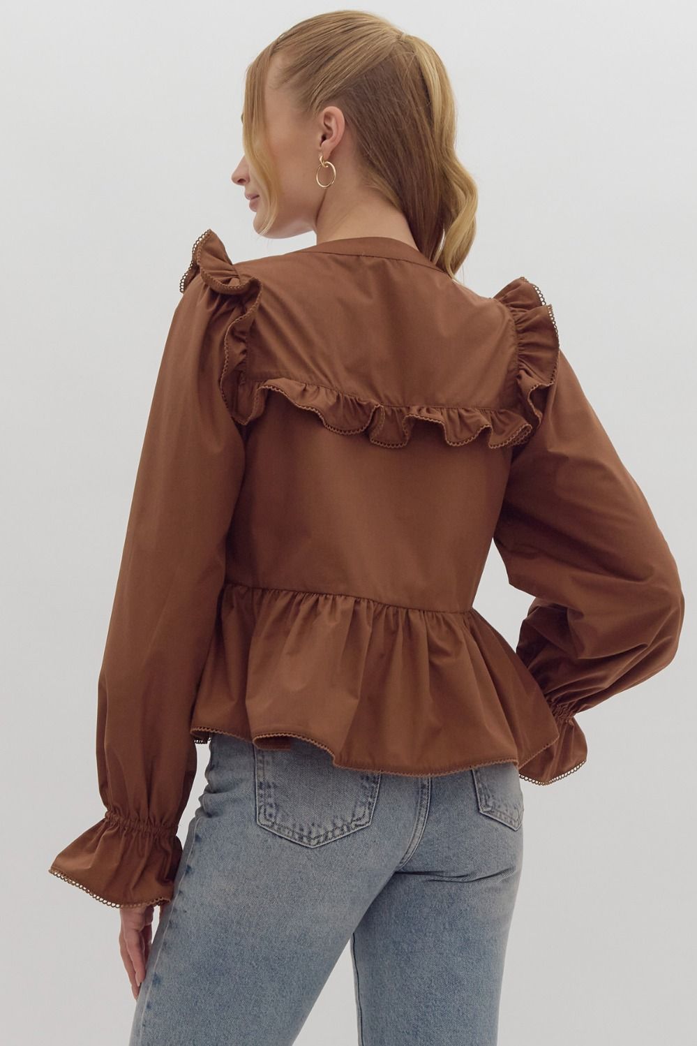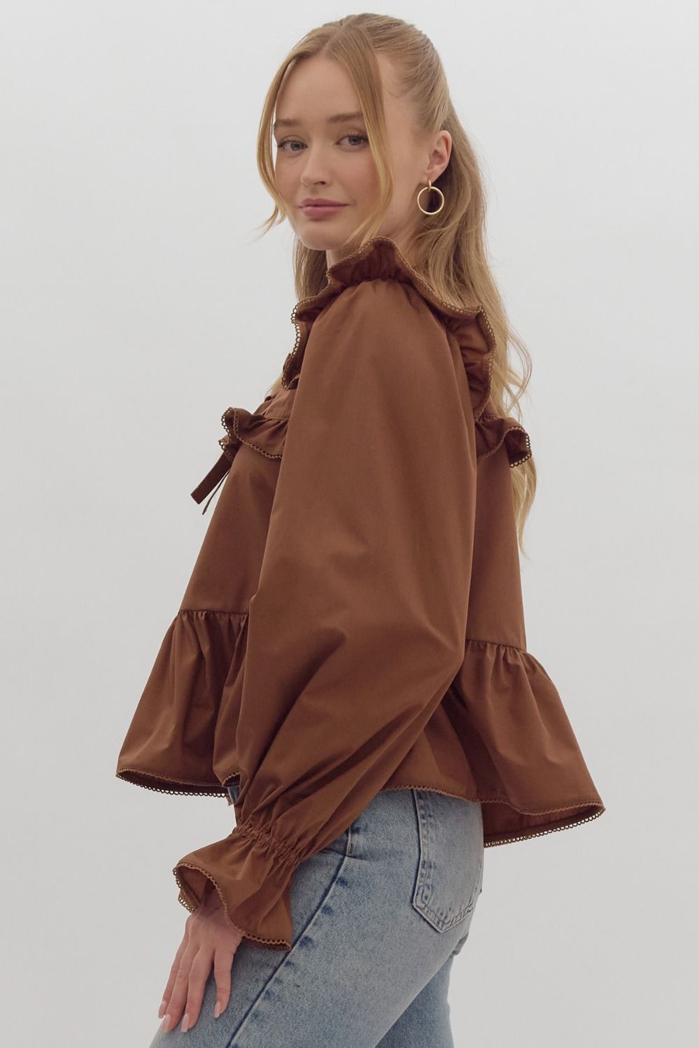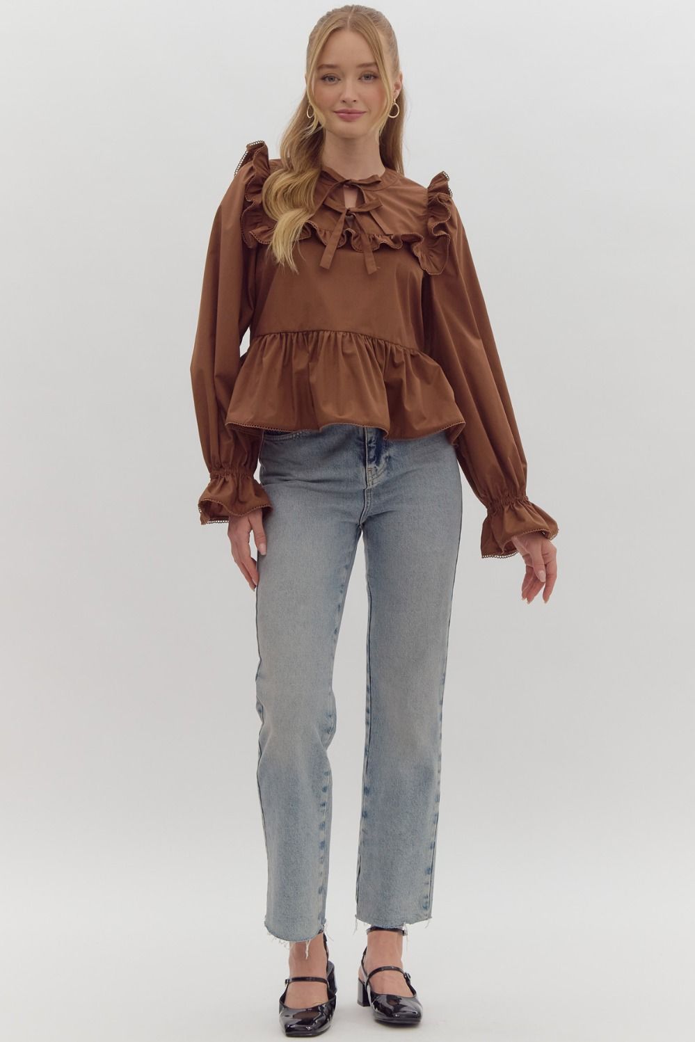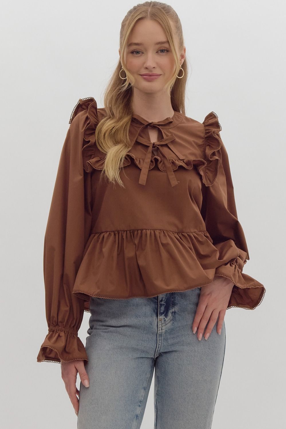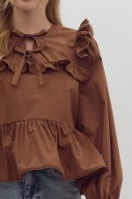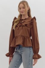 Solid round neck long sleeve peplum top featuring bow detail at neck.