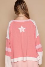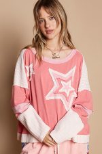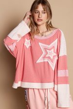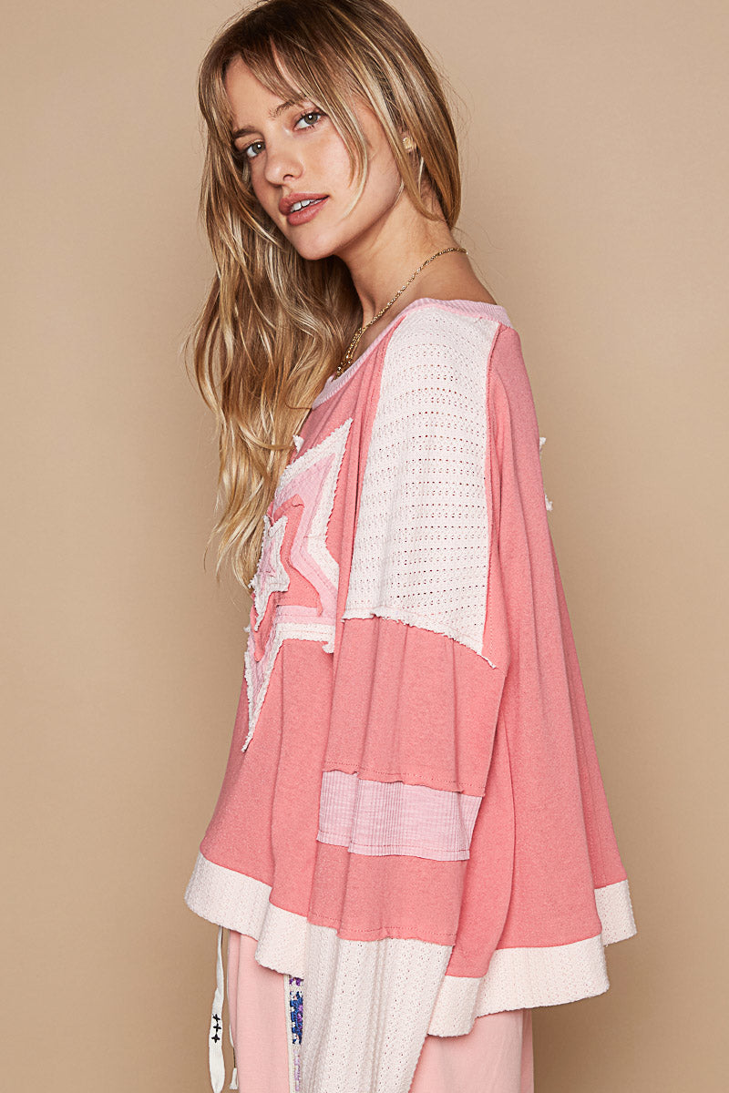 Designed in round-neckline oversized fit crop body length long sleeve knit top with star shape patch-work. featured in cotton.
