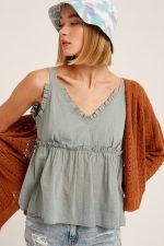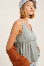 SKU: N/A Category: TOPS Tags: All Tops, camisole top, lined, lined top, ruffles, sleeveless, sleeveless top, Textured cotton V-neck ruffle camisole top, Tops, v-neck, v-neck top, v-neckline