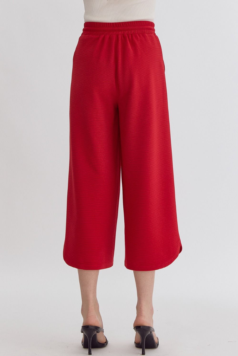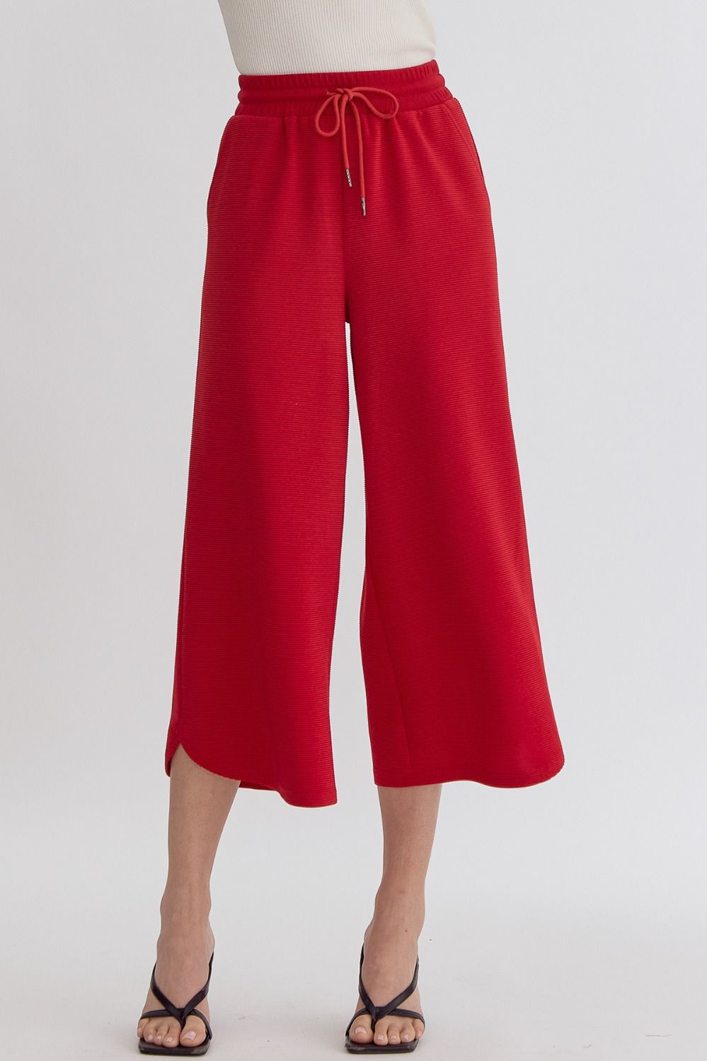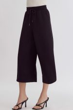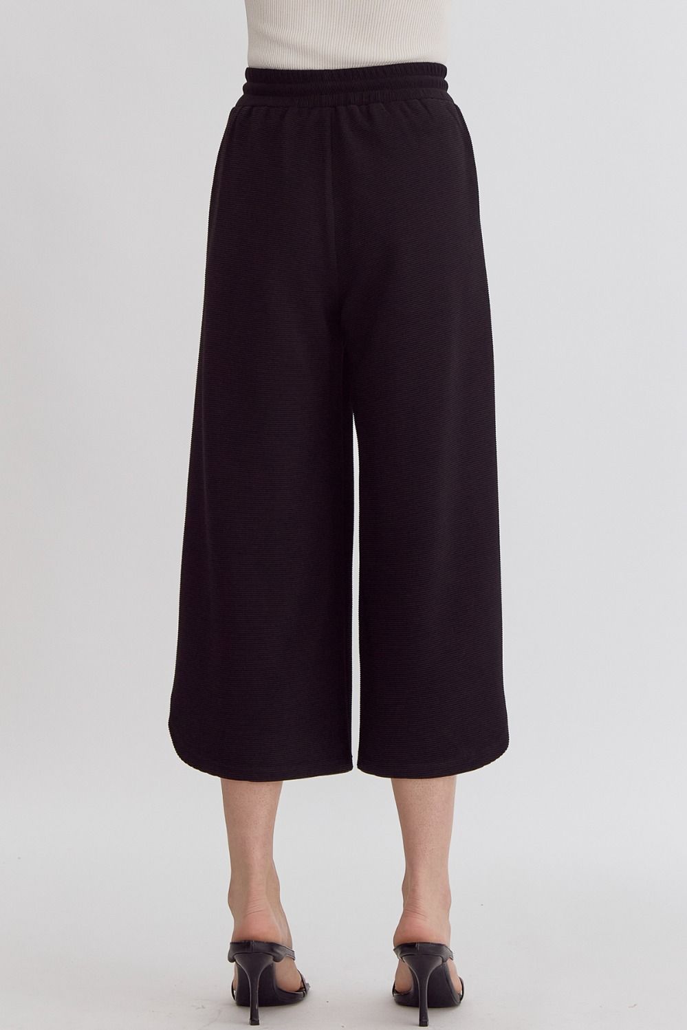Textured solid high waisted wide leg pants featuring elastic and self tie at waist.
