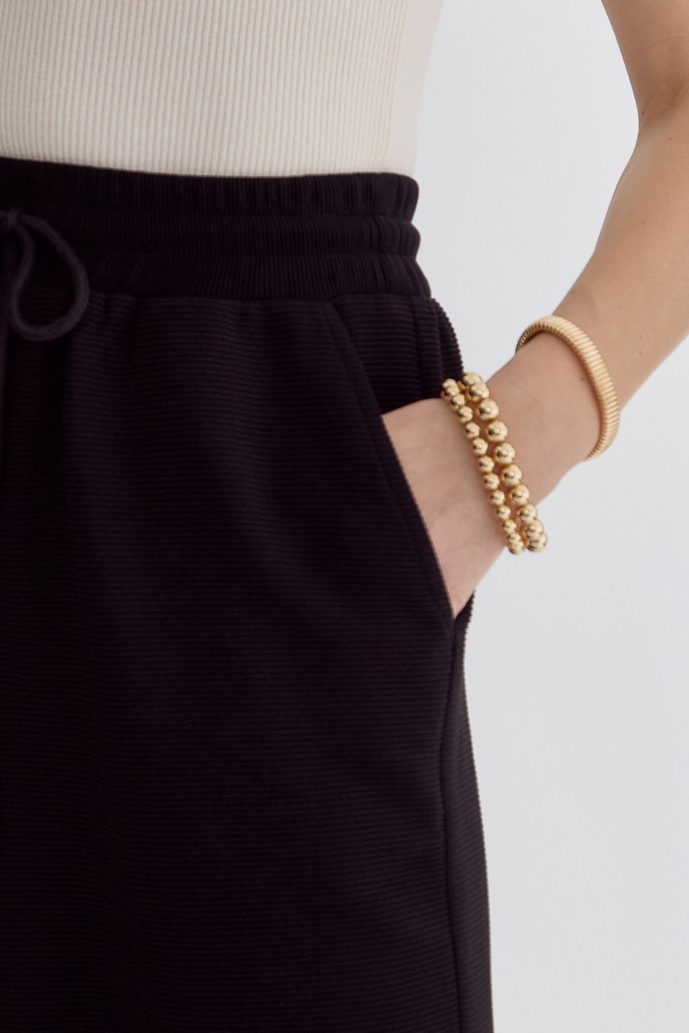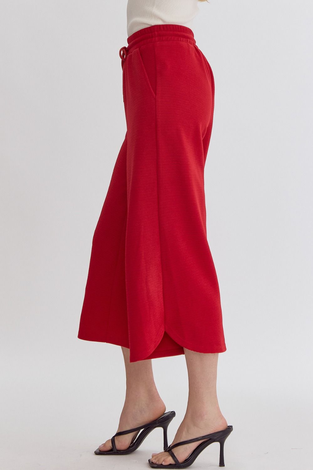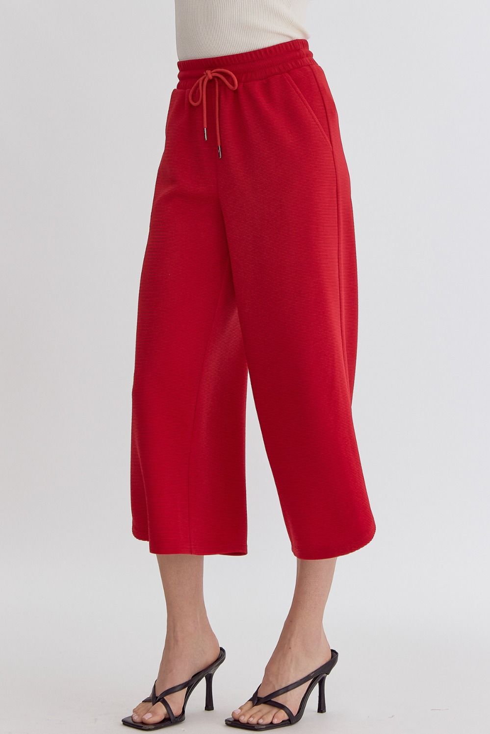 Textured solid high waisted wide leg pants featuring elastic and self tie at waist.