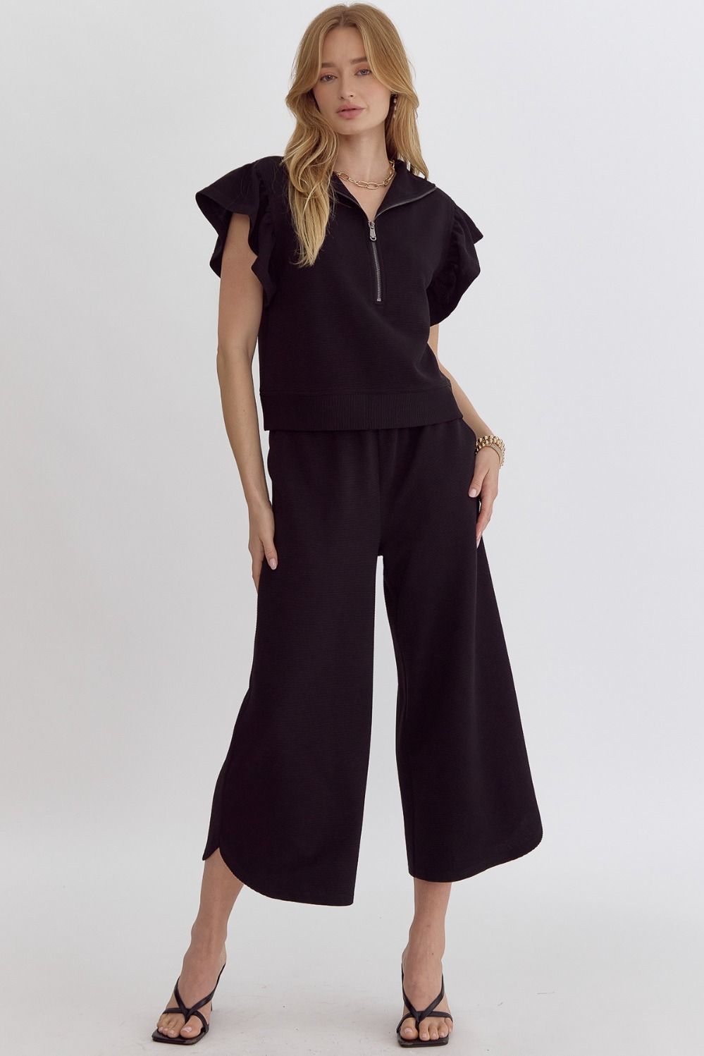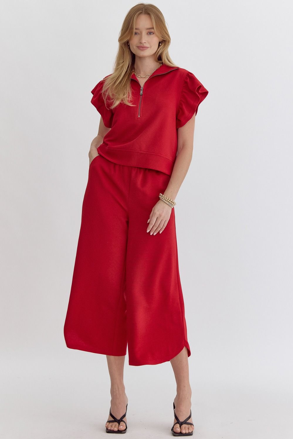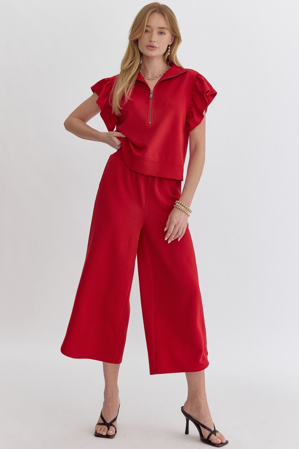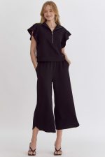 SKU: N/A Category: TOPS Tags: All Tops, bottom, Bottoms, comfy pants, elastic, elastic waist, elastic waistband, elastic waistband pants, high waisted wide leg pants, lounge set, pant set, Pants, ruffle sleeve, ruffle sleeve top, textured, textured pants, top, Tops, wide leg pants