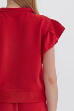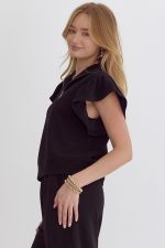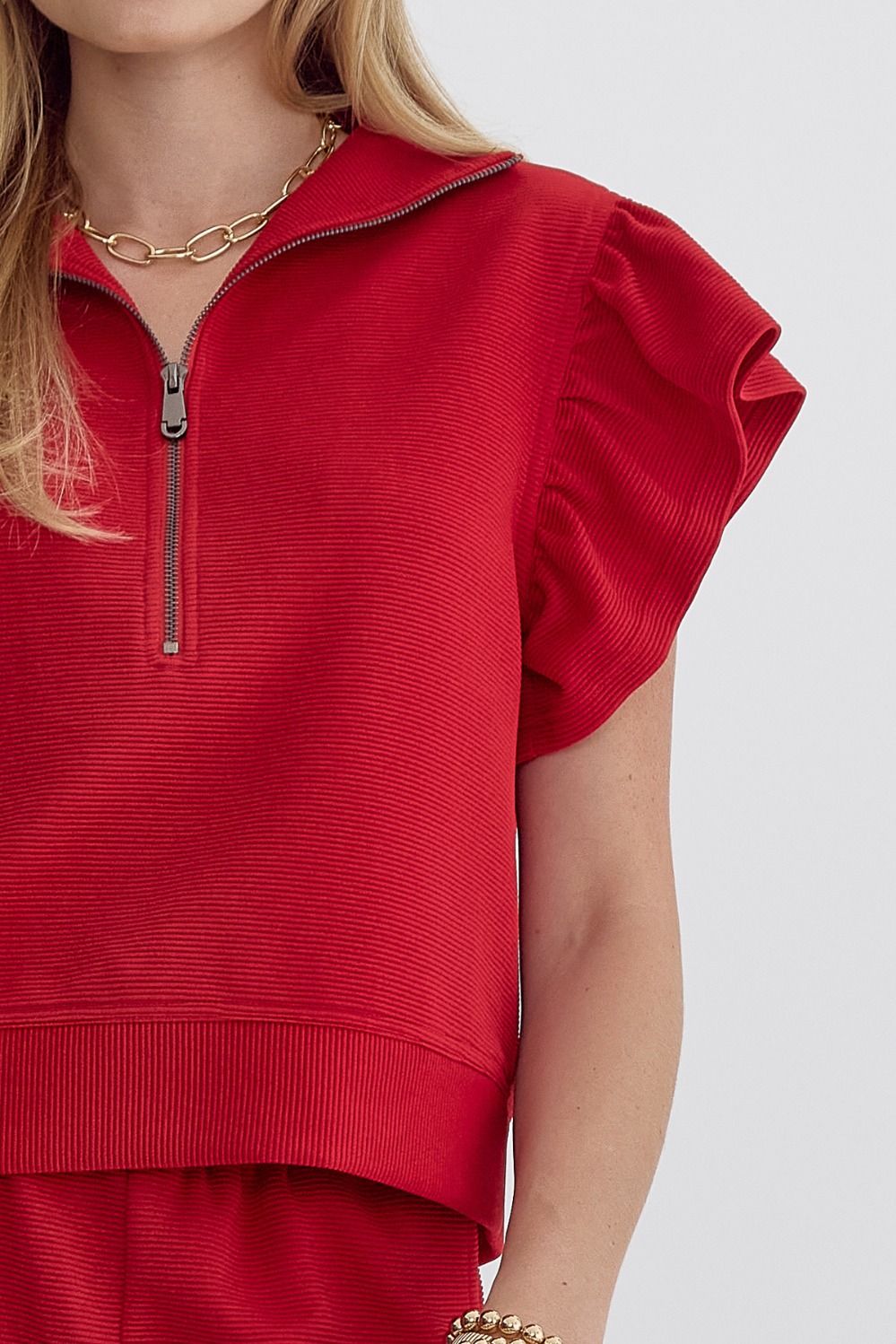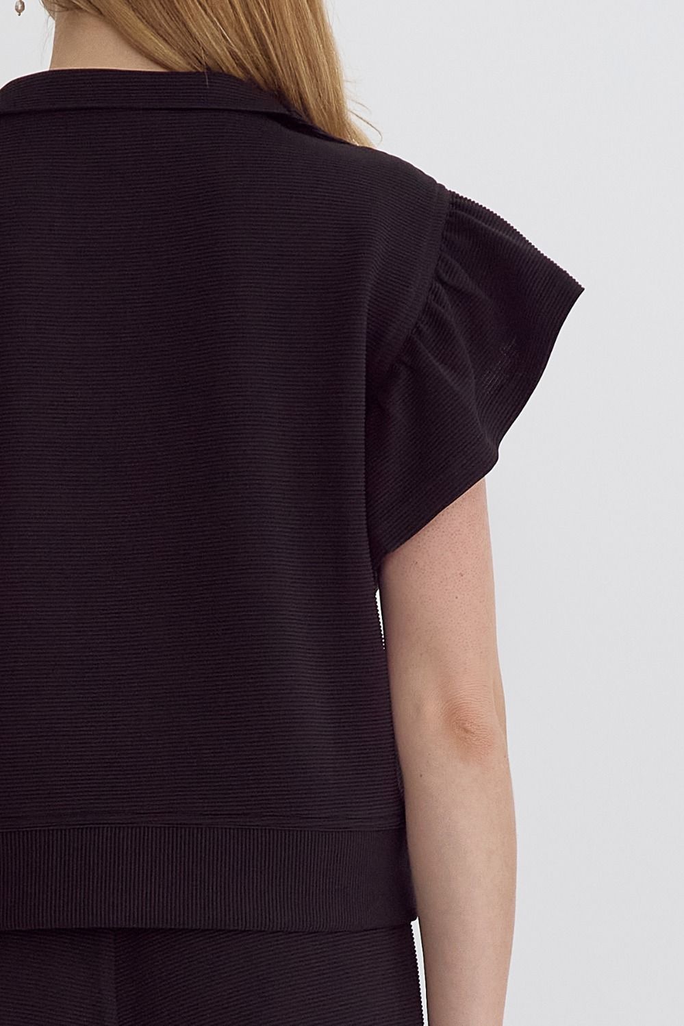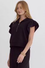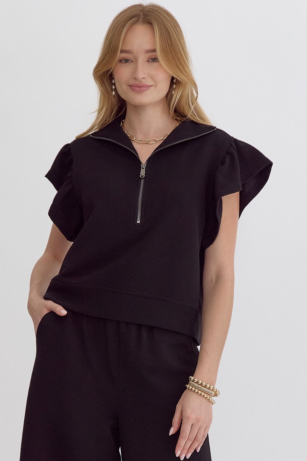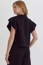 Textured solid ruffle sleeve top featuring zipper closure at front.