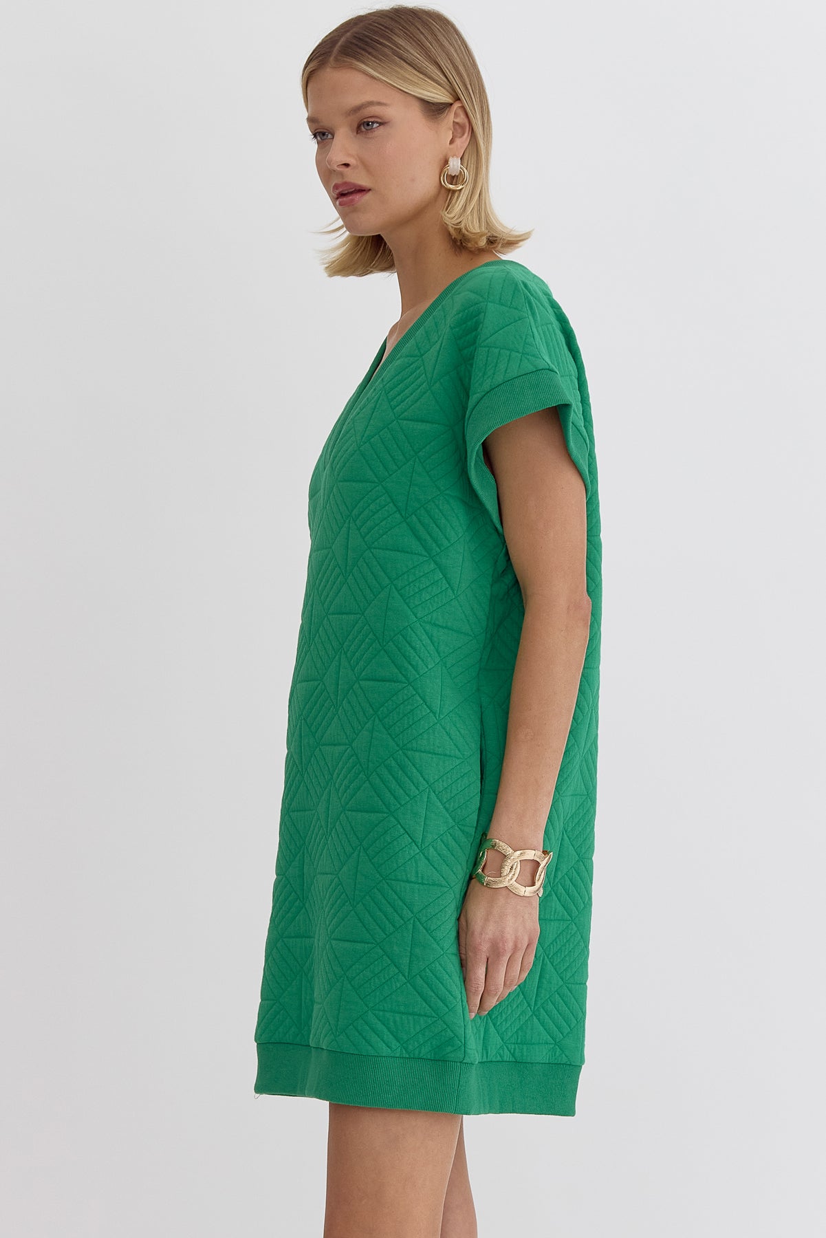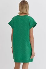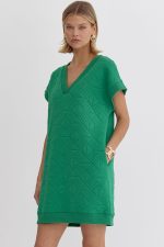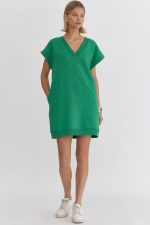 Textured solid v-neck short sleeve mini dress featuring pocket at sides.