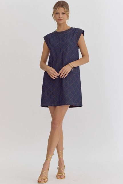 Denim round neck sleeveless mini dress featuring top stitching. Zipper closure at back. Pocket at sides. Unlined. Woven. Non-sheer. Lightweight.