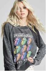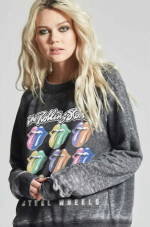 Hit the road with The Rolling Stones with our “Steel Wheels Tour” sweatshirt. This vintage inspired sweatshirt features authentic tour graphics on the front, and “The North American Tour 1989” on the back. Let’s rewind the clock and dance through the decades with these rock and roll legends. This tour sweatshirt features authentic graphics with a Recycled Karma twist. Made with vintage washed fabric, ribbed hems, a relaxed crew neckline, and an oversized fit.