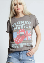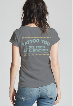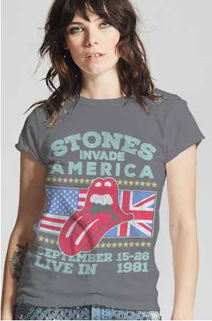 “Tattoo You” is The Rolling Stones’ 16th British and 18th American studio album which was released in 1981. This vintage style tee features the album artwork from their 40th anniversary edition album for “Tattoo You”. With graphics on the front “Stones Invade America” a the back “Tattoo You at JFK”. Made with soft cotton fabric, rolled sleeves, a ribbed crew neckline, distressed hems, and a slim fit.