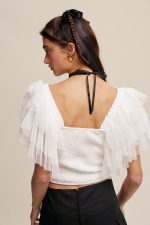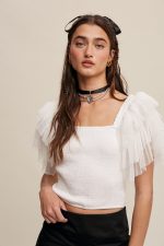 SKU: N/A Category: TOPS Tags: All Tops, Finished with clean hem, Layered ruffle, Layered ruffle shoulder strap, Mesh layered ruffle sleeves, smocking detail, smocking on body, square neck, Square neck top, Square neckline, Tops