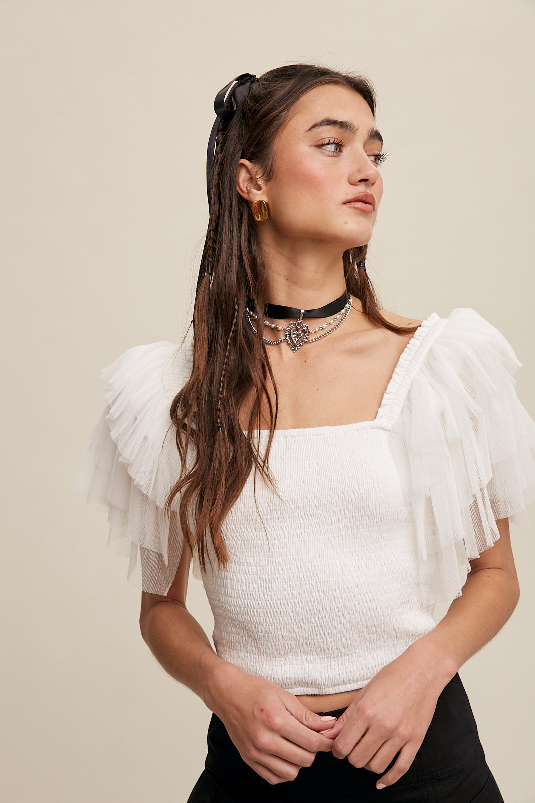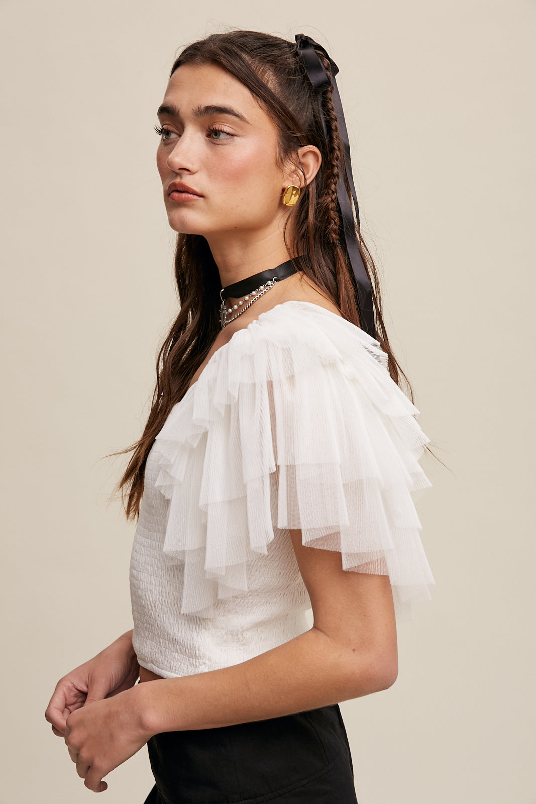 • Mesh layered ruffle sleeves