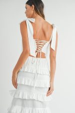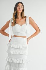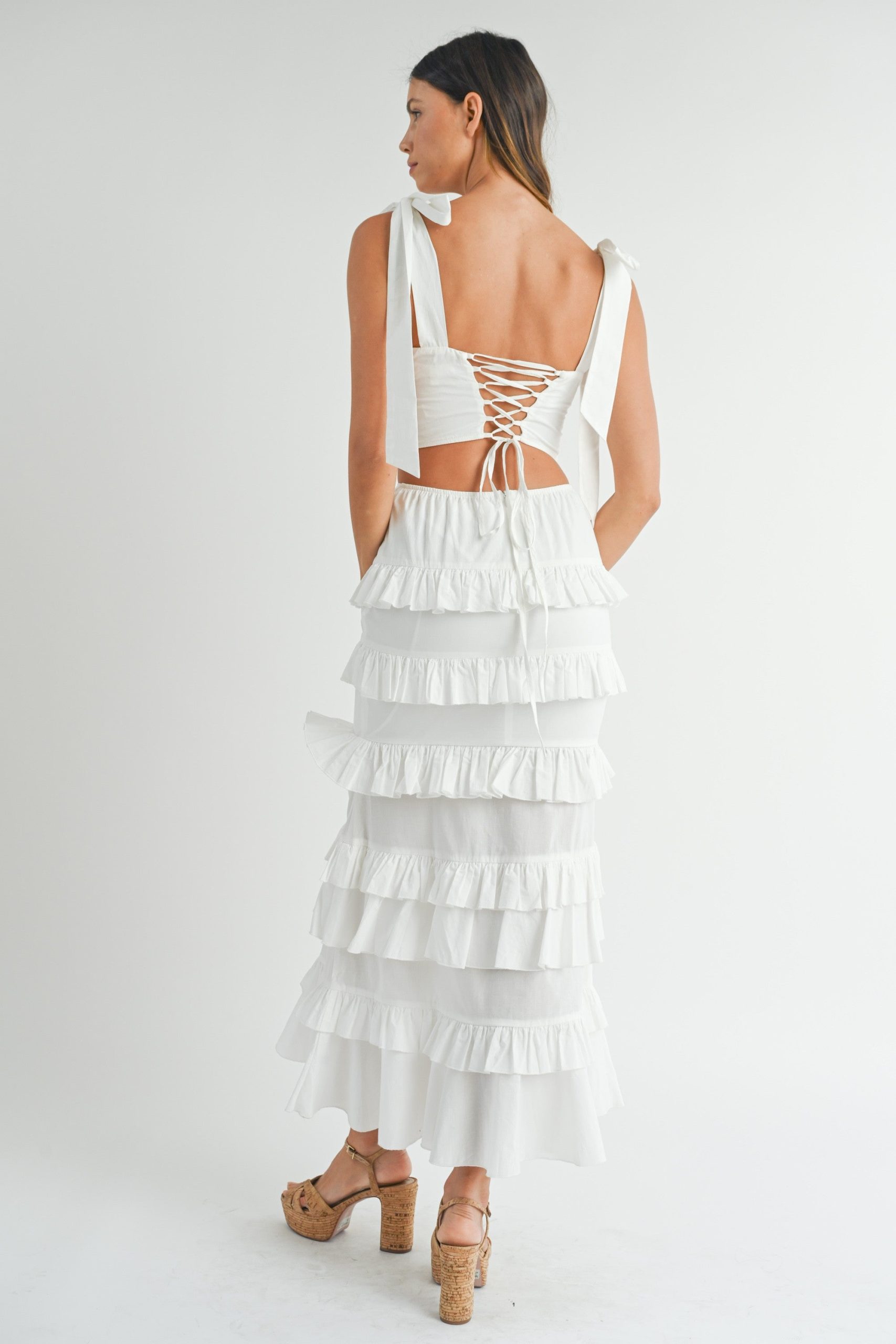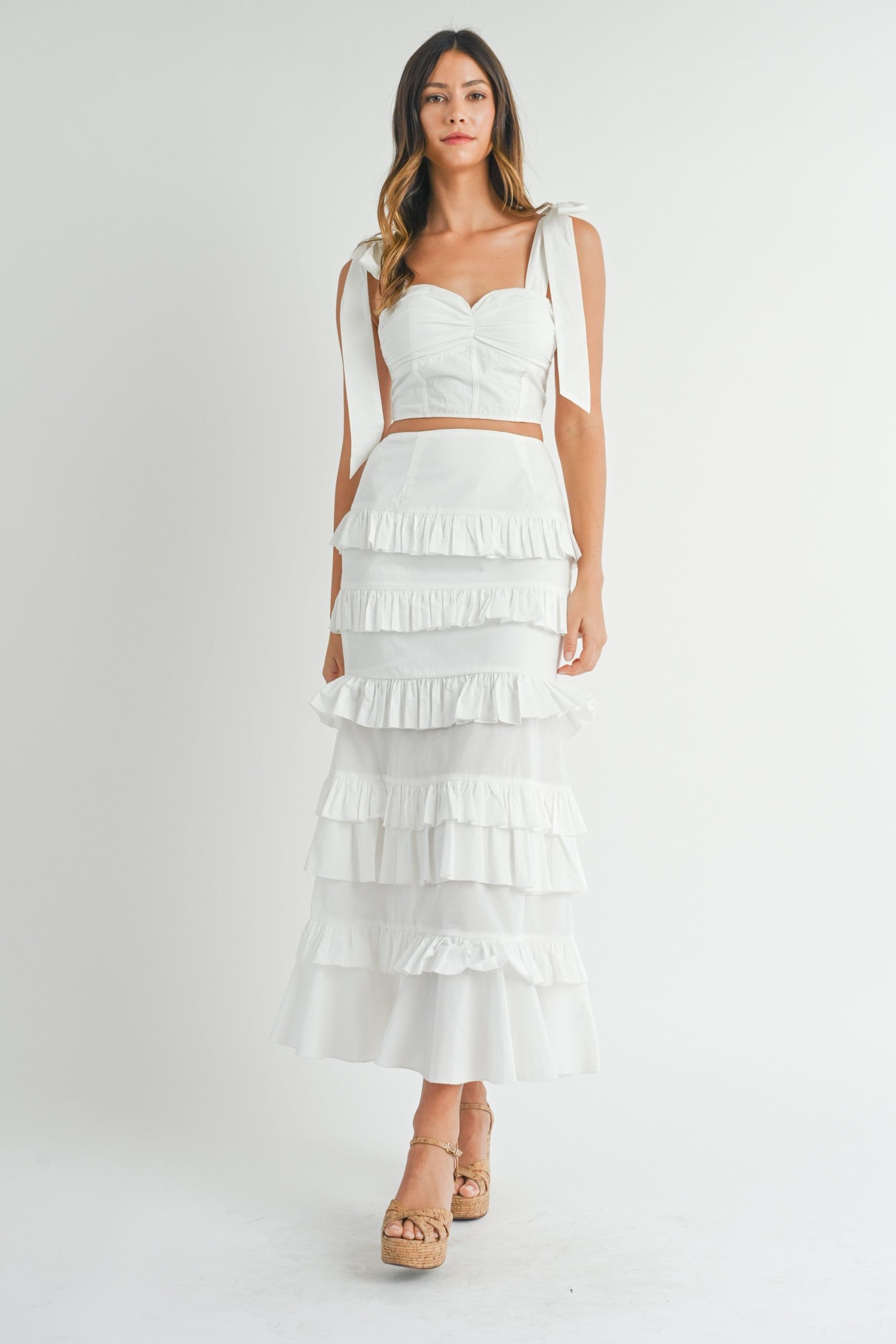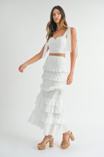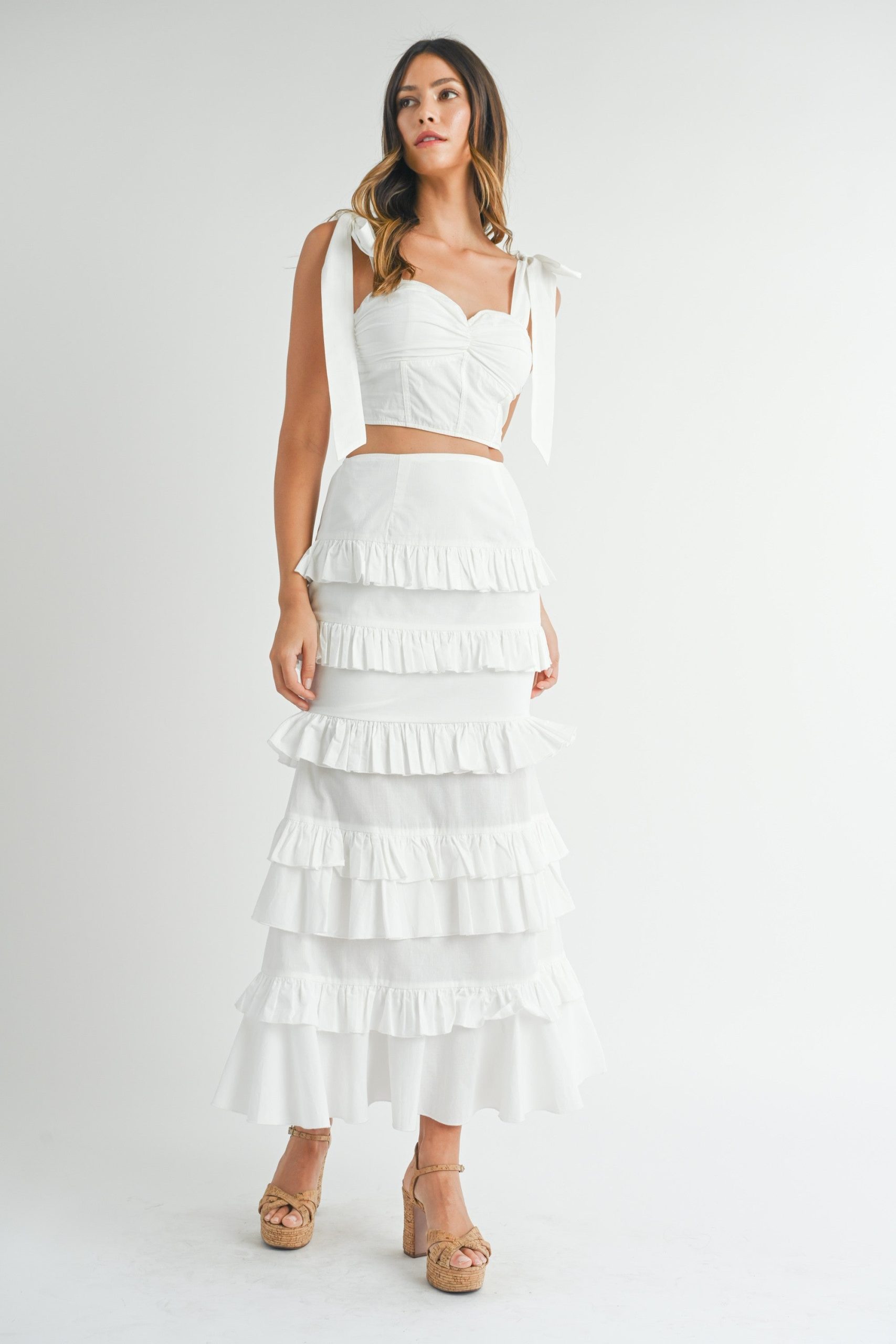 Solid poplin self-tie shoulder trap sweetheart neckline crop top with back lace up and matching ruffle tier maxi skirt set.