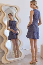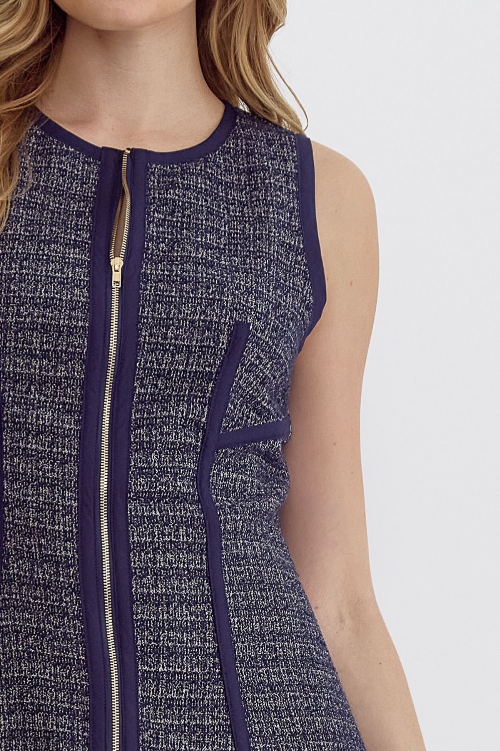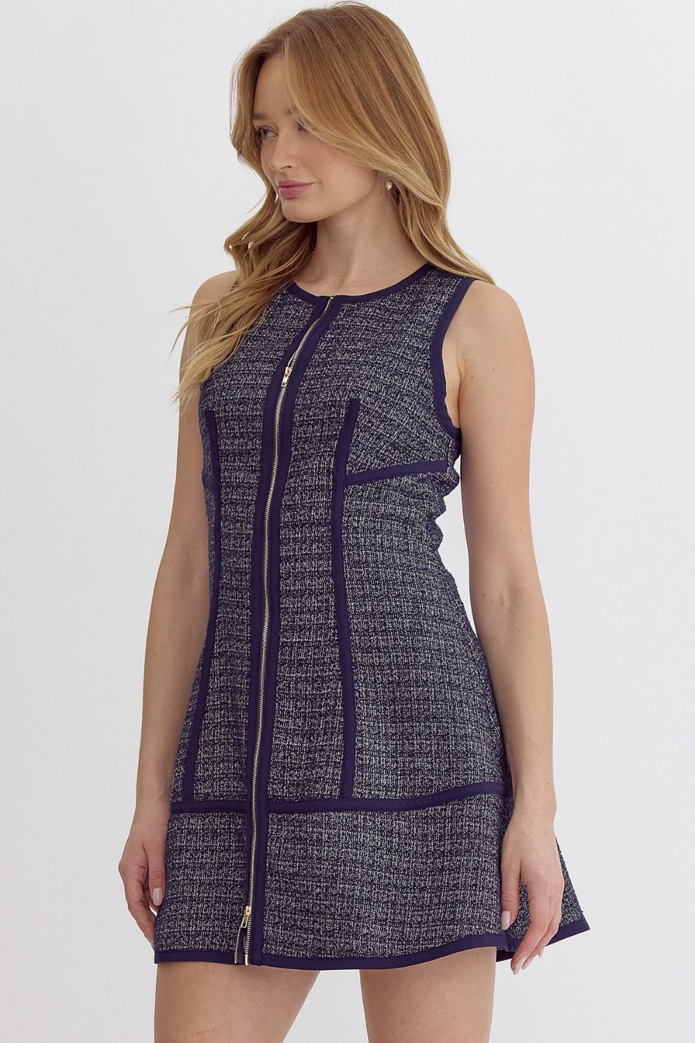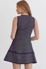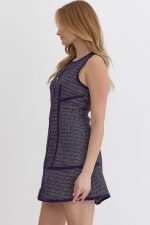 Tweed round neck sleeveless mini dress featuring contrast stitching.