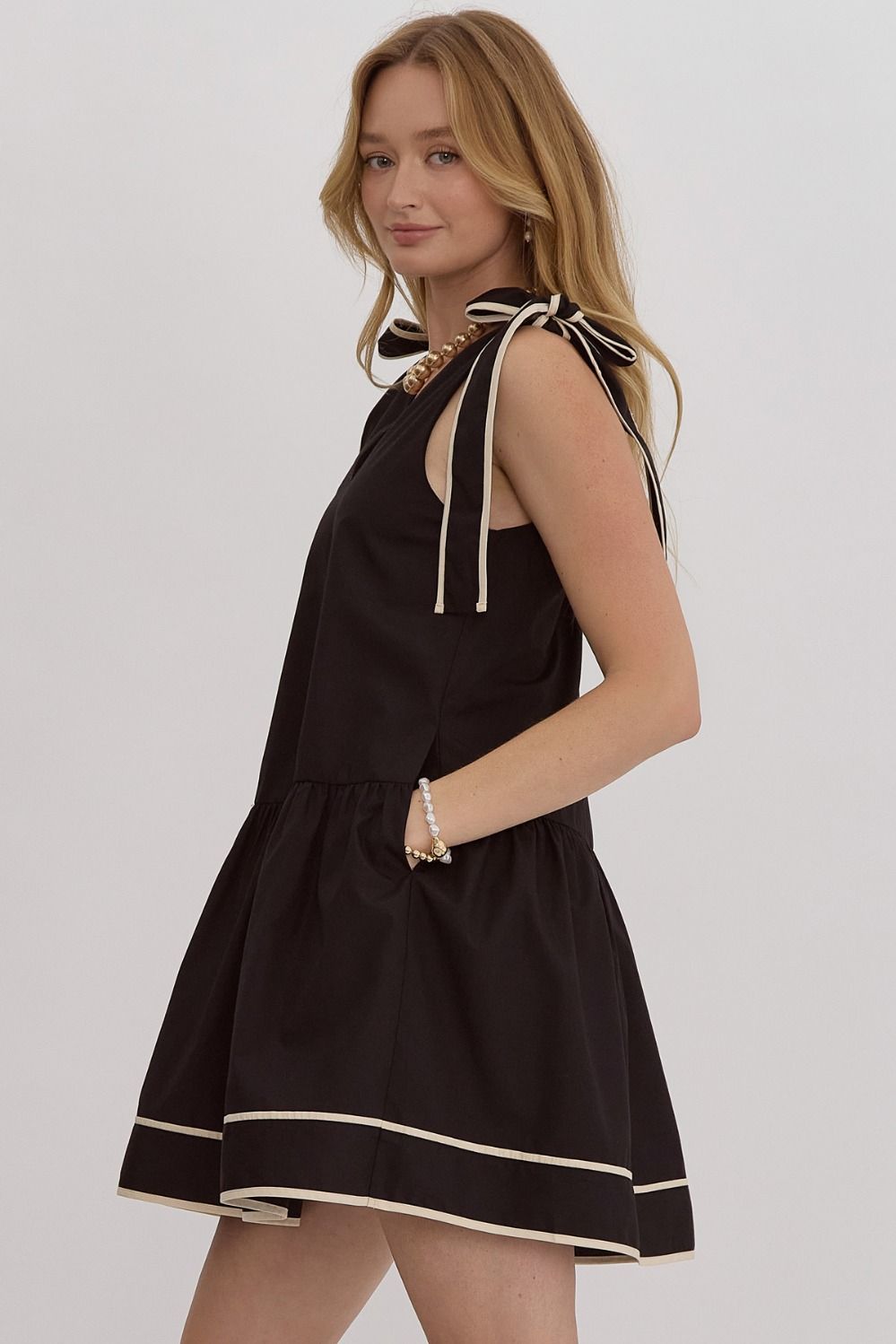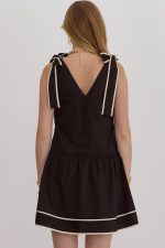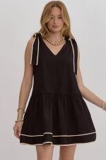 SKU: N/A Category: MINI Tags: lightweight, lightweight dress, lined mini dress, mini dress, pockets, ric rac trim mini dress, self tie, self tie at shoulder, side pockets, sleeveless mini dress, v-neck, v-neck mini dress, v-neckline