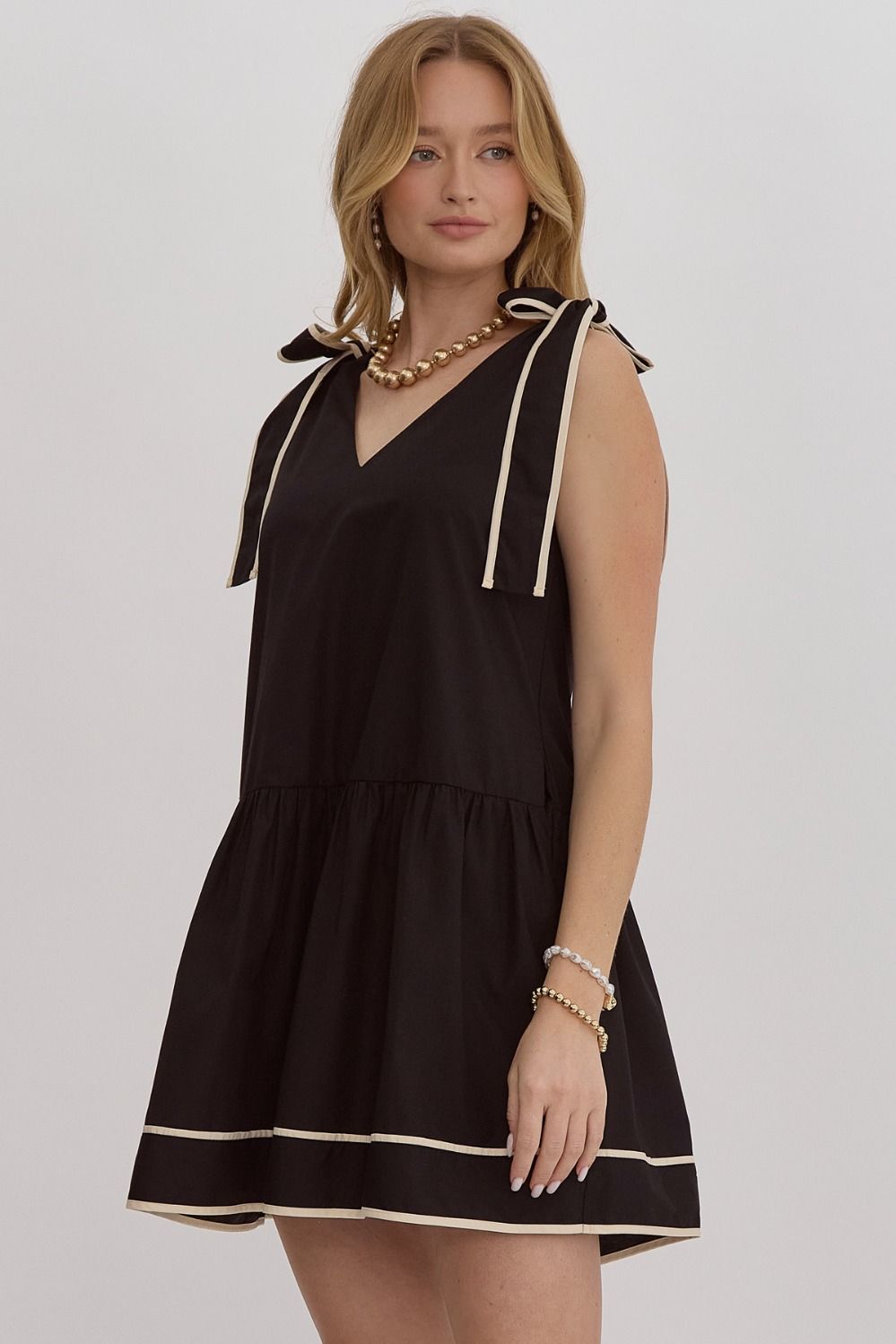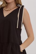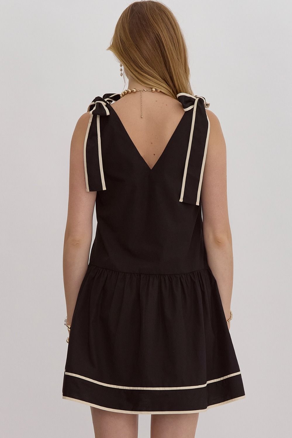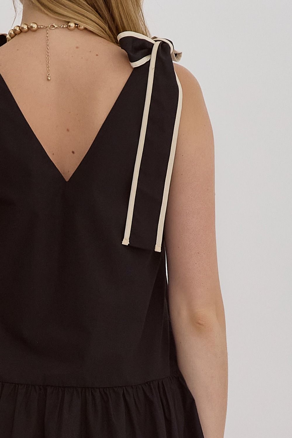 Solid v-neck sleeveless mini dress featuring self tie at shoulders.